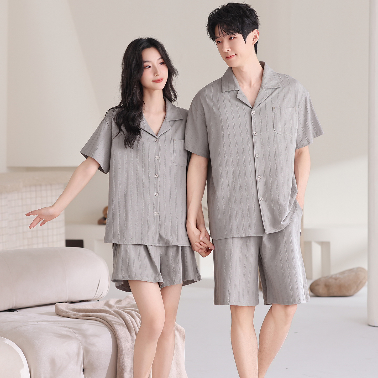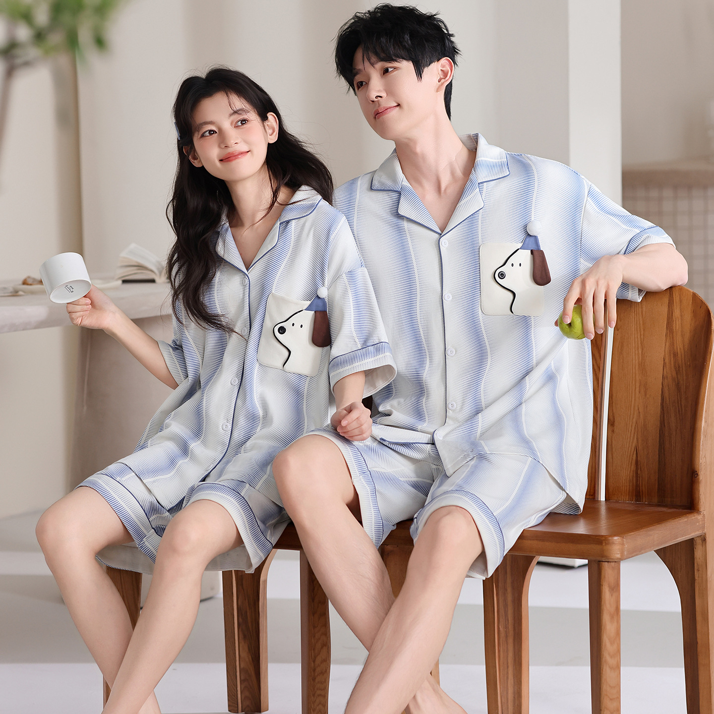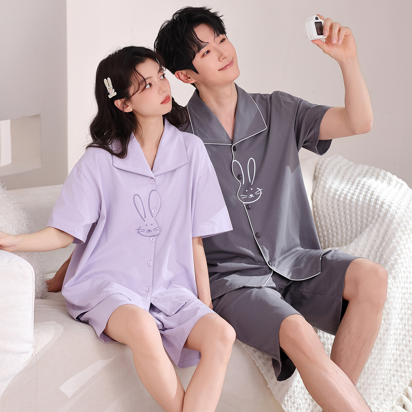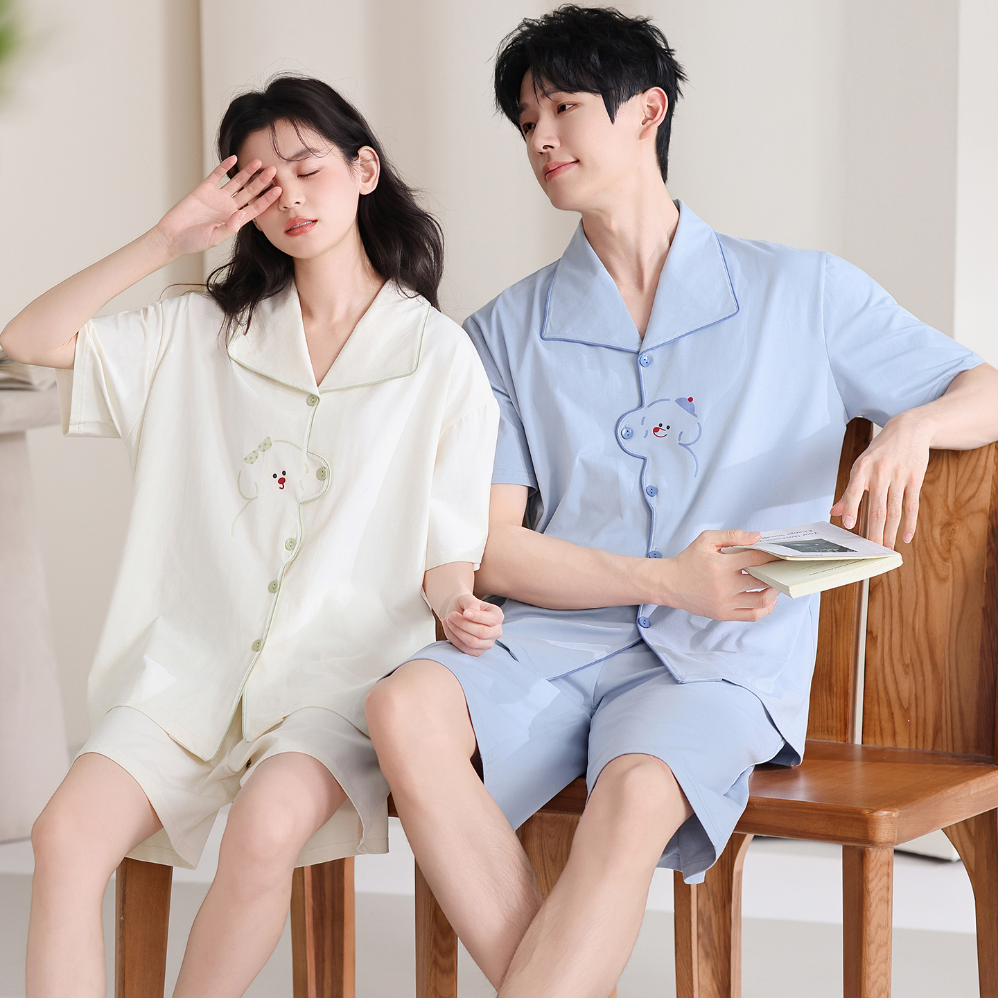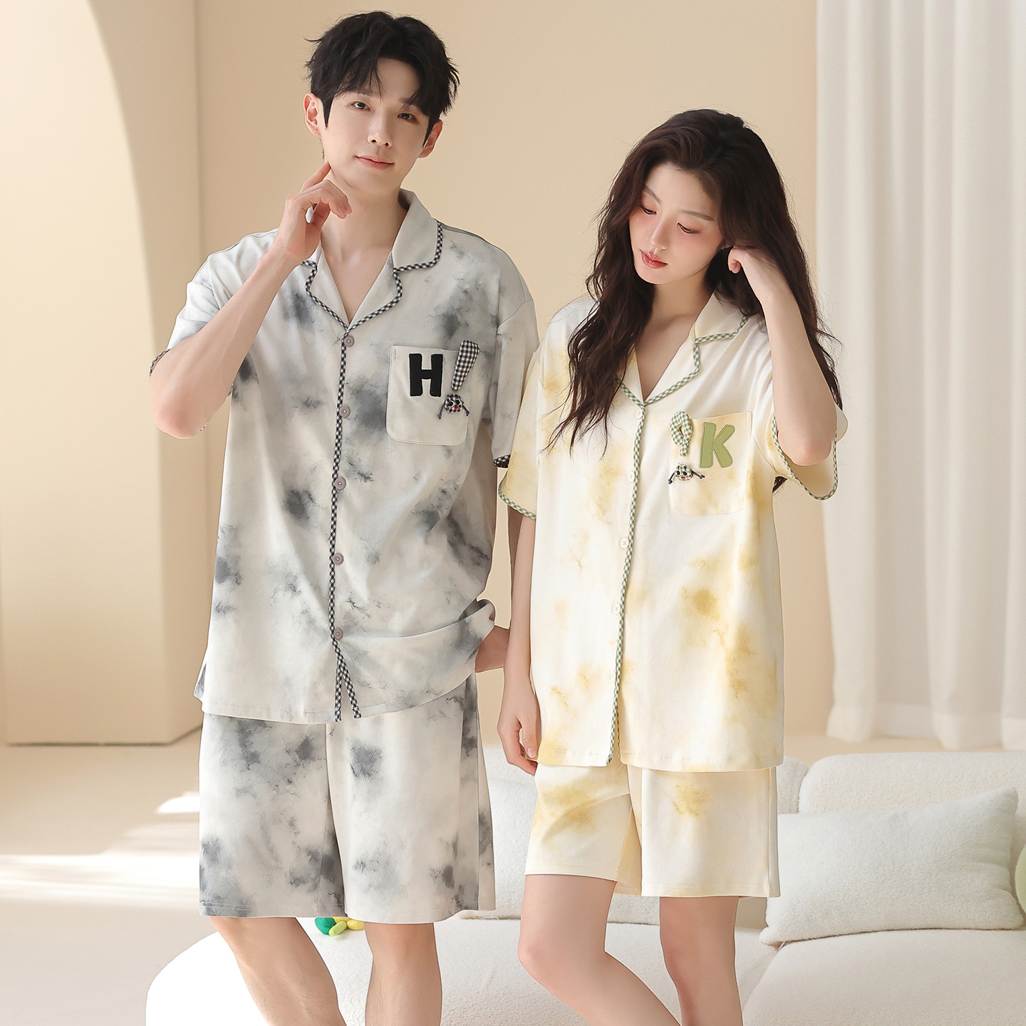 만화 귀여운 퓨어 코튼 옷깃 카디건 커플 파자마 여름 의상 캐주얼 루즈 남성과 여성의 홈 옷스토어 가기