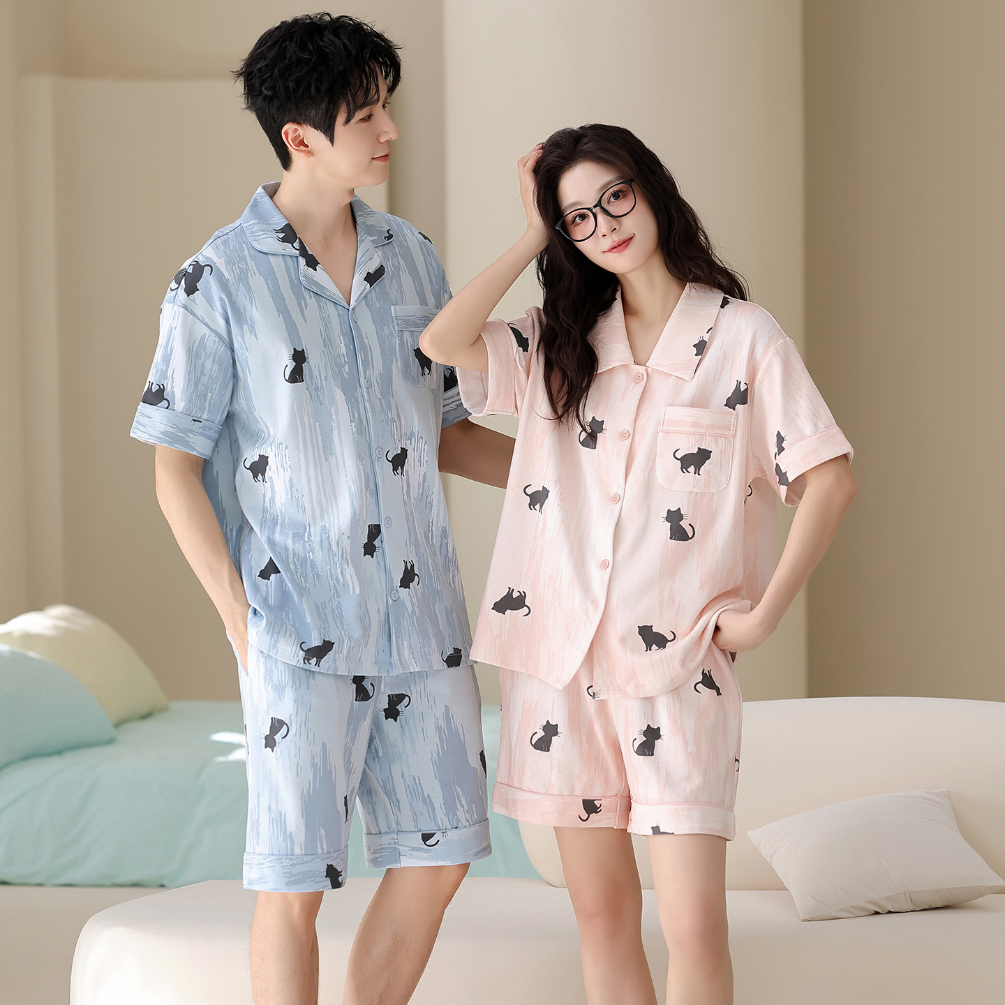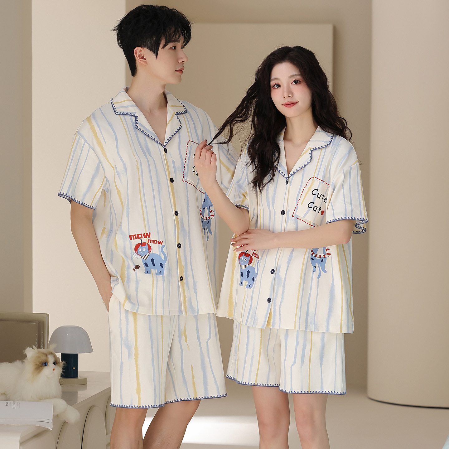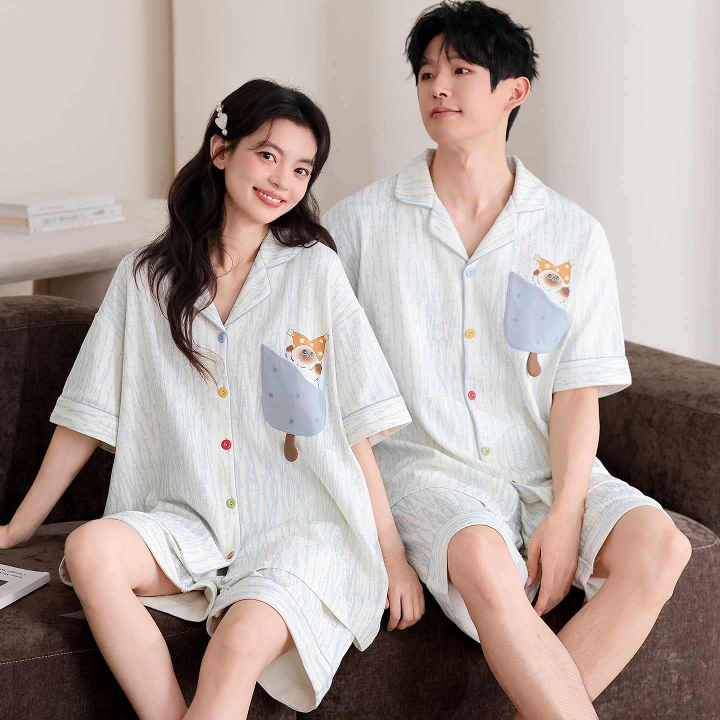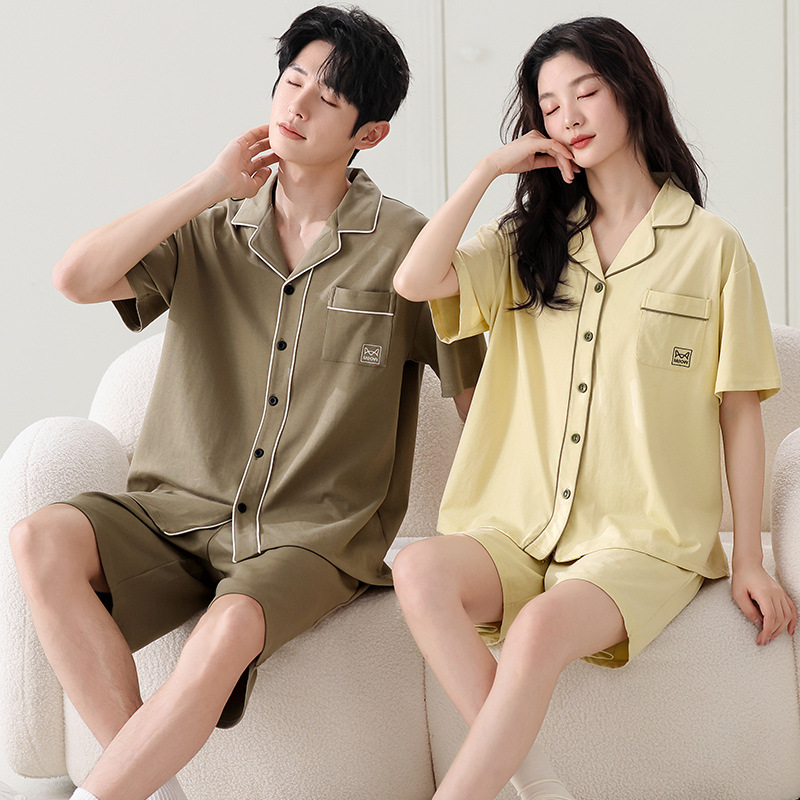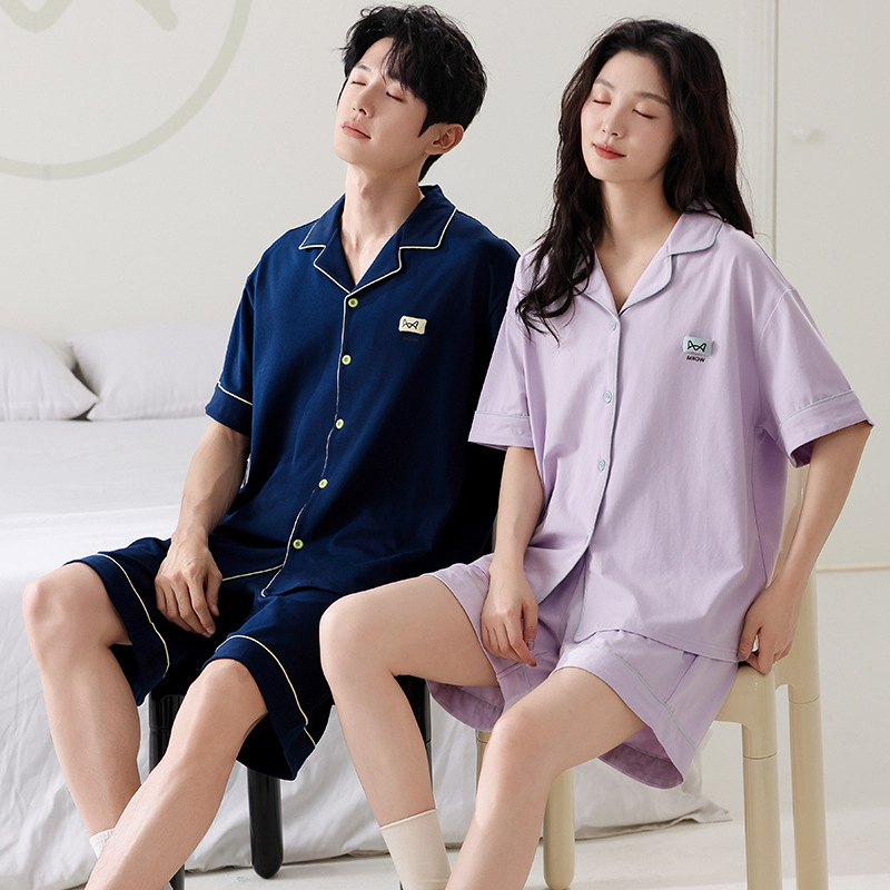 만화 귀여운 퓨어 코튼 옷깃 카디건 커플 파자마 여름 의상 캐주얼 루즈 남성과 여성의 홈 옷