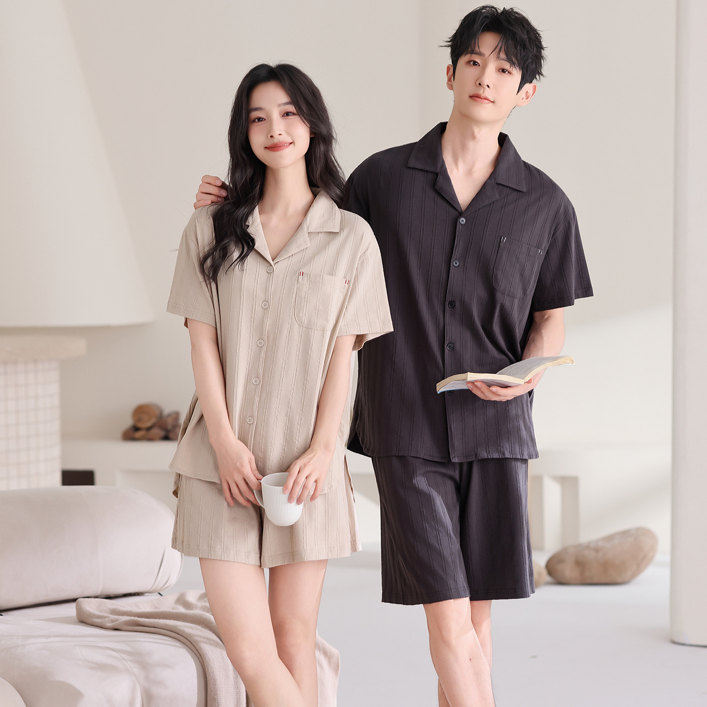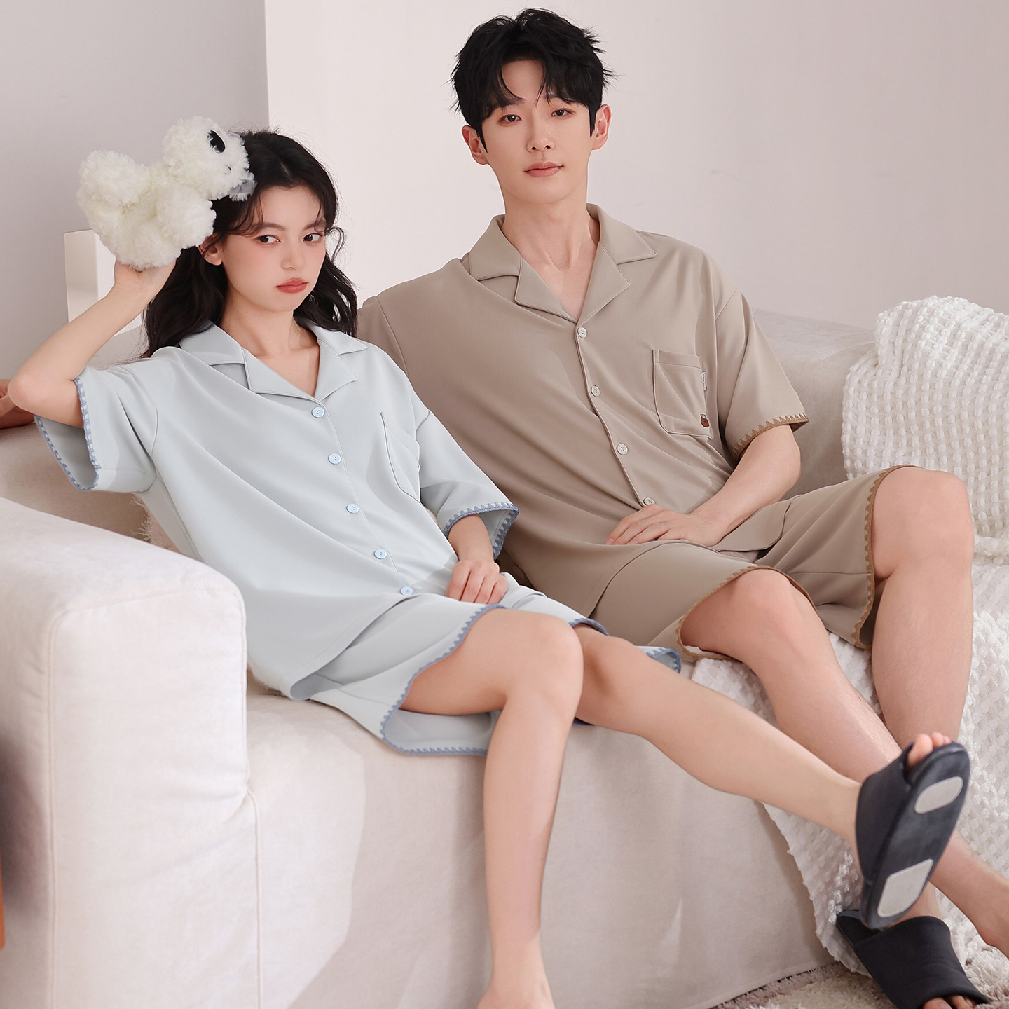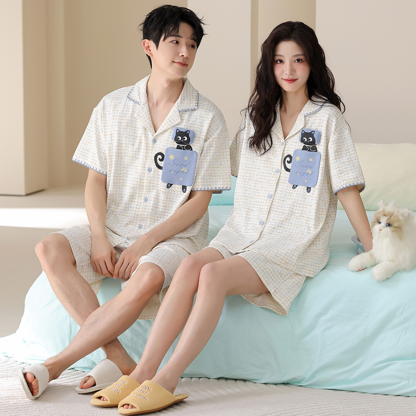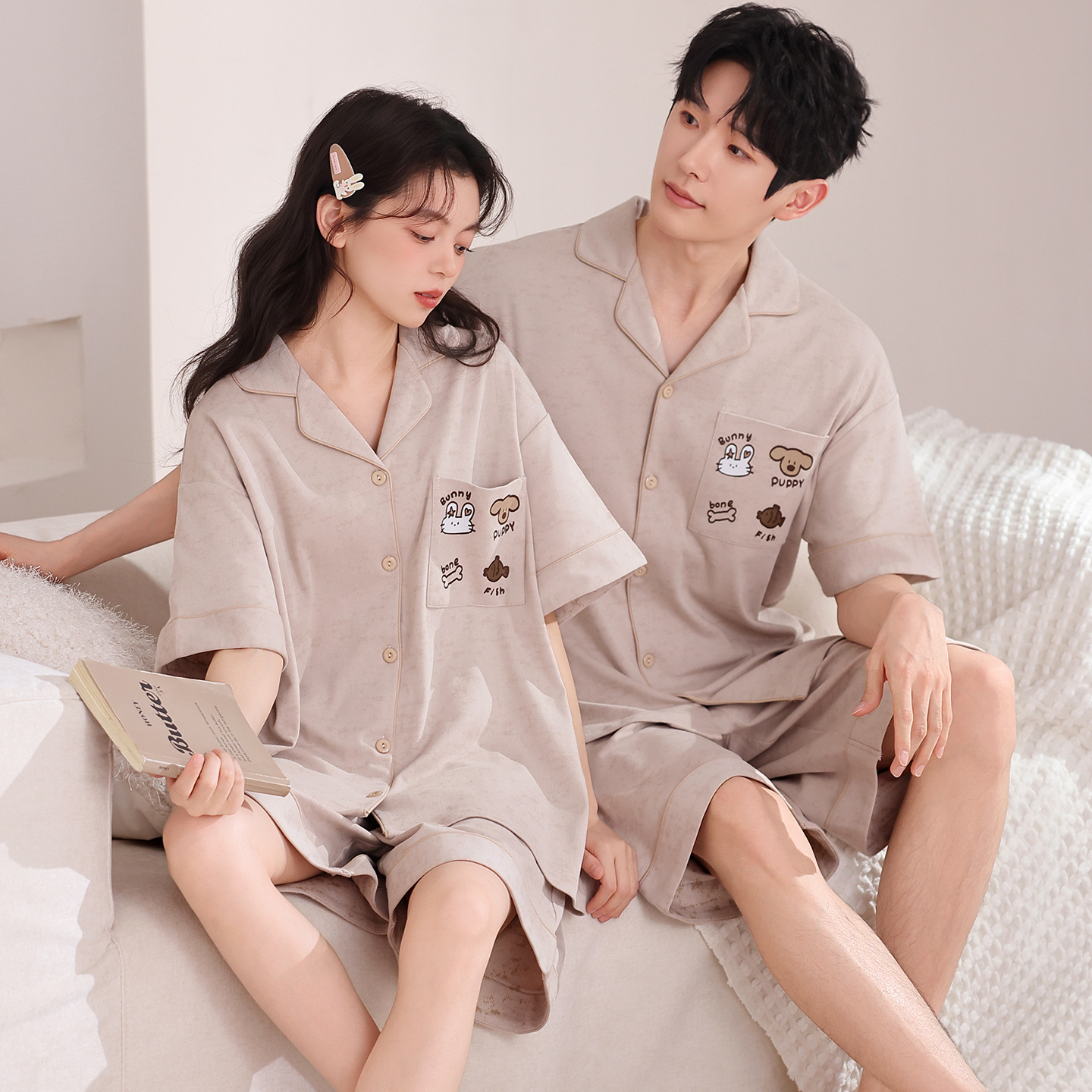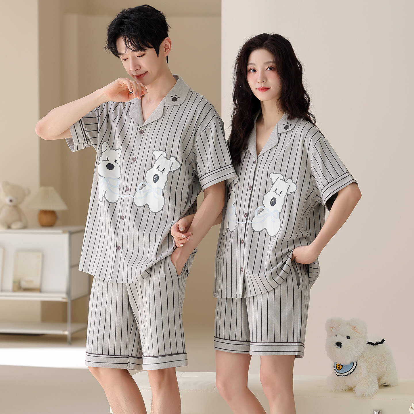 만화 귀여운 퓨어 코튼 옷깃 카디건 커플 파자마 여름 의상 캐주얼 루즈 남성과 여성의 홈 옷