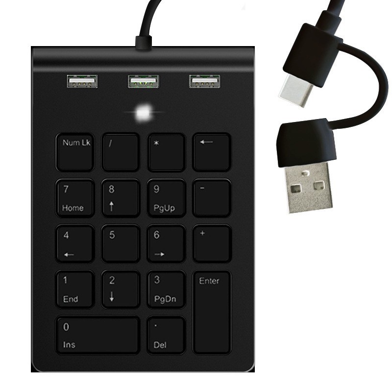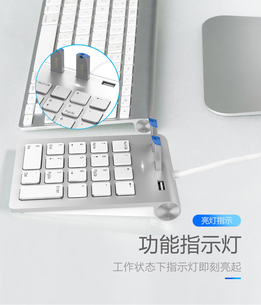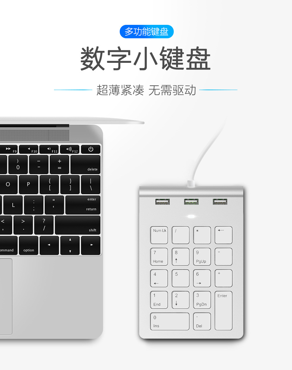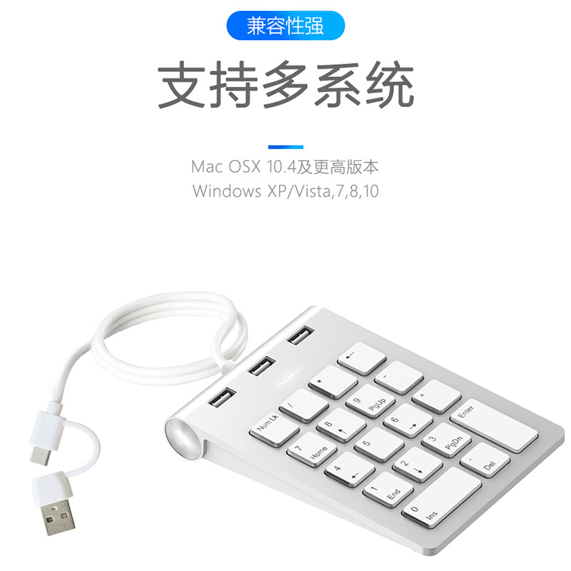 单USB接口、USB+type二合一接口,即插即用,无需驱动;拓展出3个USB接口,可连接鼠标键盘U盘等设备,办公更高效;单独的数字按钮,操作更快更简洁