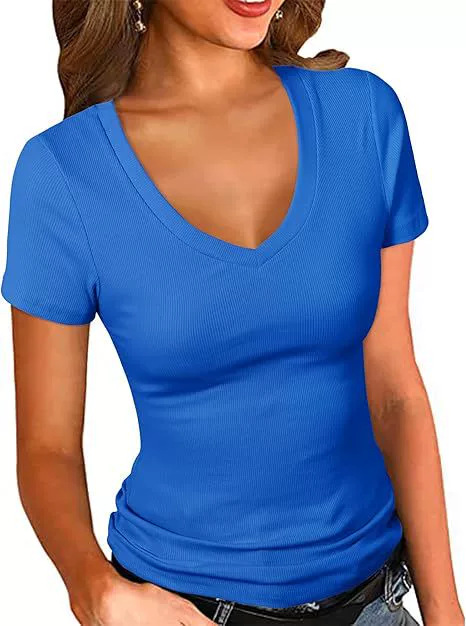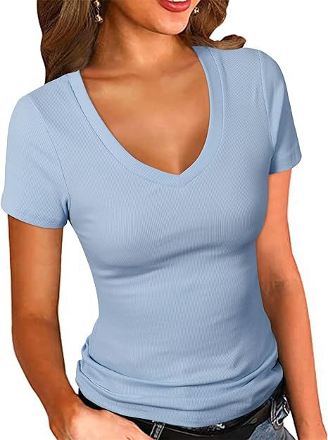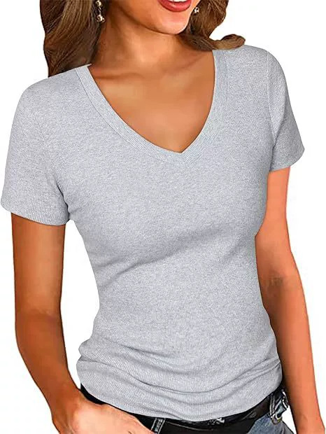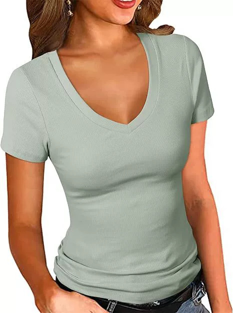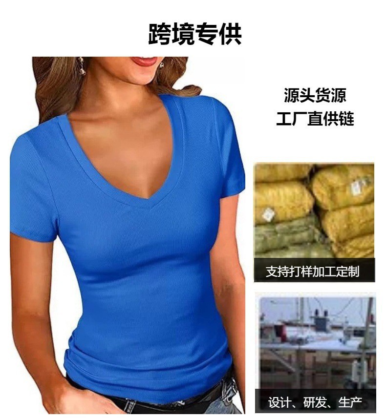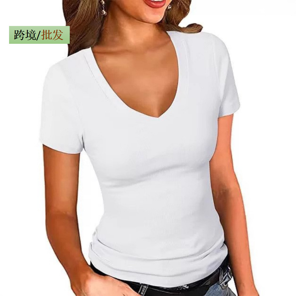2025 여름 신작 아마존 유럽과 미국 국경 간 여성 의류 여성용 섹시한 v 넥 반팔 솔리드 컬러 티셔츠 탑스토어 가기