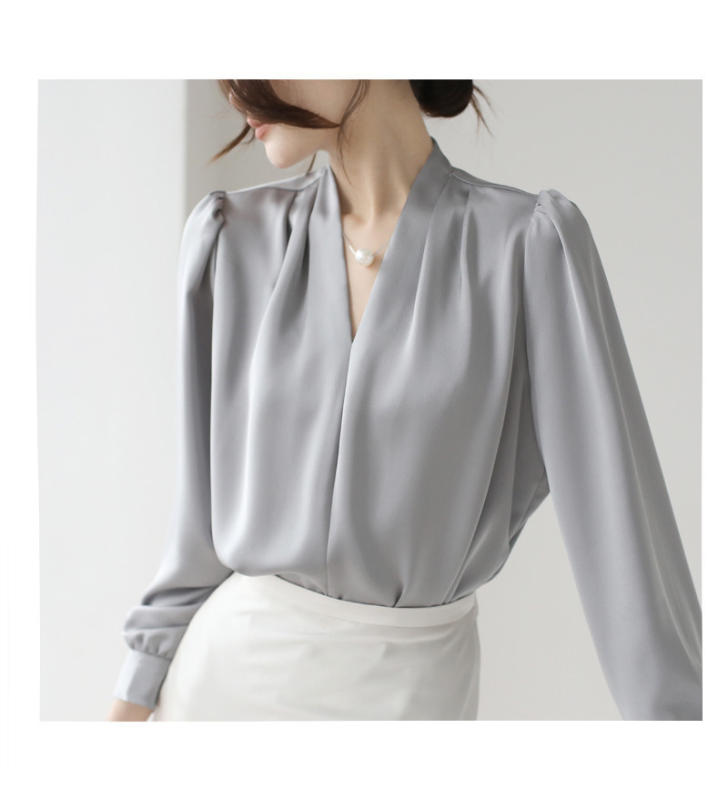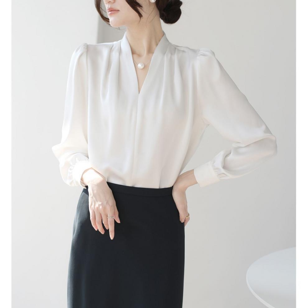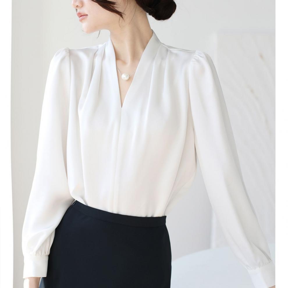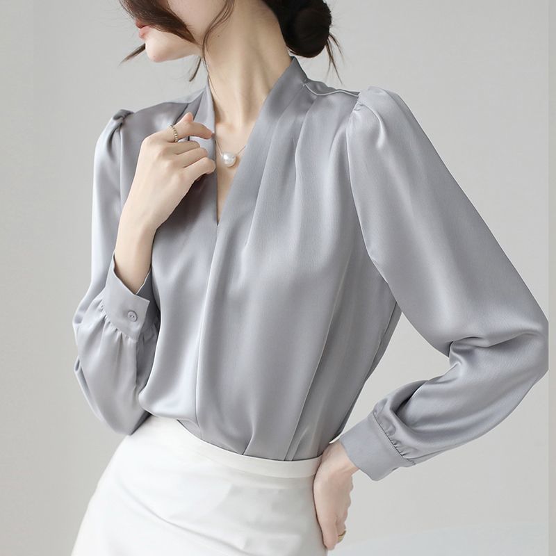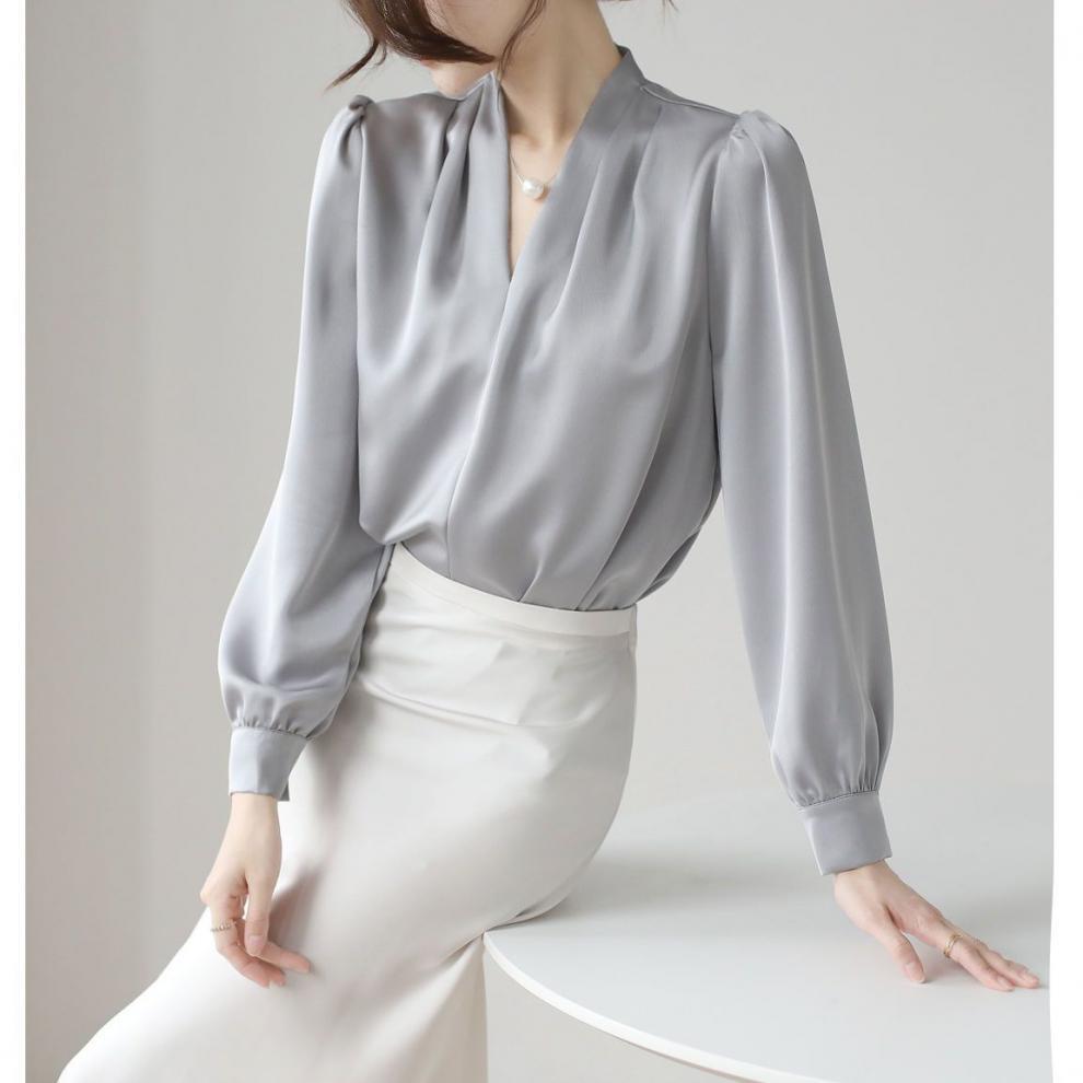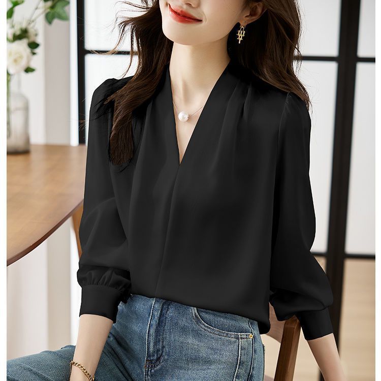 2025 우수한 간단한 쉬폰 셔츠 여성의 봄과 가을 우아한 V-넥 라이트 성숙한 통근 새틴 탑