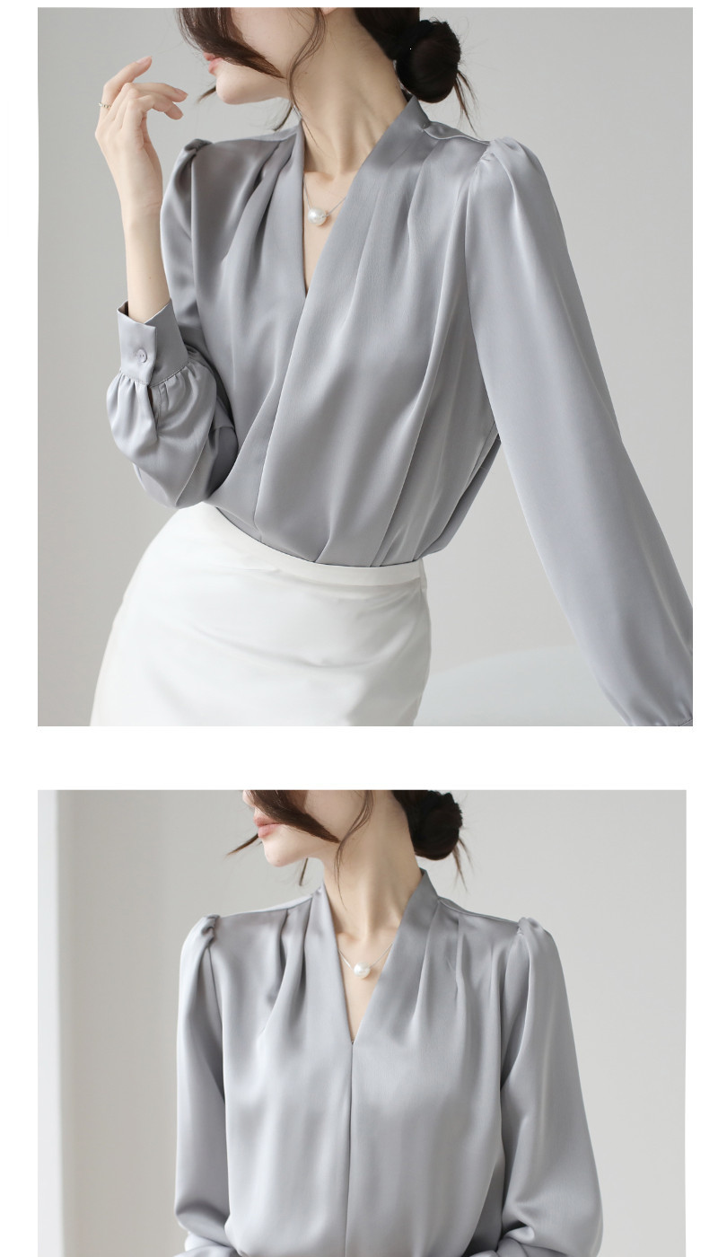 2025 우수한 간단한 쉬폰 셔츠 여성의 봄과 가을 우아한 V-넥 라이트 성숙한 통근 새틴 탑스토어 가기