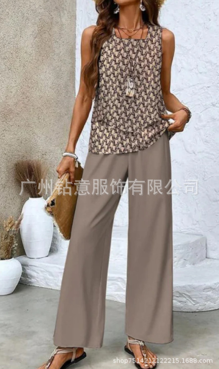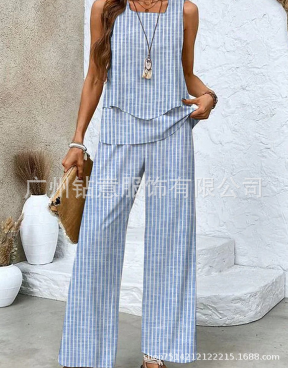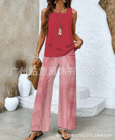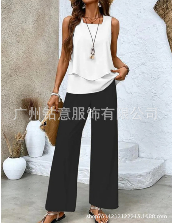 2025 새로운 재고 국경 간 대외 무역 유럽과 미국 여성 의류 폭발 세트 민소매 더블 레이어 조끼 재킷 바지 세트