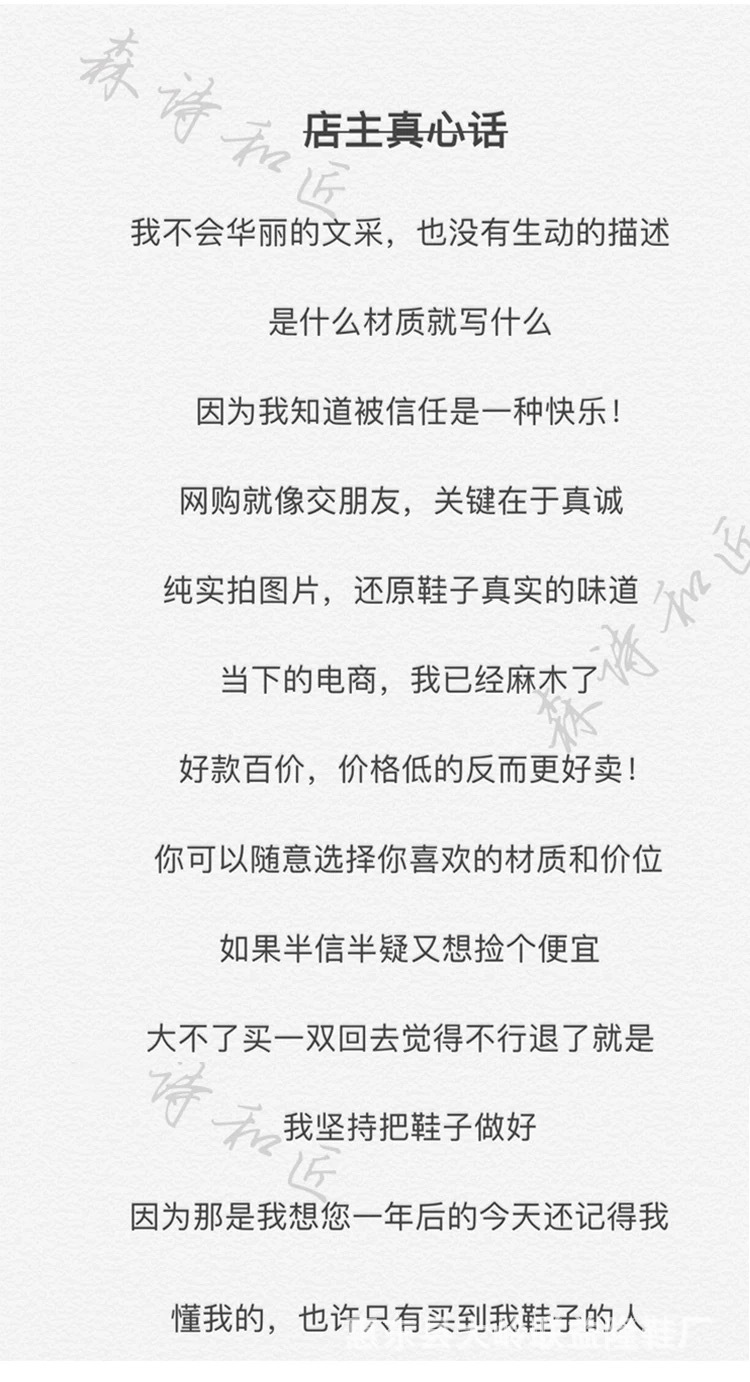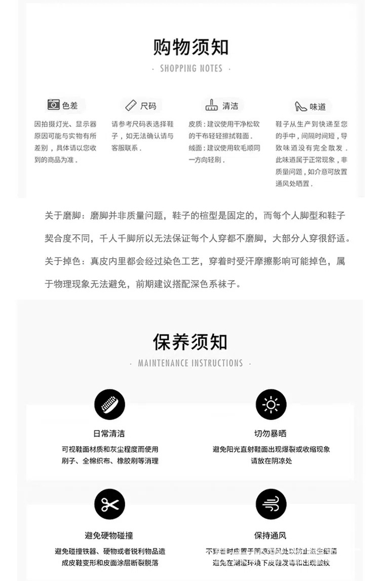 【关于质量】断底、脱胶、破损、严重污点由我们负责处理。小线头、小污点、微色差、微胶水气味均非质量问题