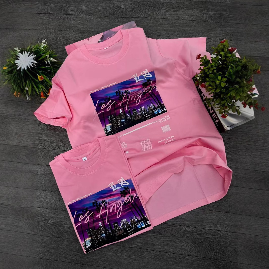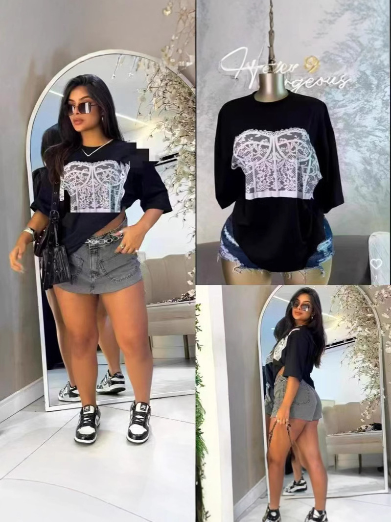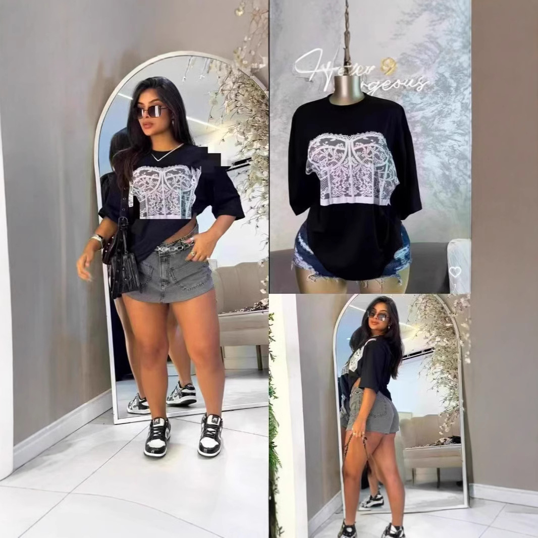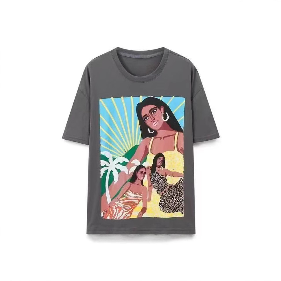 300 그램의 대외 무역 도매 2025 유럽과 미국 스타일의 여성 다재다능한 틈새 코튼 편안한 프린트 라운드 넥 짧은 소매 티셔츠