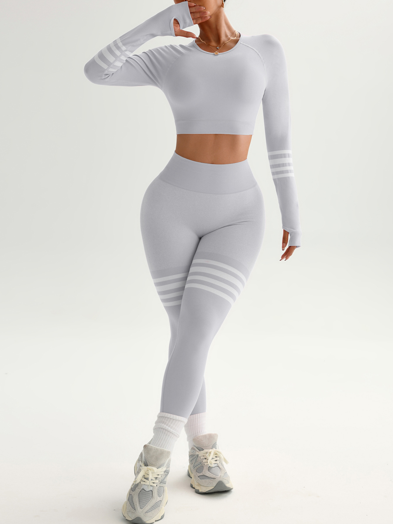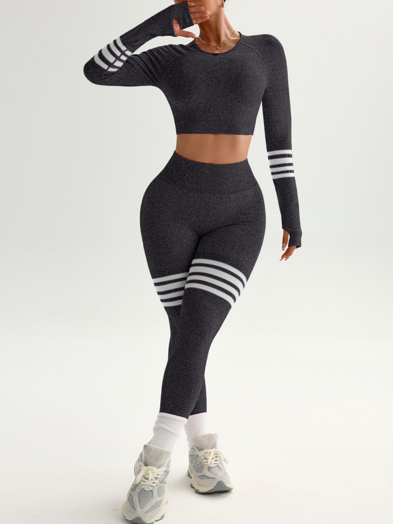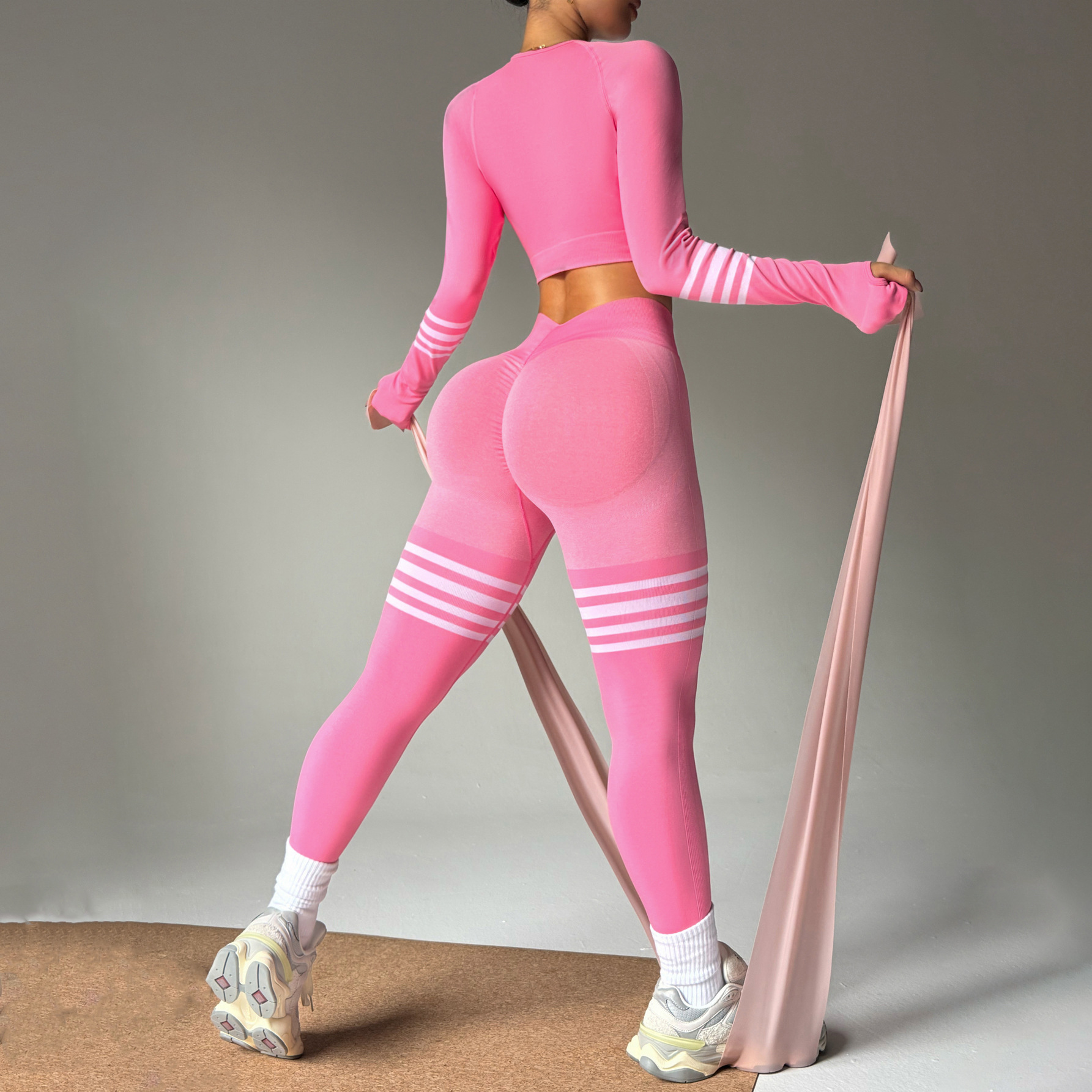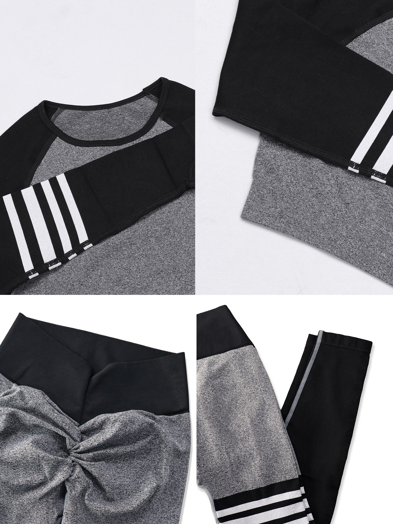 여성용 스팟 크로스보더 요가복 세트, 스트라이프 복부 조절 운동복, 긴팔 상의, 전문 러닝 피트니스복스토어 가기
