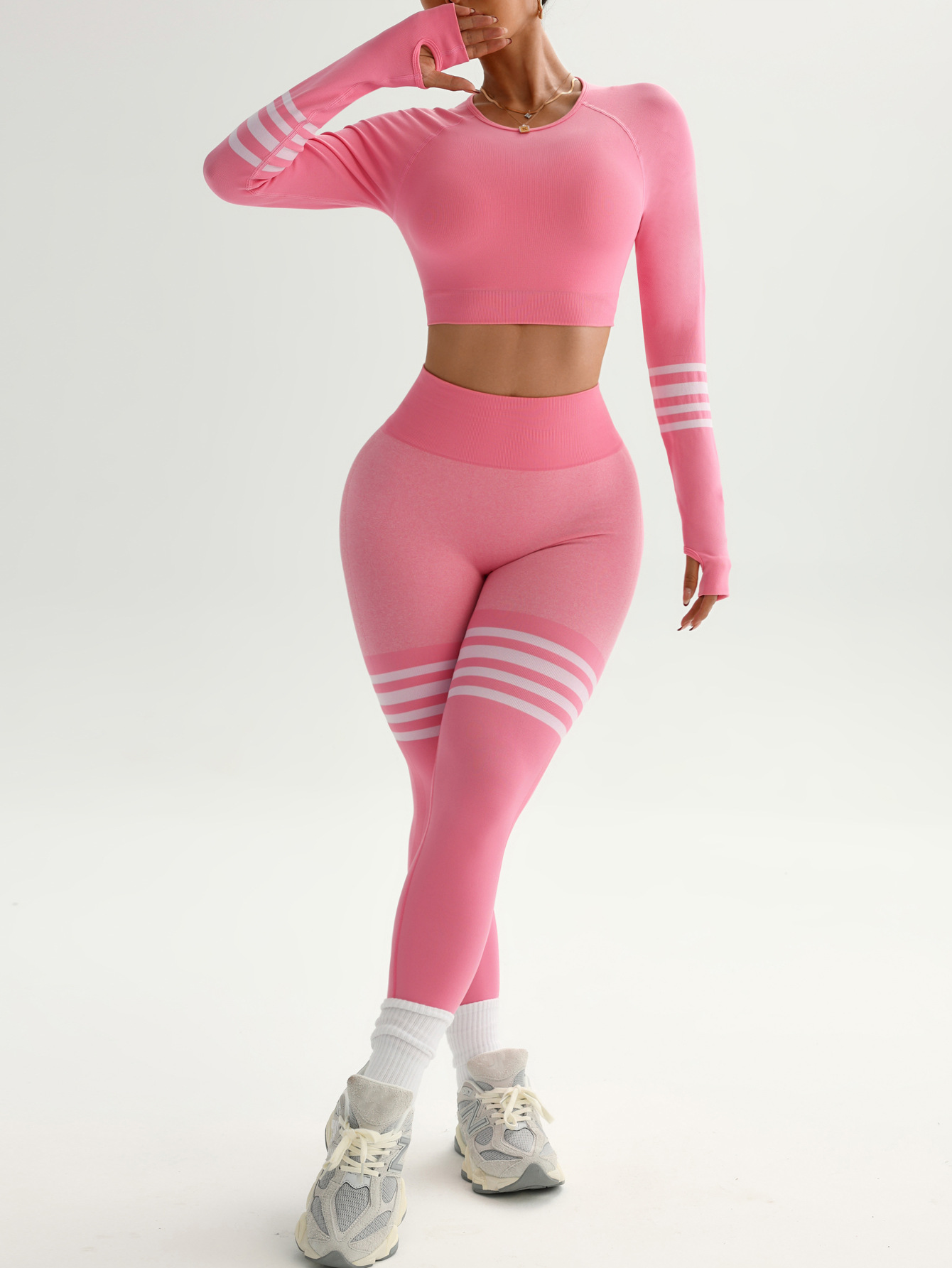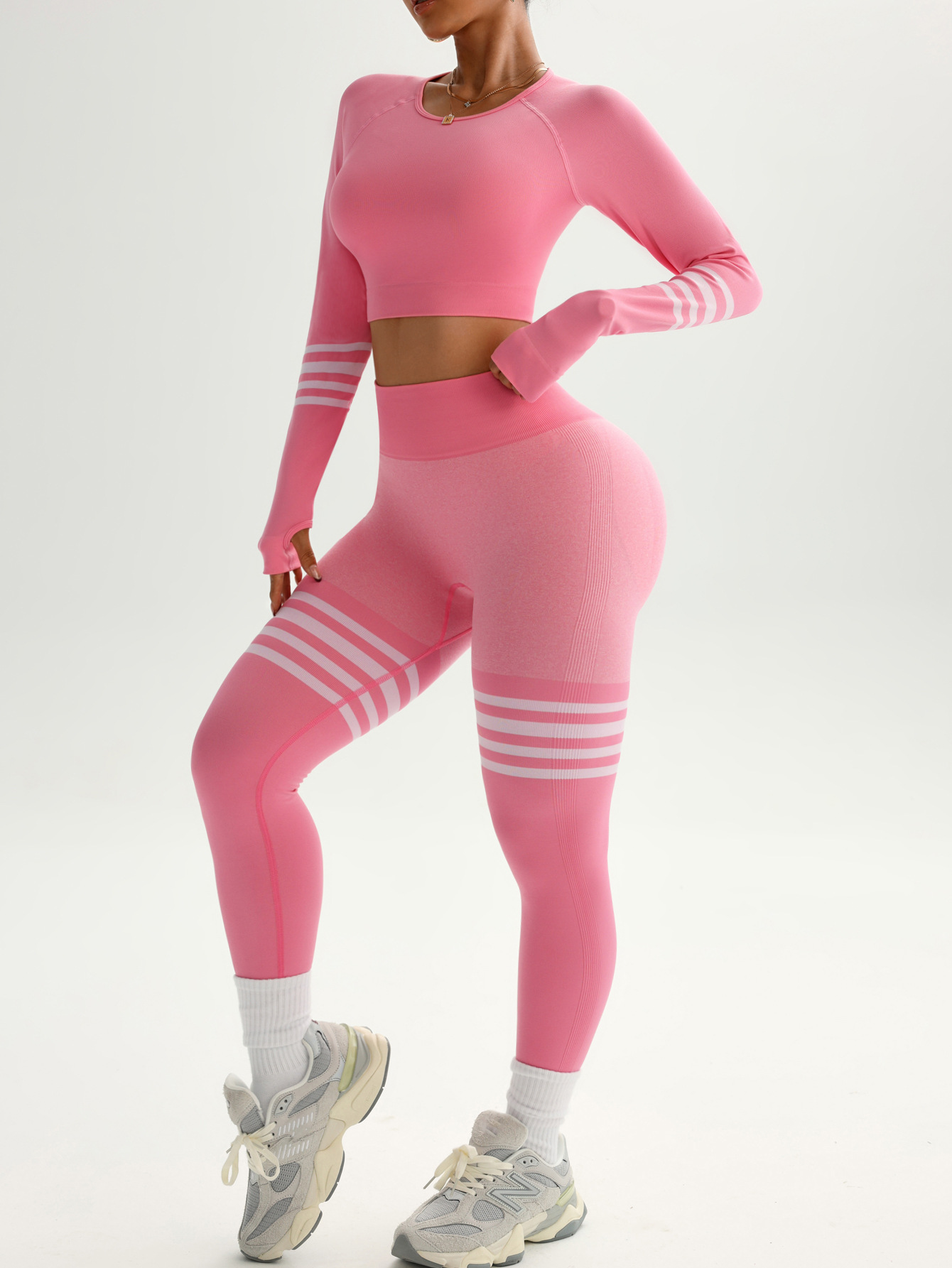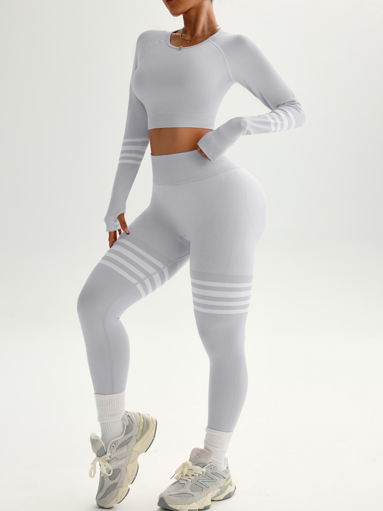 여성용 스팟 크로스보더 요가복 세트, 스트라이프 복부 조절 운동복, 긴팔 상의, 전문 러닝 피트니스복스토어 가기