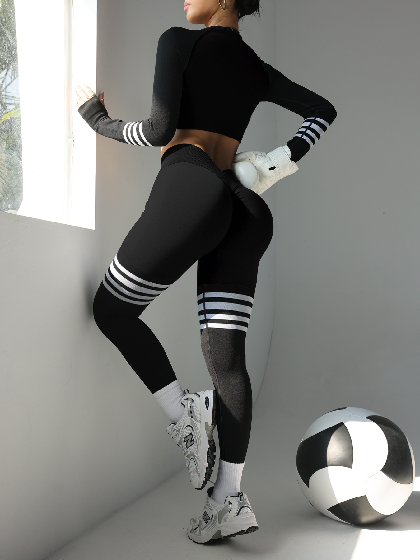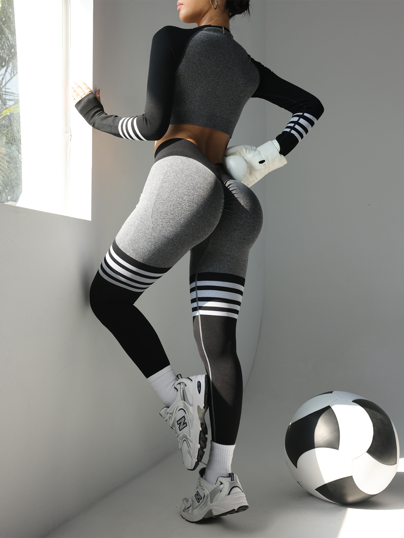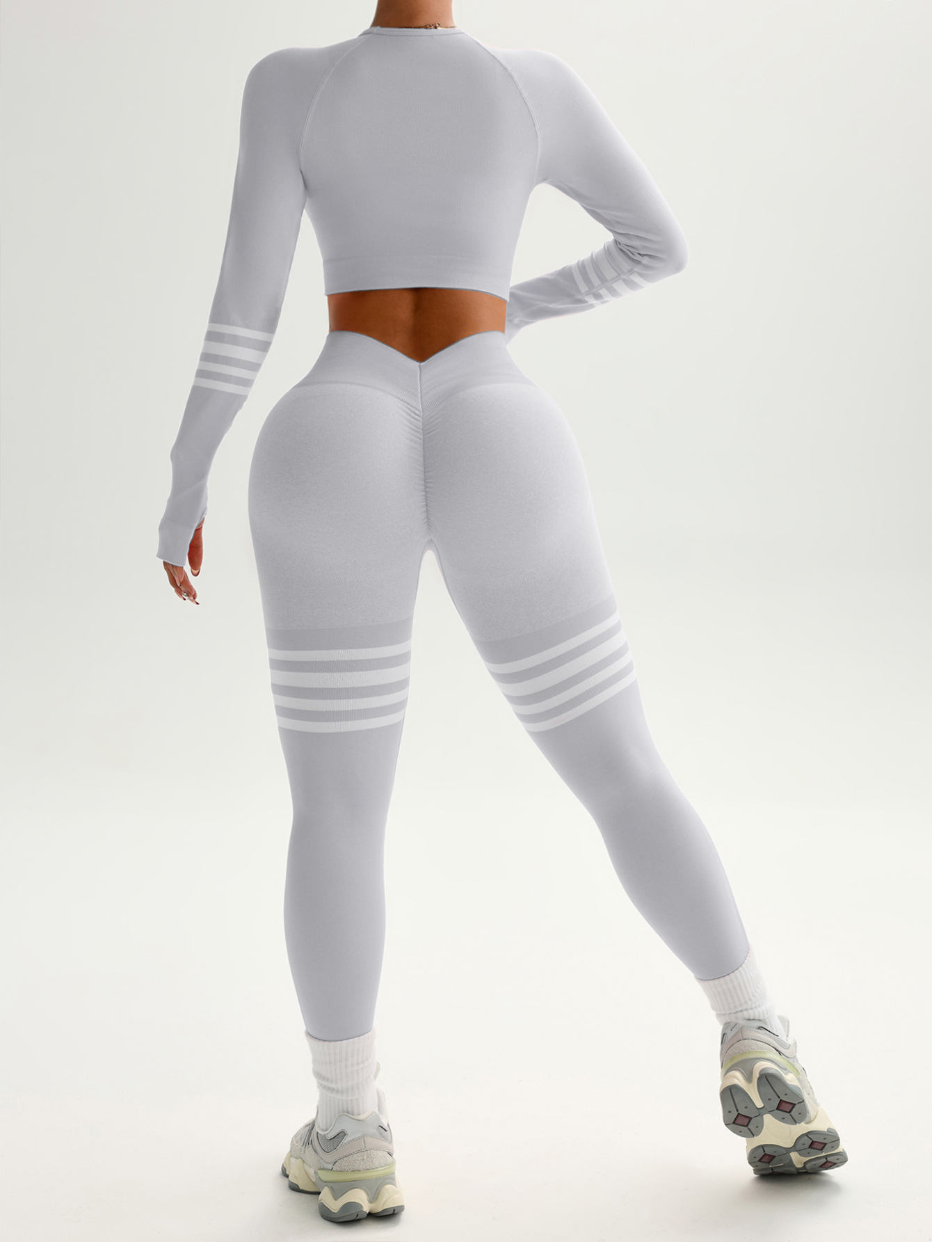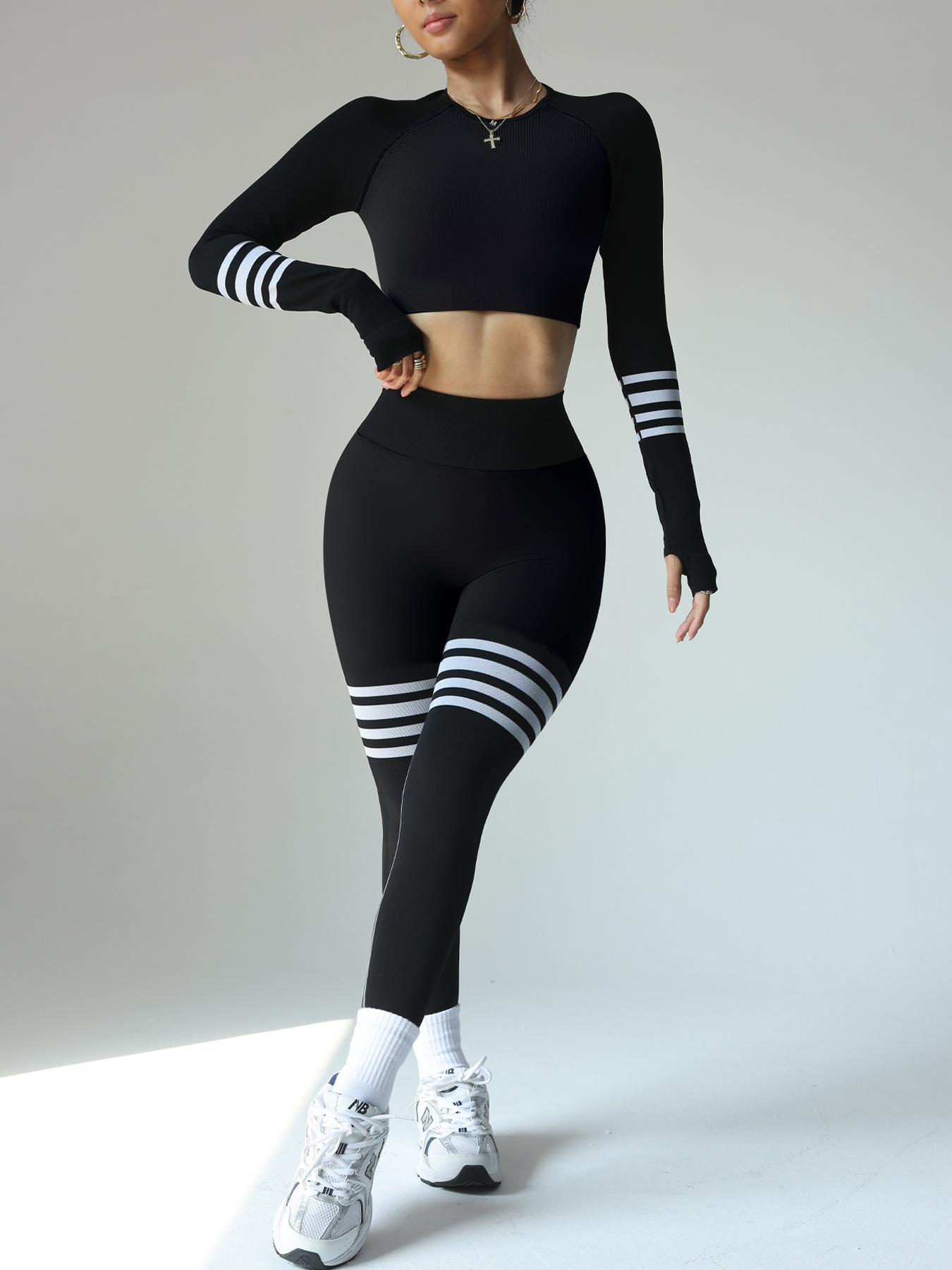 여성용 스팟 크로스보더 요가복 세트, 스트라이프 복부 조절 운동복, 긴팔 상의, 전문 러닝 피트니스복스토어 가기