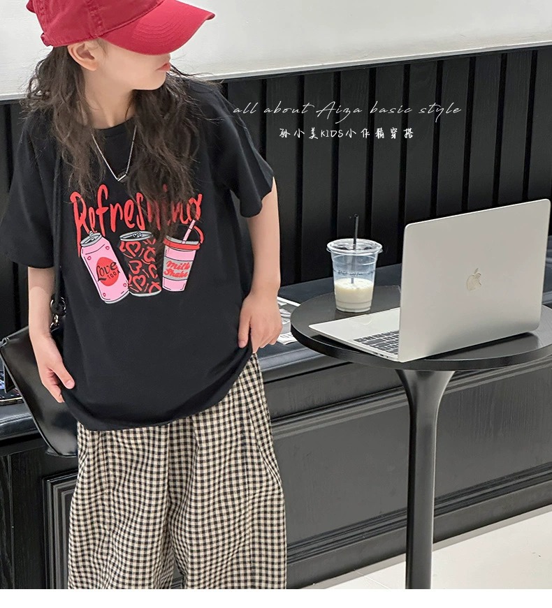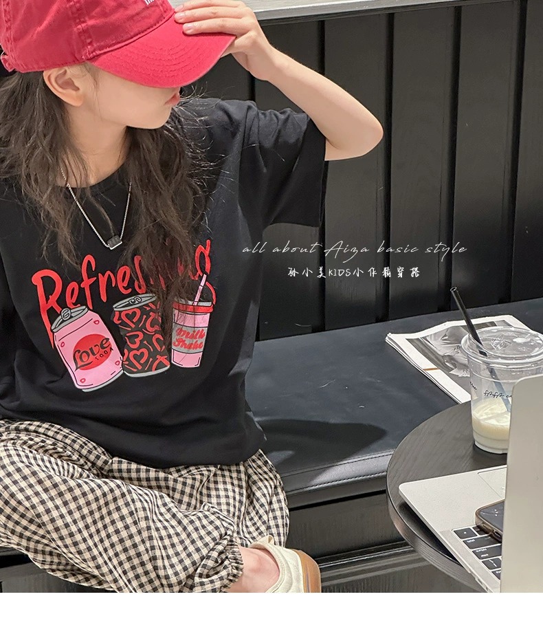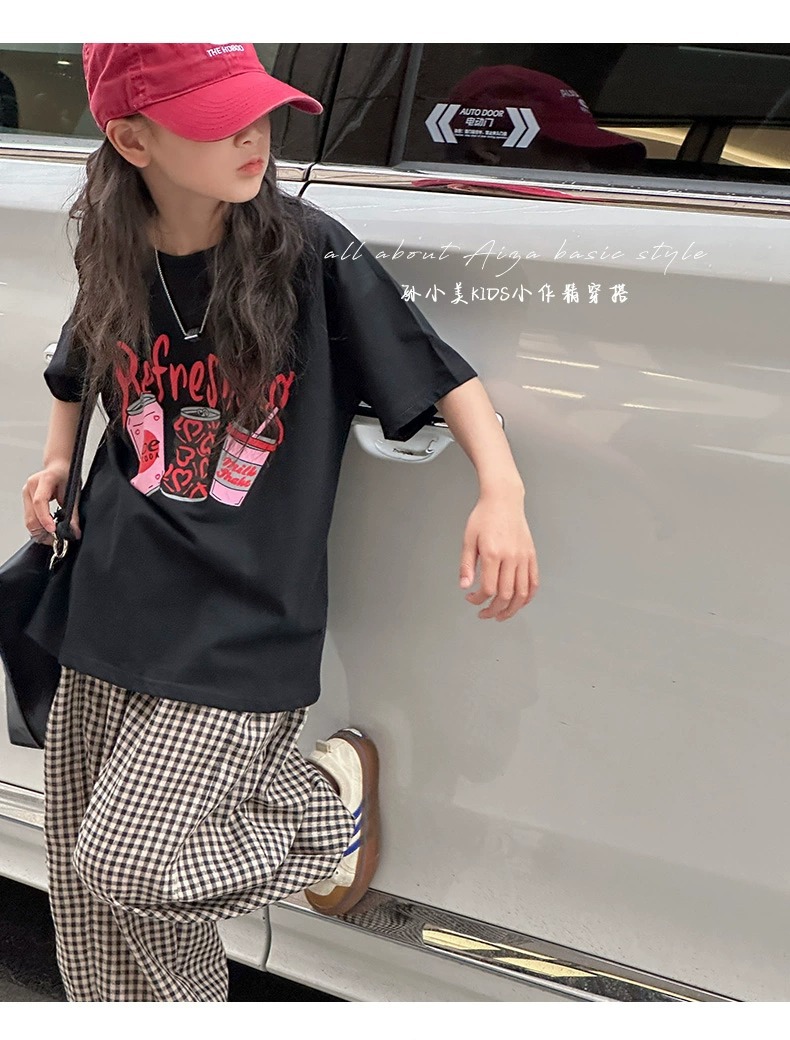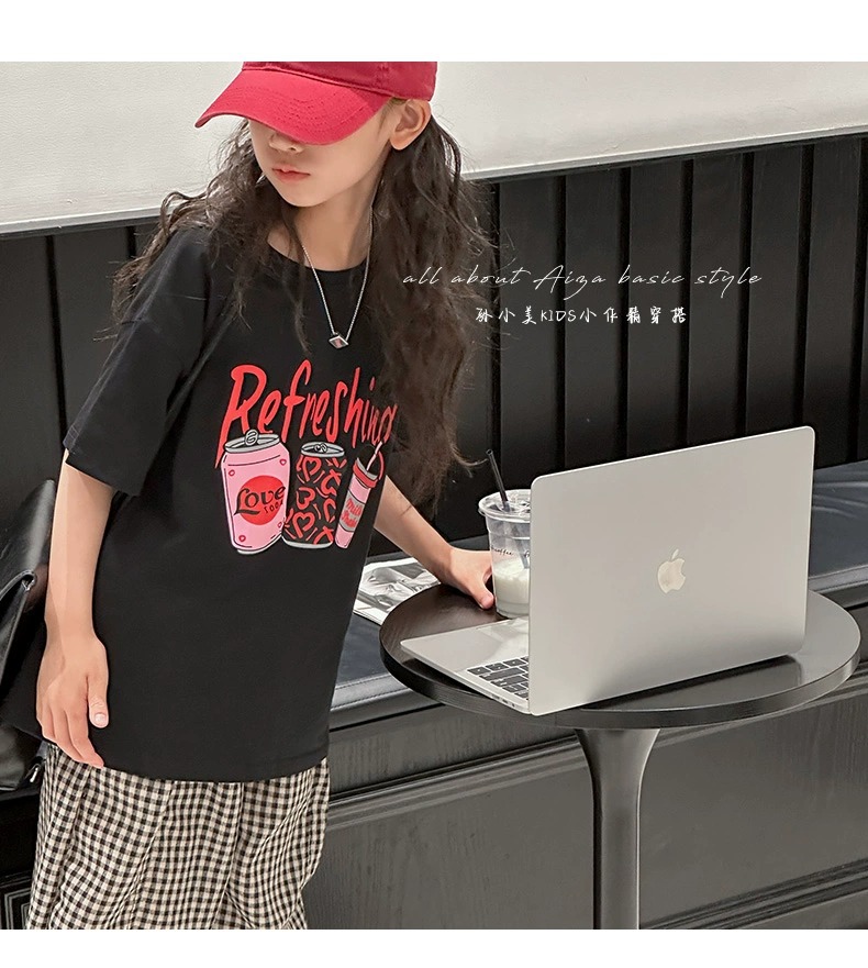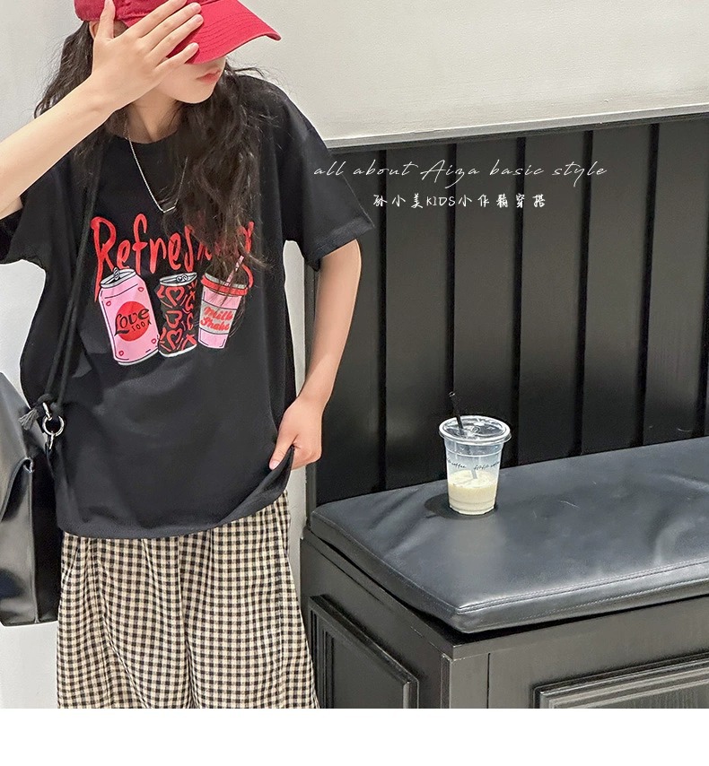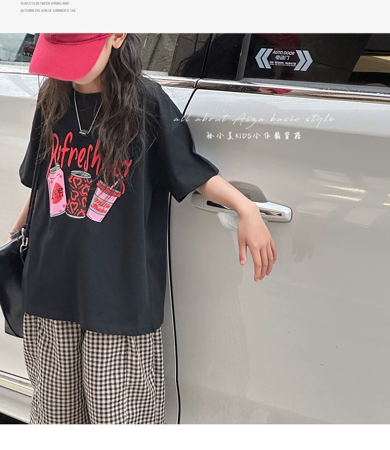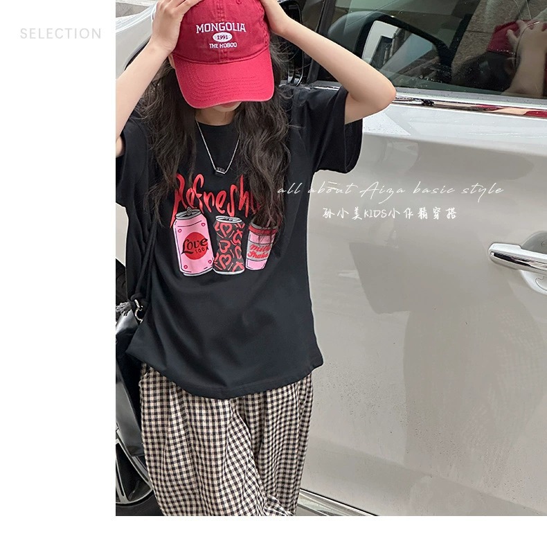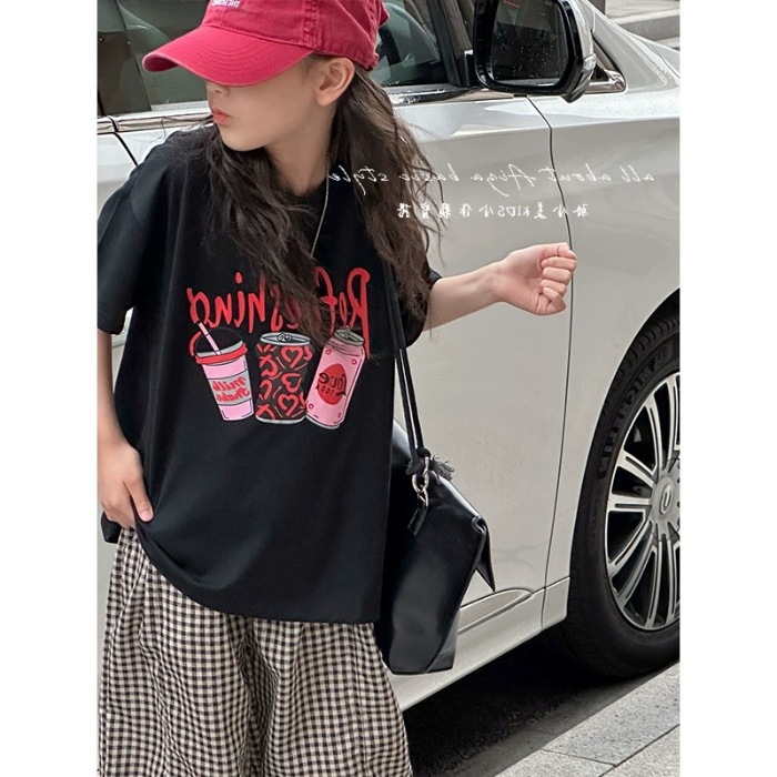 한국 아동복 여아 반팔 티셔츠 아동 상의 2026 여름 신상 중대형 아동용 티셔츠 루즈핏 블랙 트렌디 티셔츠