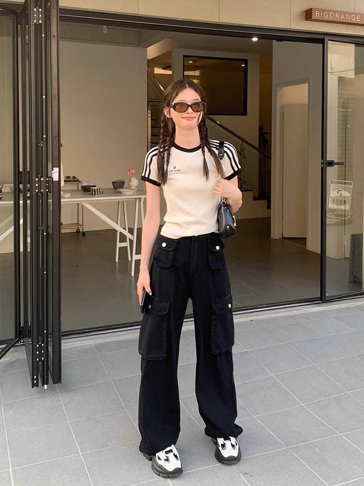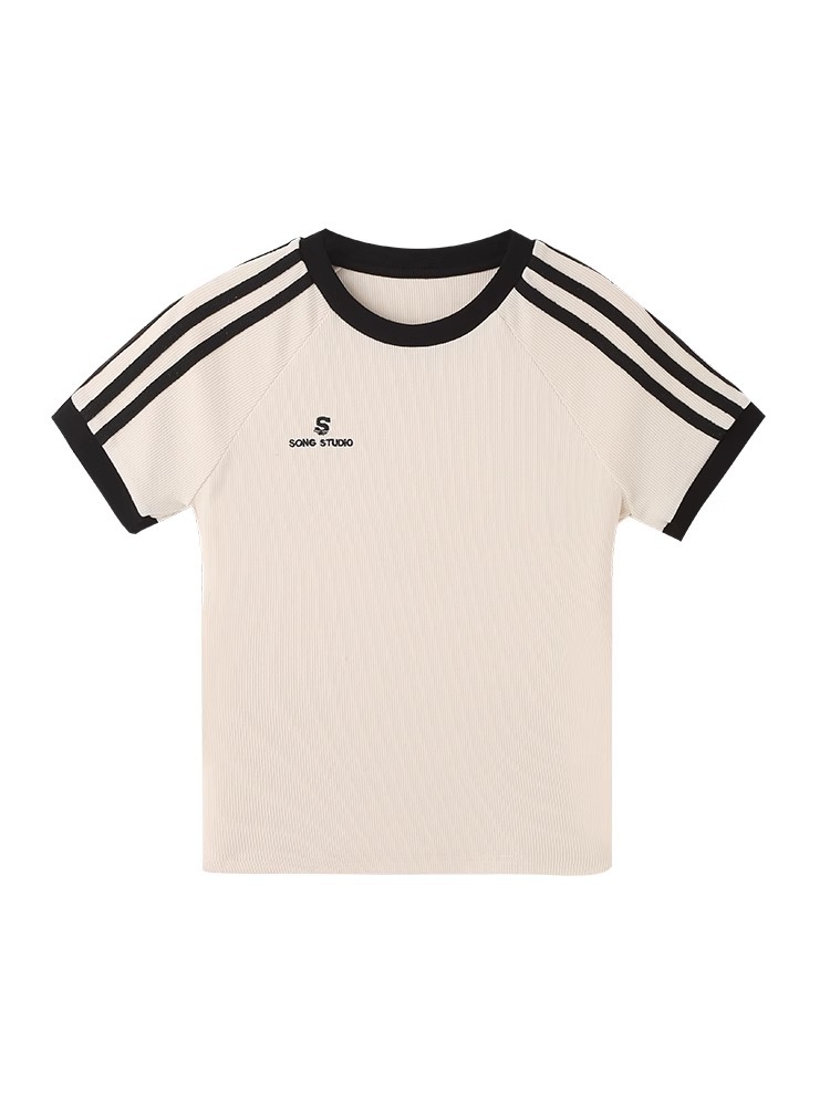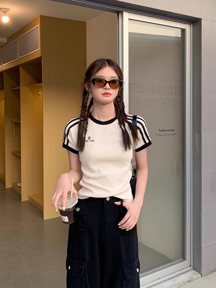 새로운 스타일 줄무늬 어깨 반팔 티셔츠 여성 여름 원피스 디자인 핫 걸스 슬림 핏 슬림 핏 화이트 티셔츠 쇼트 탑 여성스토어 가기
