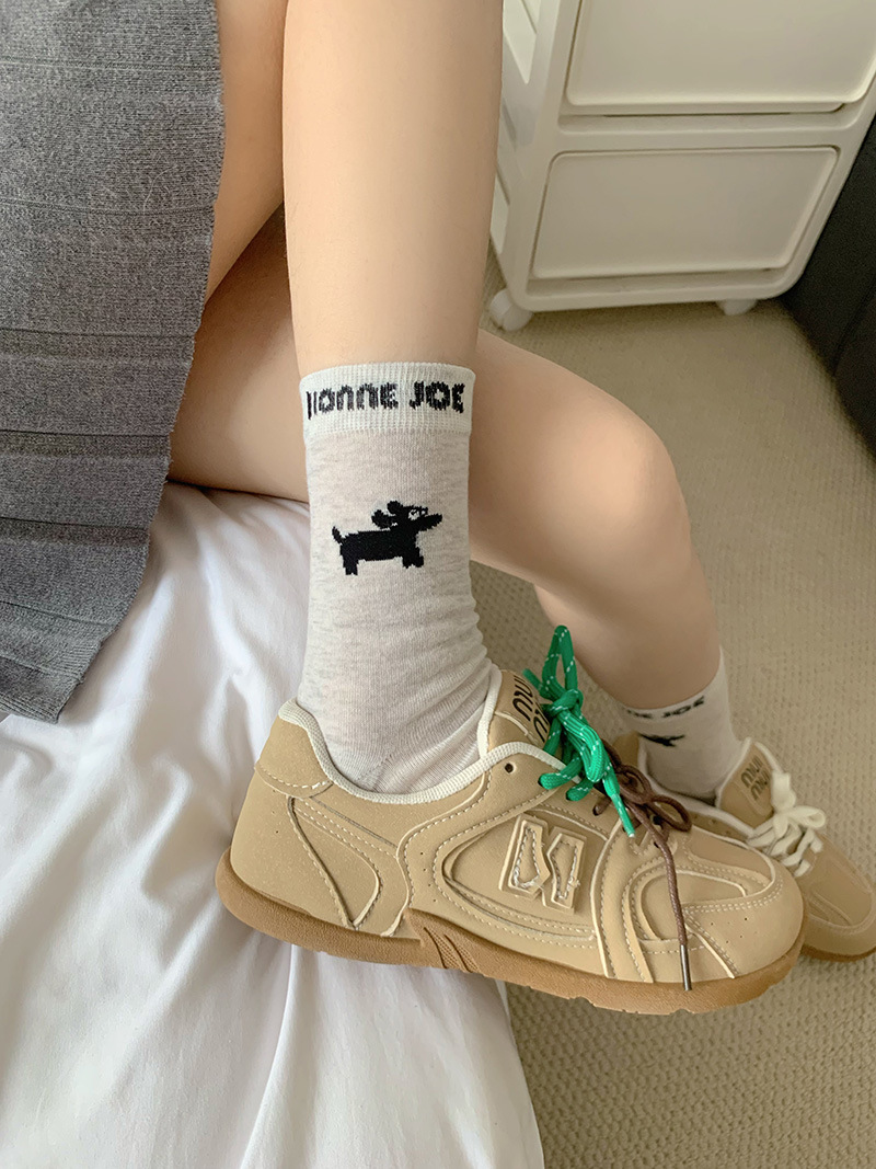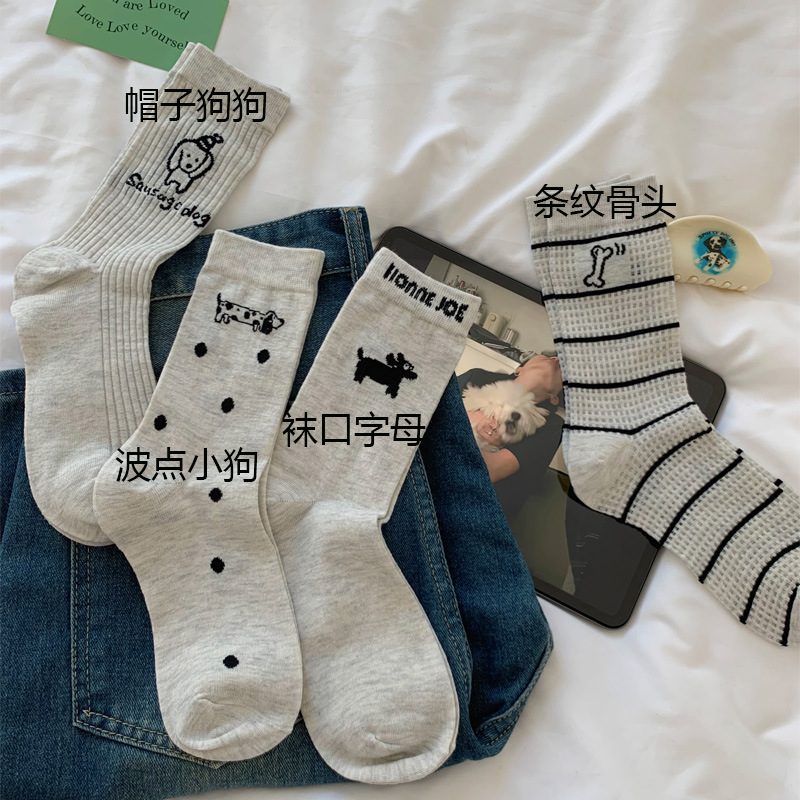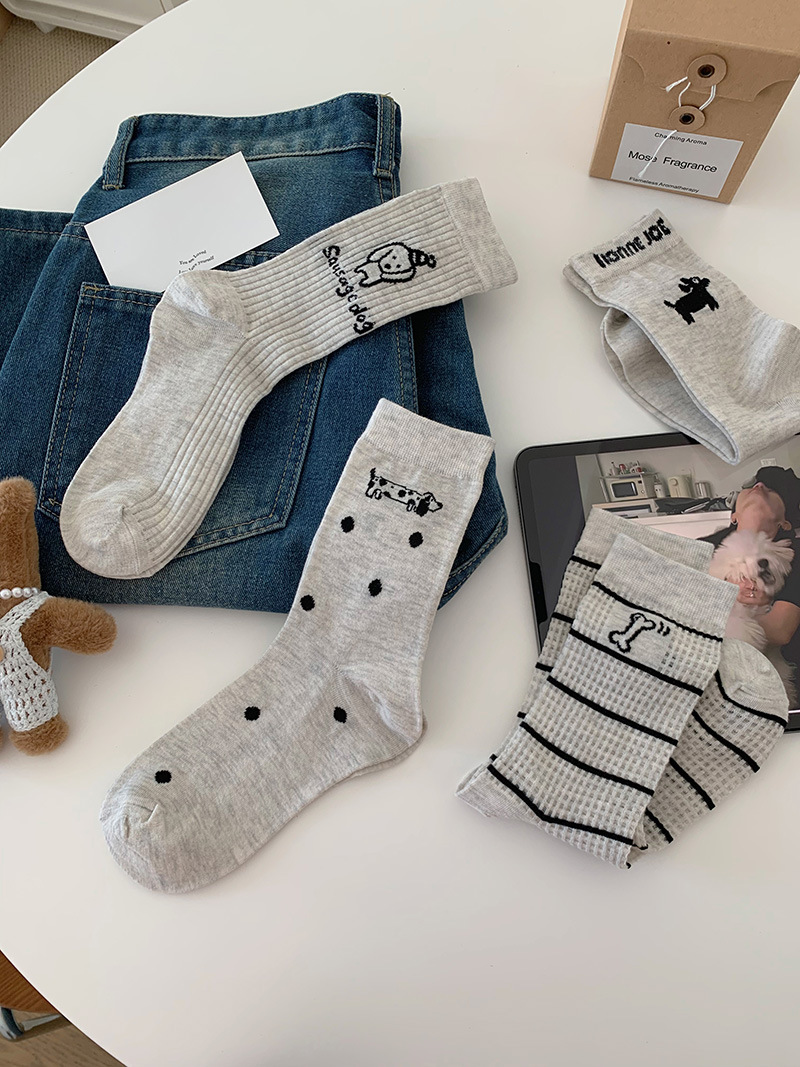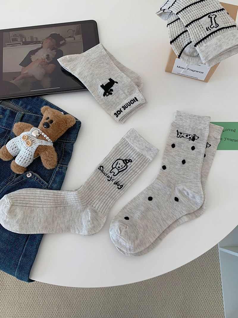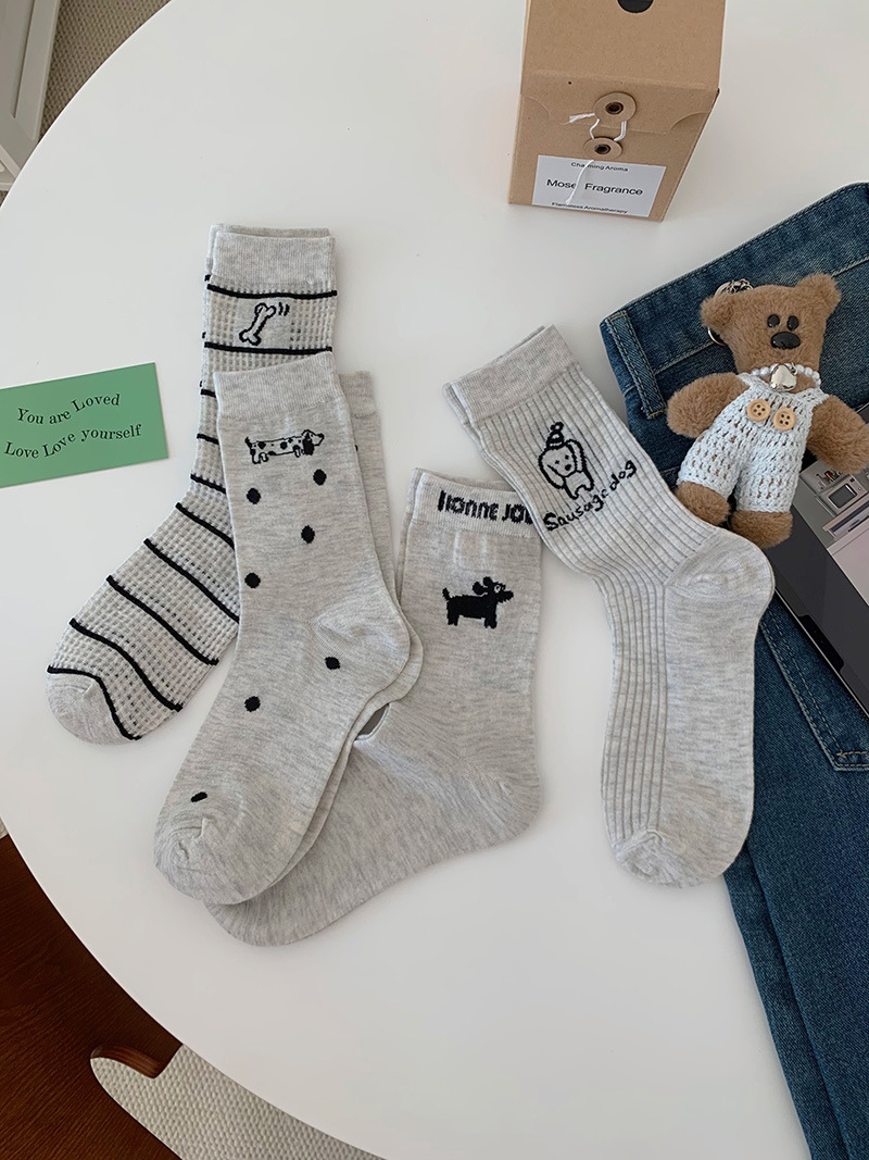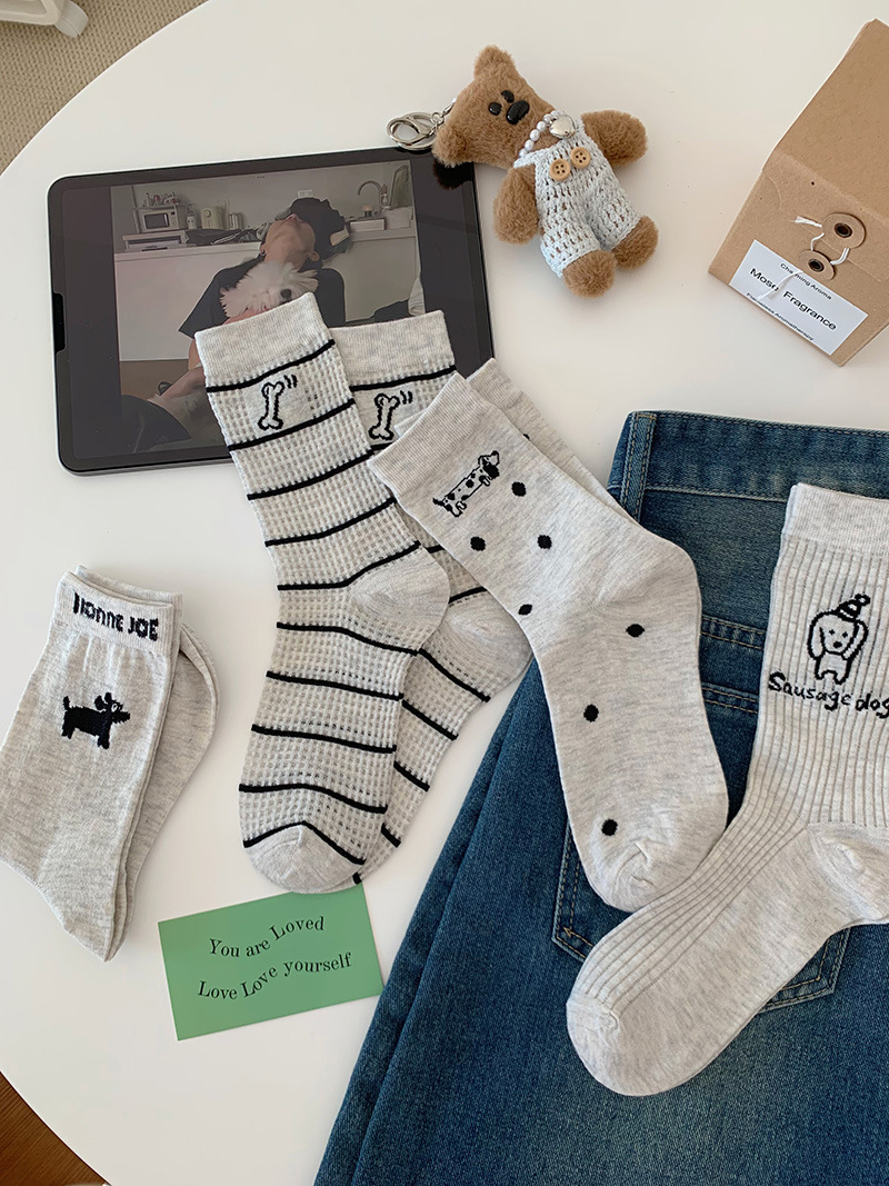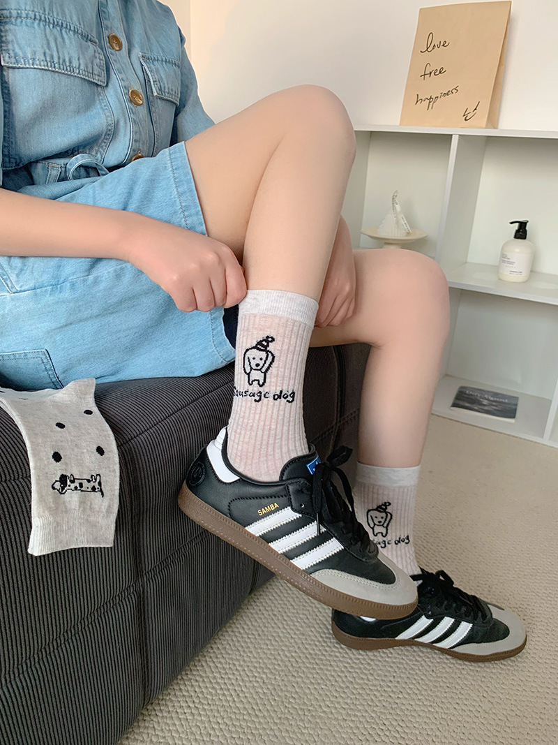 양말 여성의 얇은 줄무늬 만화 강아지 양말 봄과 여름 귀여운 메쉬 중공 폴카 도트 면 회색 양말