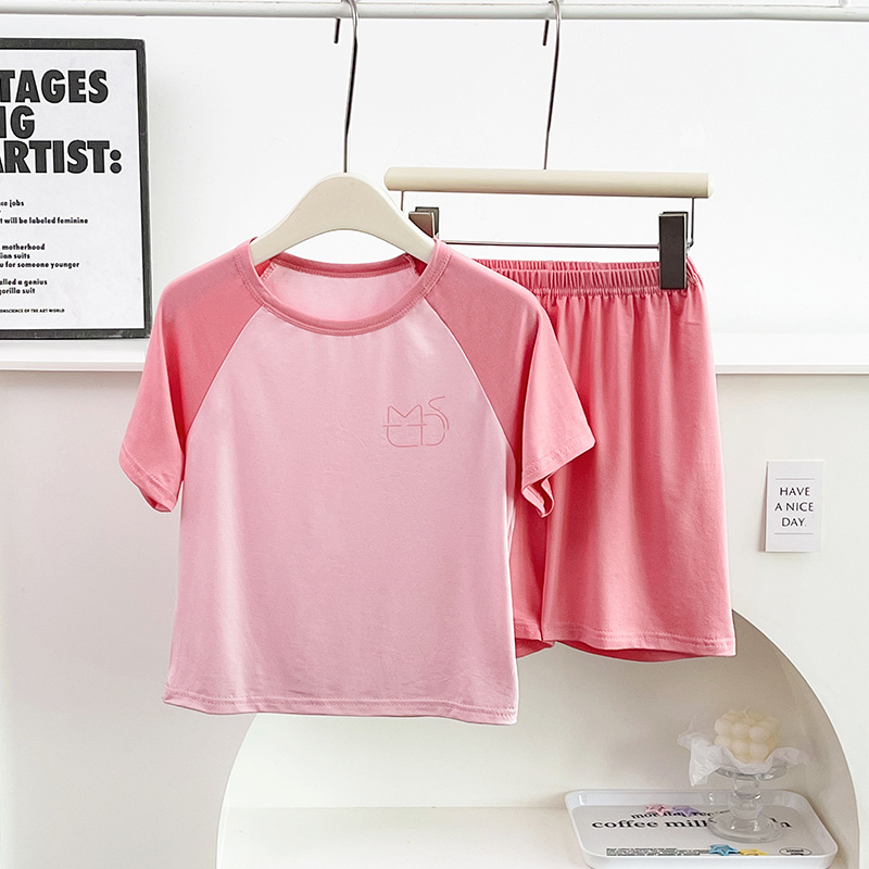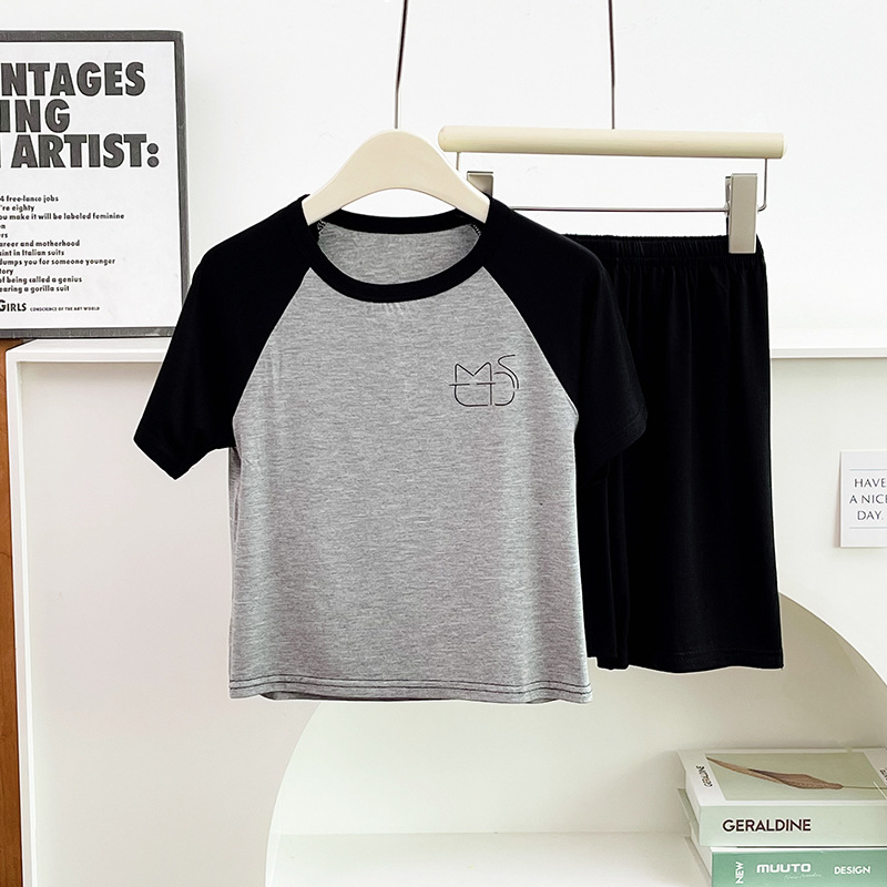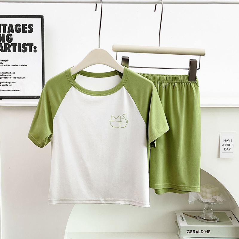 여름 얇은 부모-자식 느슨한 캐주얼 에어컨 가정복 소년과 소녀를위한 짧은 소매 5 점 바지 잠옷 2 피스 세트스토어 가기