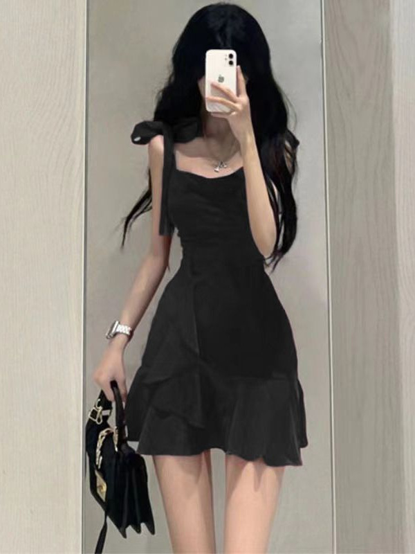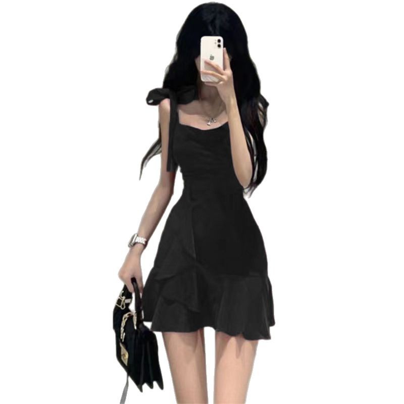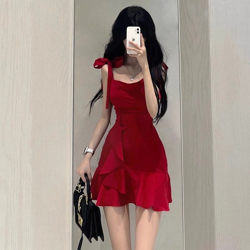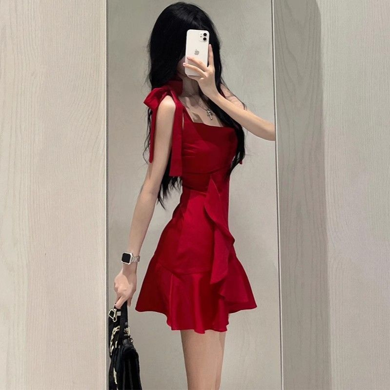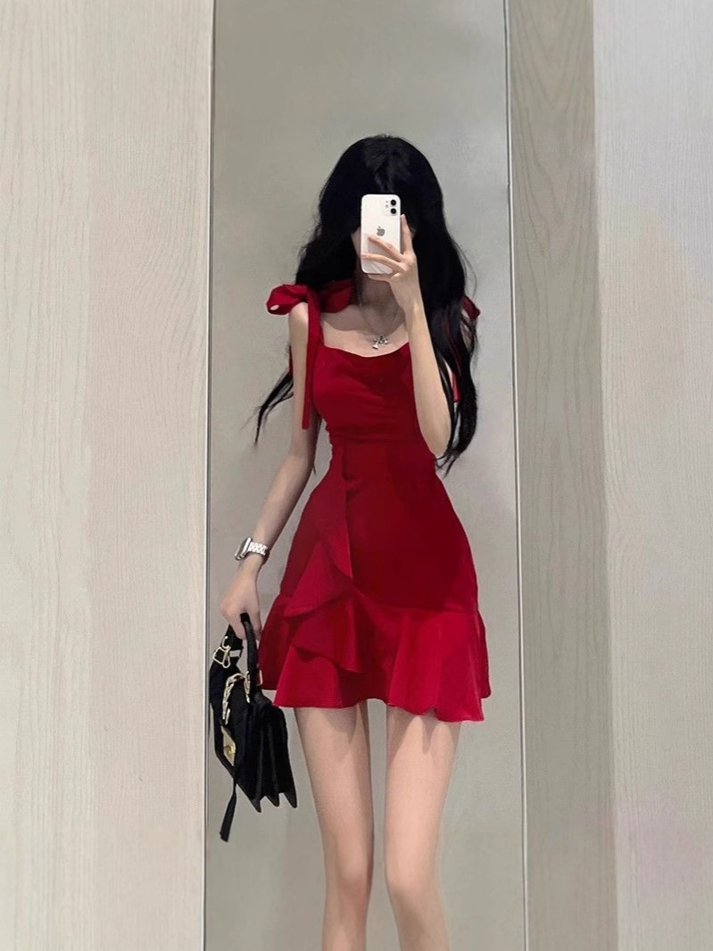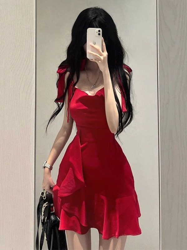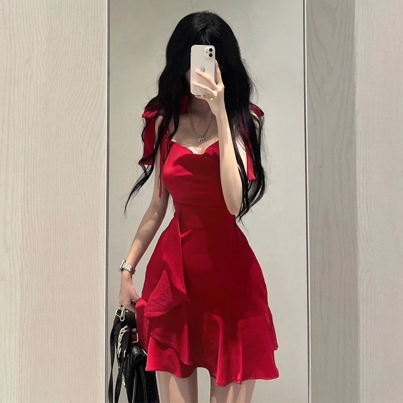 새로운 연잎 스타일 핫걸 레드 서스펜더 드레스 작은 여름 순수한 욕망 스타일 허리 슬리밍 짧은 스커트 여성용스토어 가기