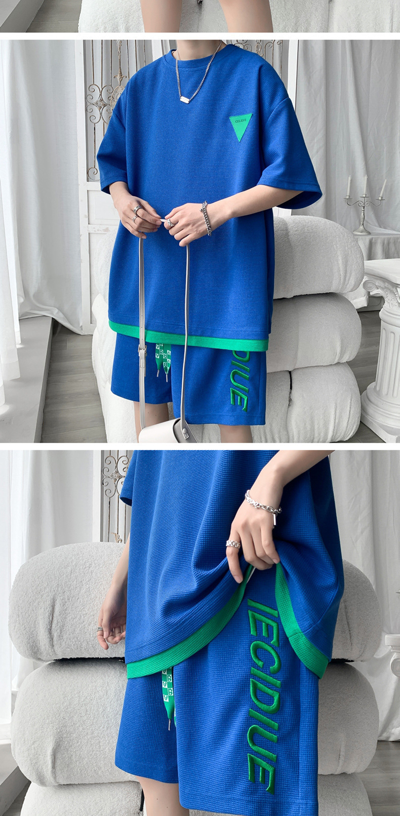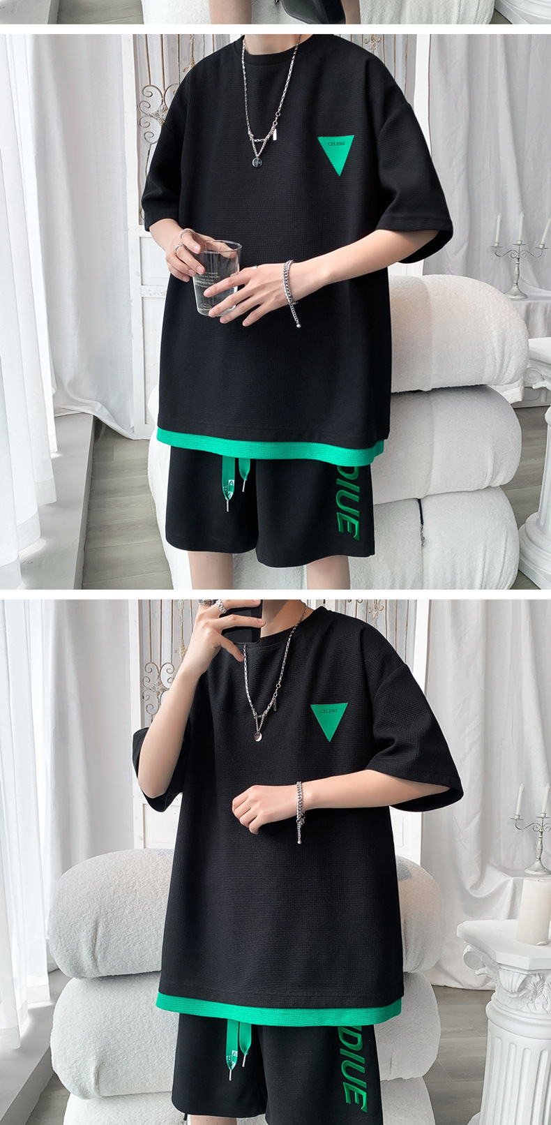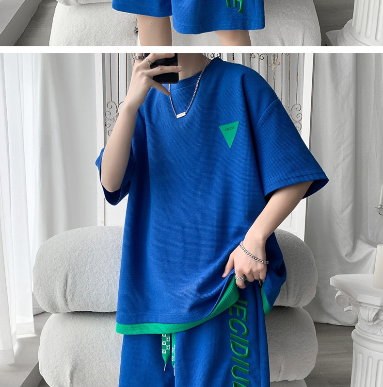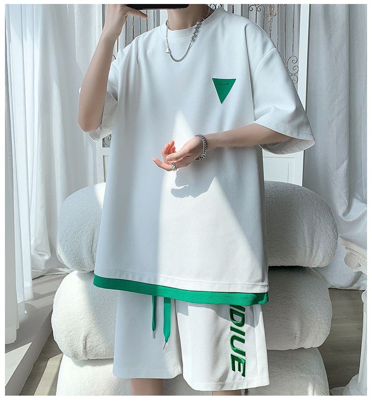 남성용 캐주얼 스포츠 슈트, 여름 와플 트렌디 브랜드 반팔 티셔츠, 남성용 투피스 반바지, 루즈한 옷 세트스토어 가기