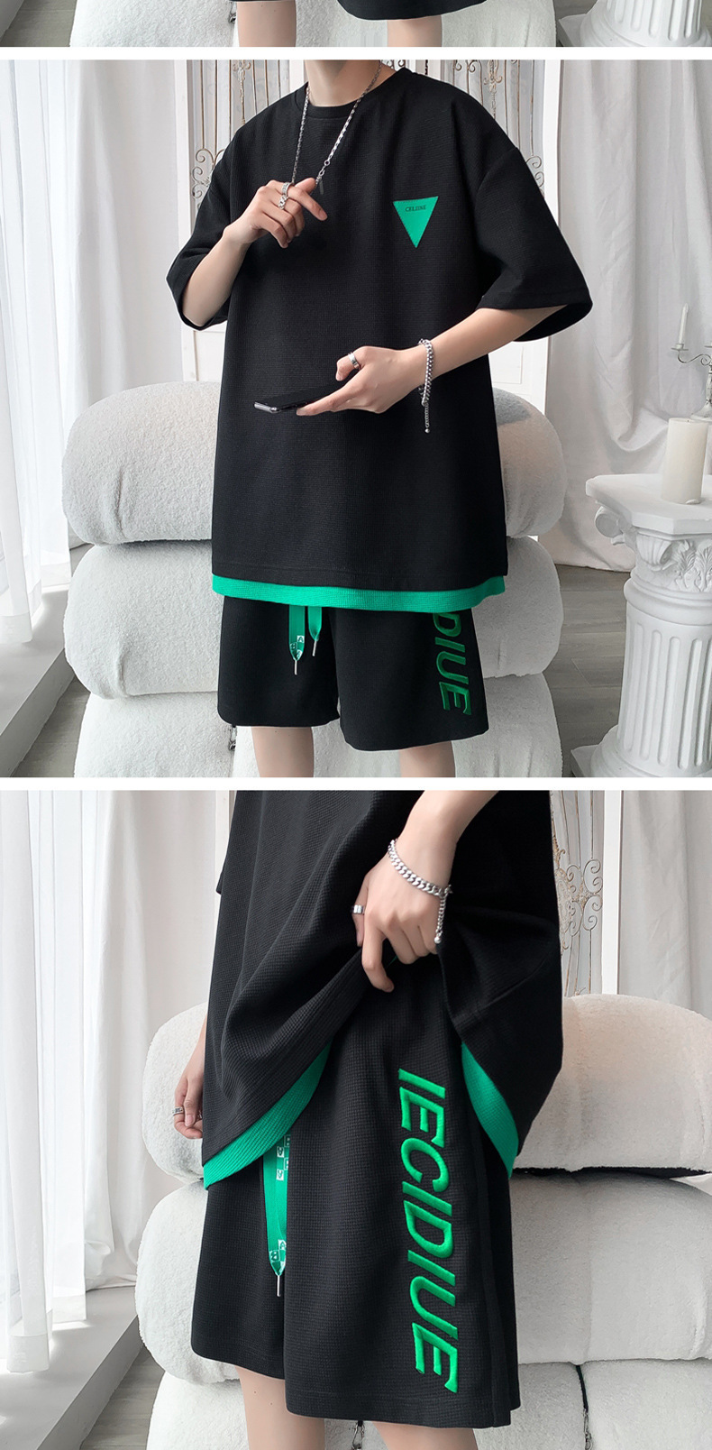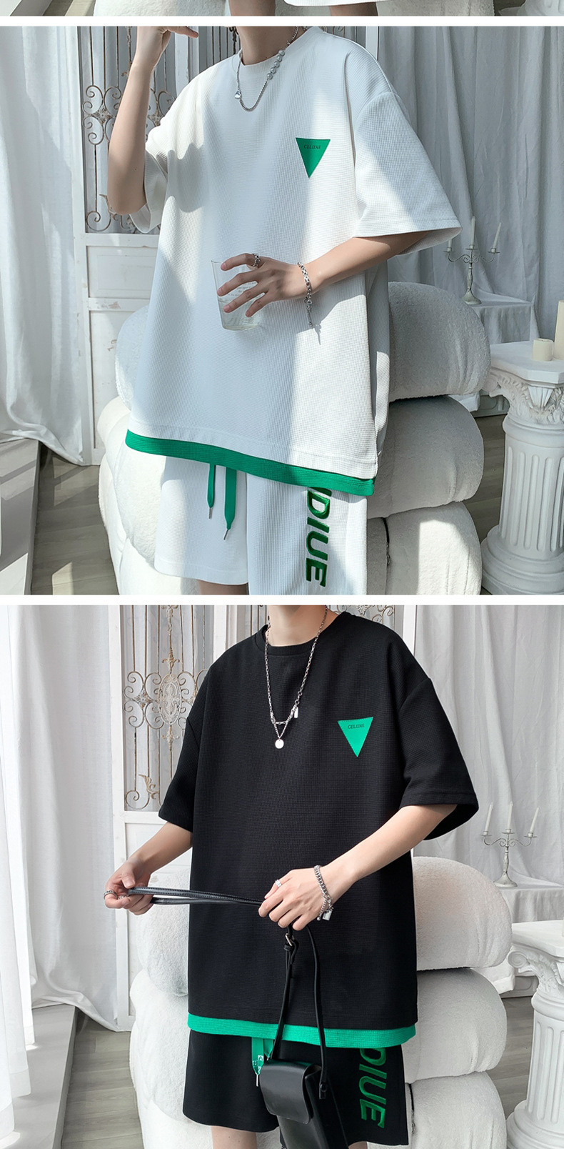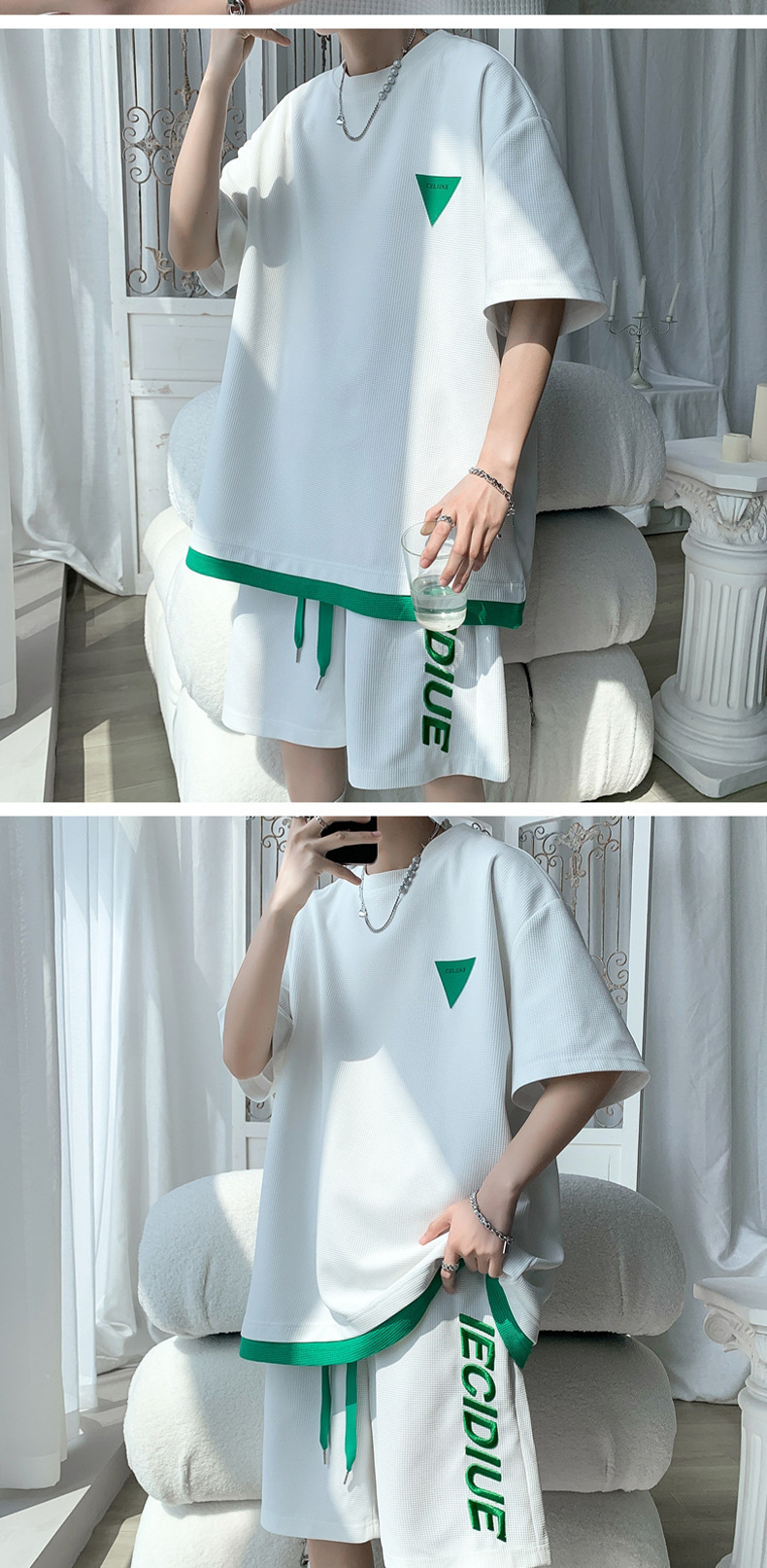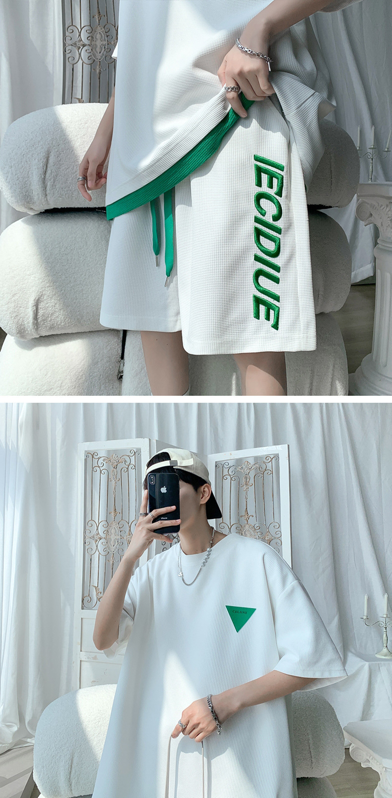 남성용 캐주얼 스포츠 슈트, 여름 와플 트렌디 브랜드 반팔 티셔츠, 남성용 투피스 반바지, 루즈한 옷 세트