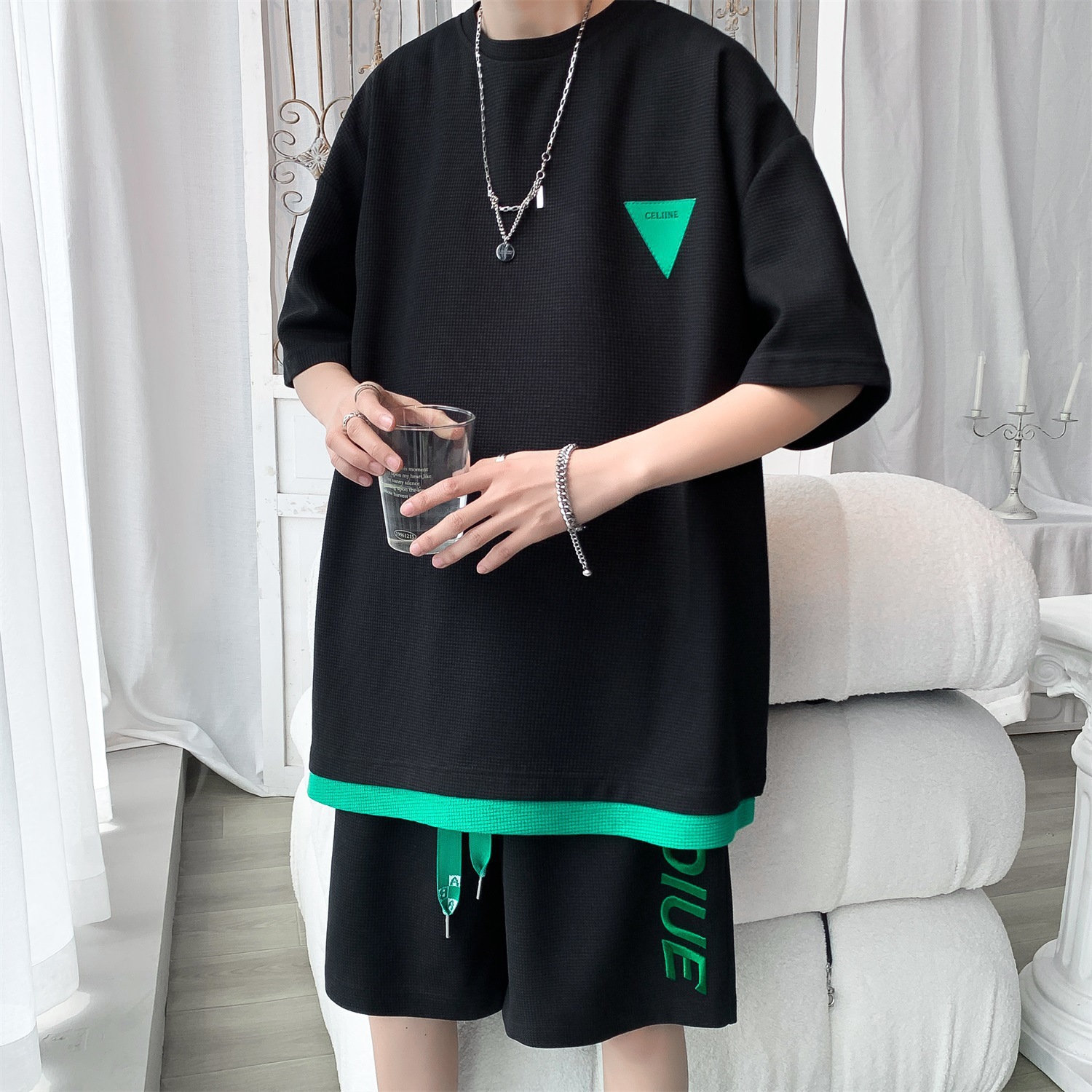 休闲运动套装男夏季华夫格潮牌短袖t恤男两件套短裤一套衣服宽松