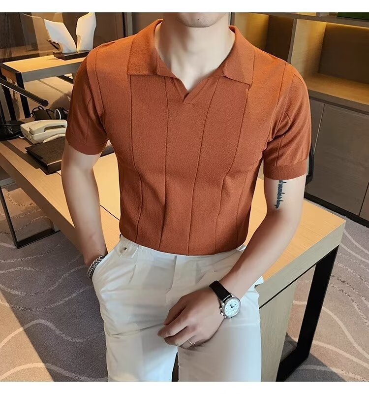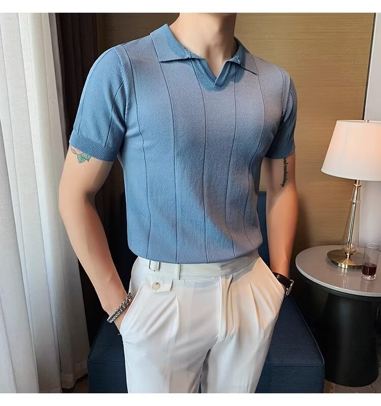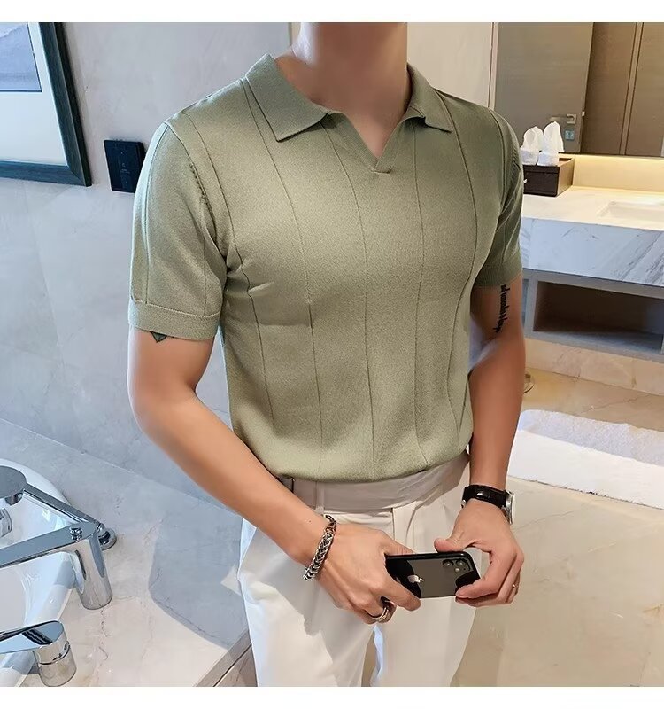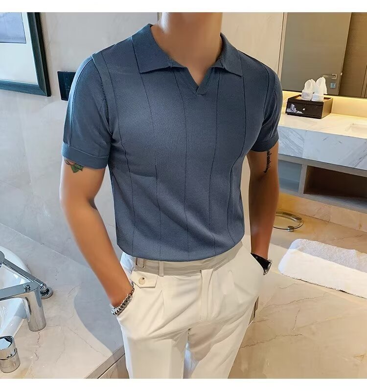 국경 간 대외 무역 아이스 실크 반팔 티셔츠 여름 2024 새로운 슬림 핏 비즈니스 남성 최고의 부치 핸섬 V-넥 니트 PO