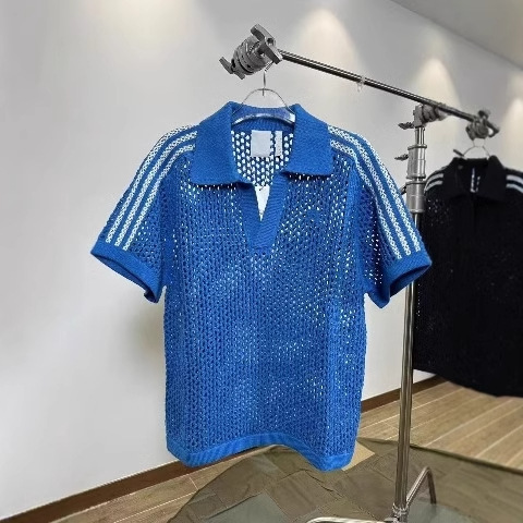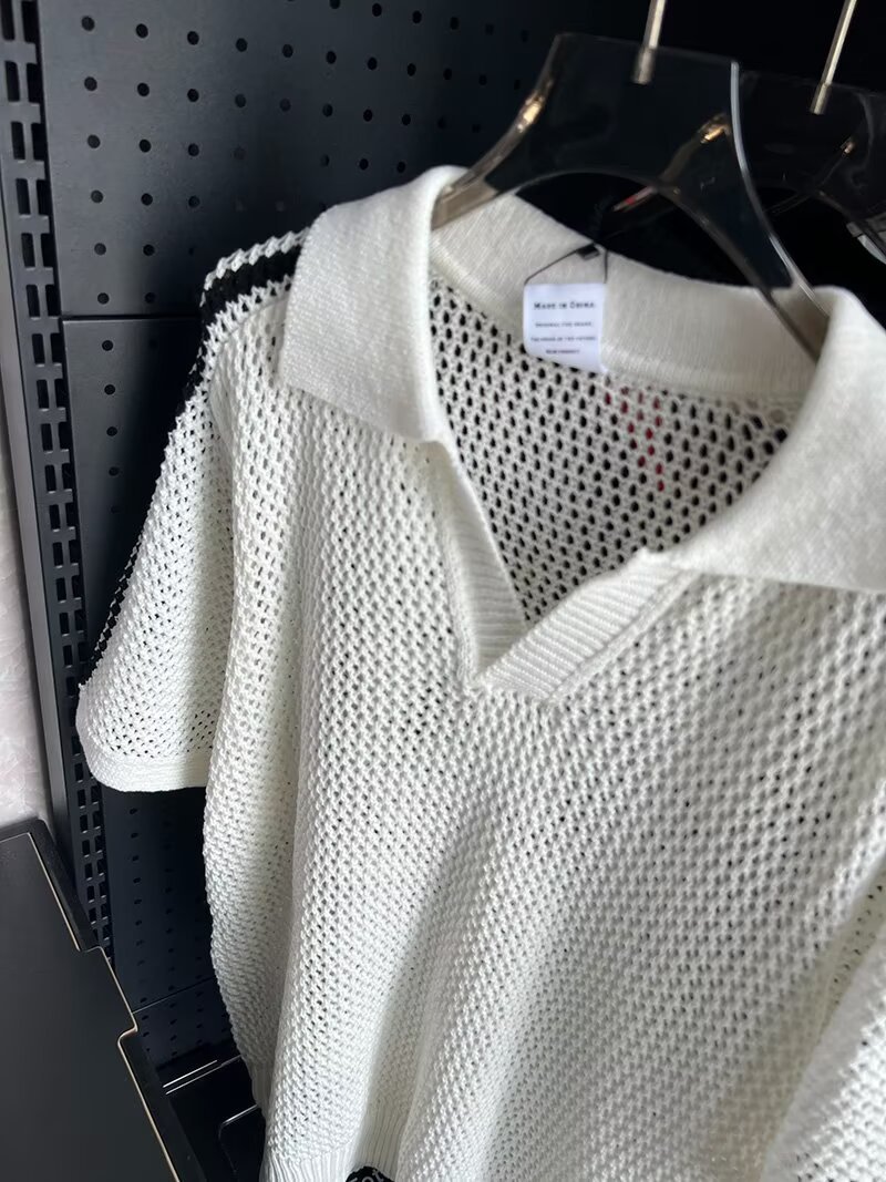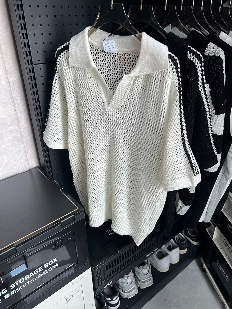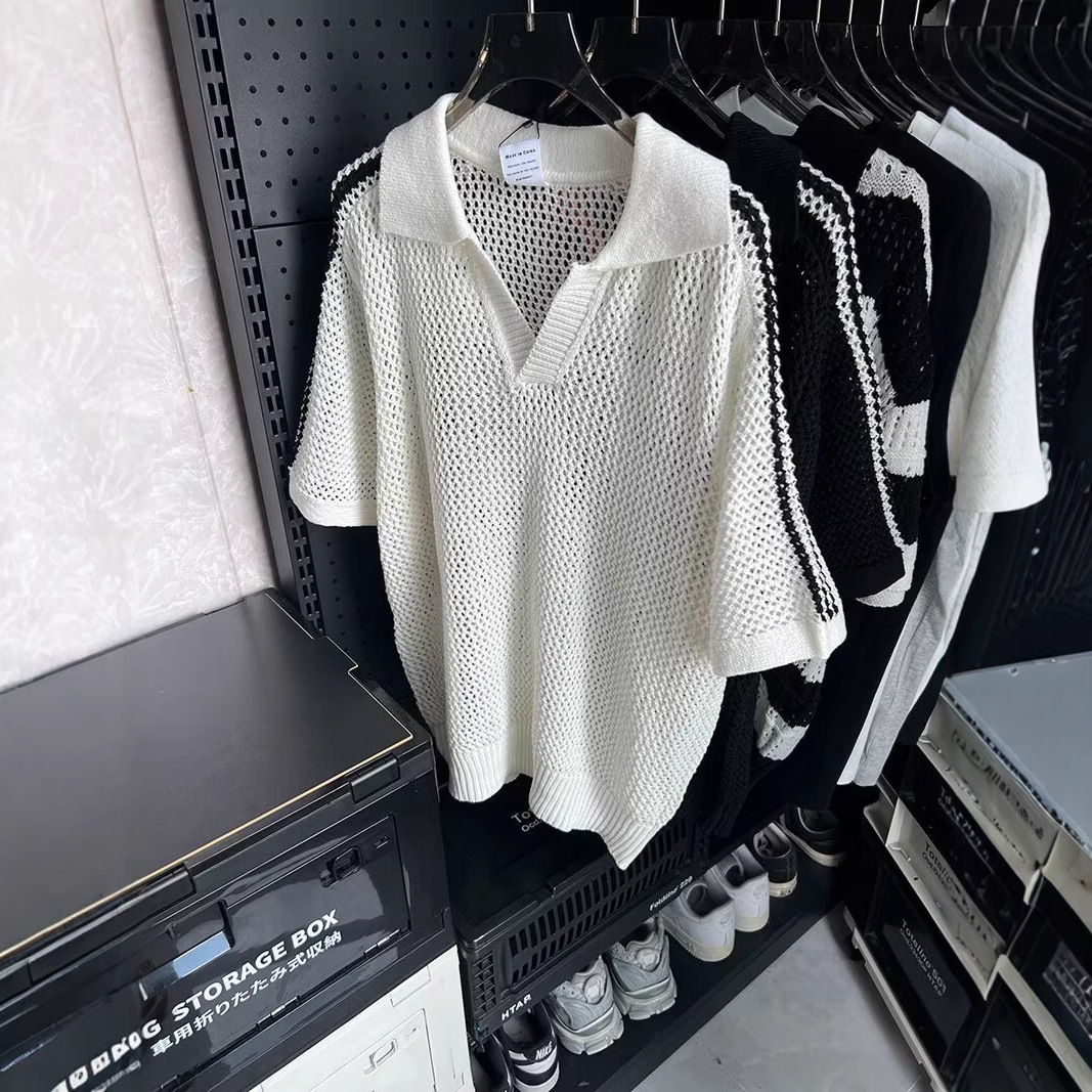 여름 할로우 통기성 V-Neck 최고 남성 아메리칸 스타일 레트로 느슨한 캐주얼 디자인 센스 래그 스웨터 반팔 트렌디