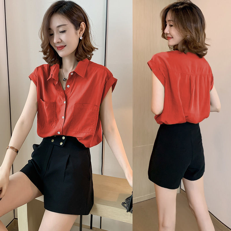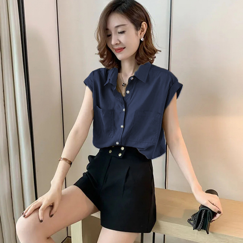 최고 디자인 감각 여성 틈새 쉬폰 반팔 셔츠 여성 여름 새로운 패션 한국 느슨한 슬림 셔츠 여성