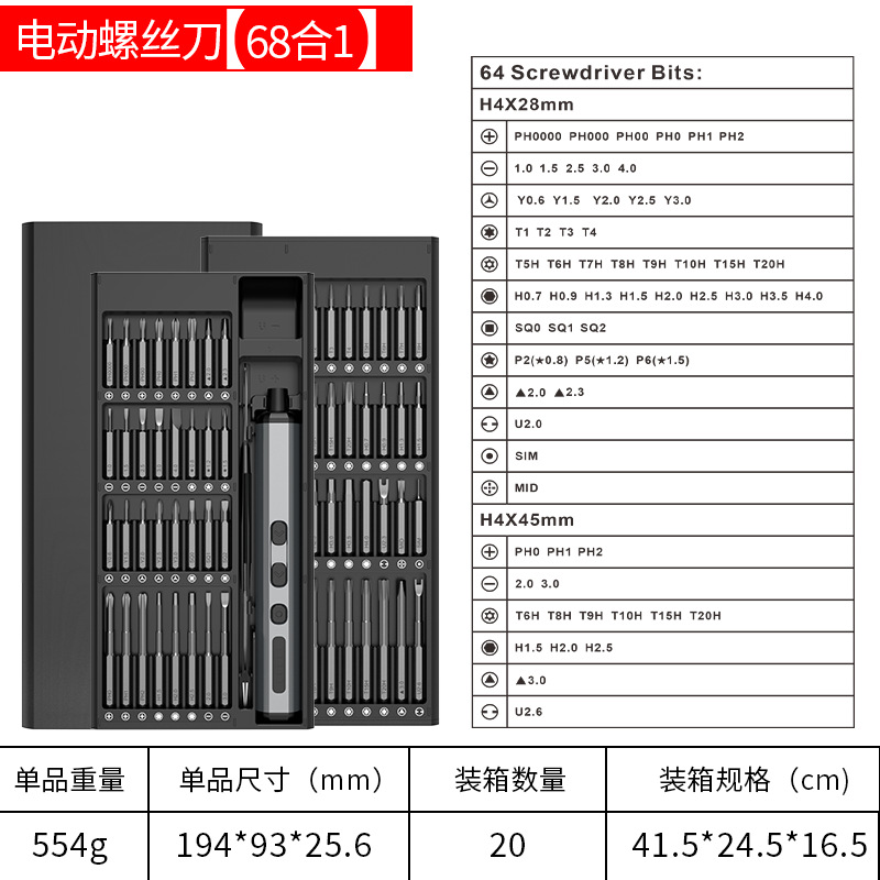 批头*64,SUB充电线*1,加磁器*1,电动螺丝刀手柄*1 |