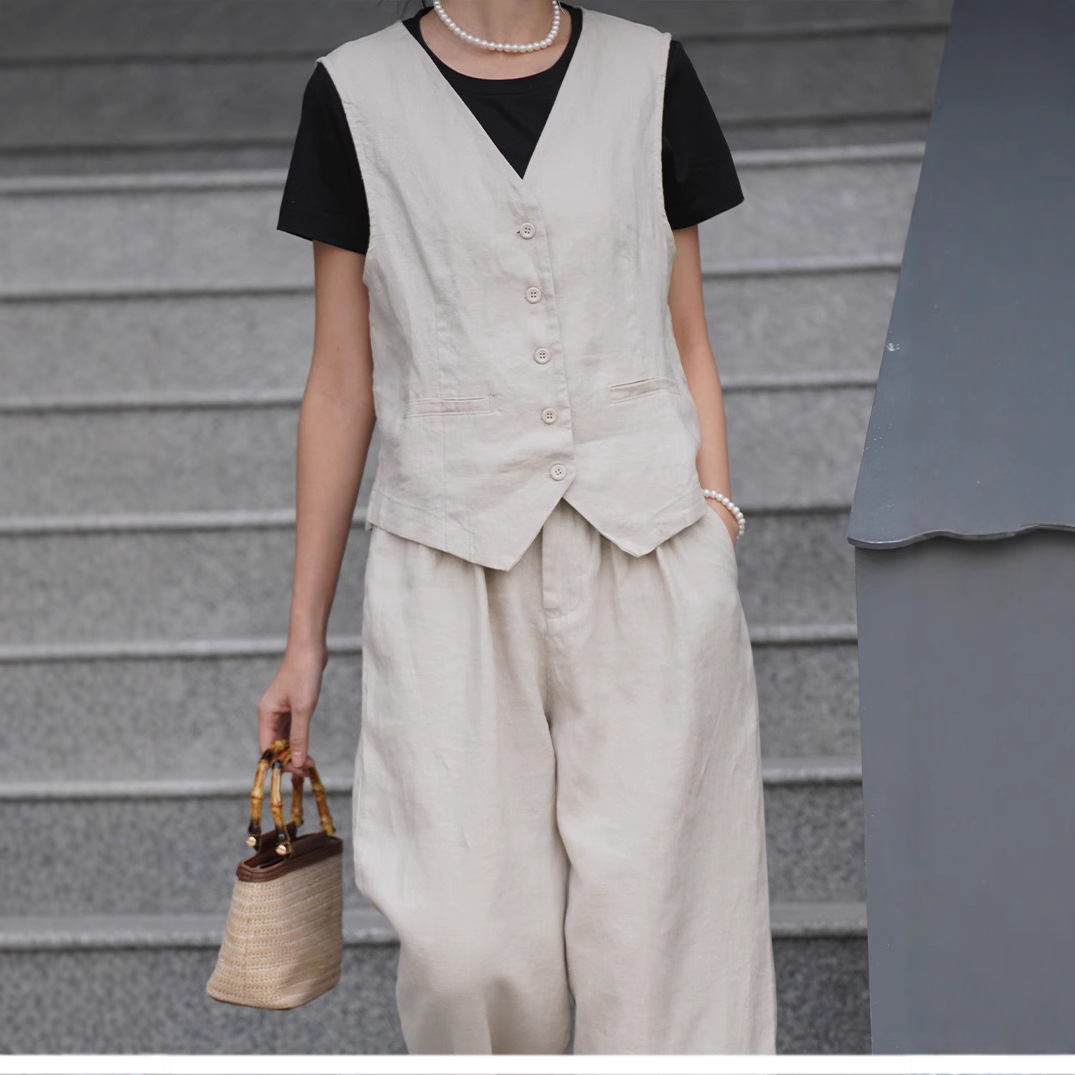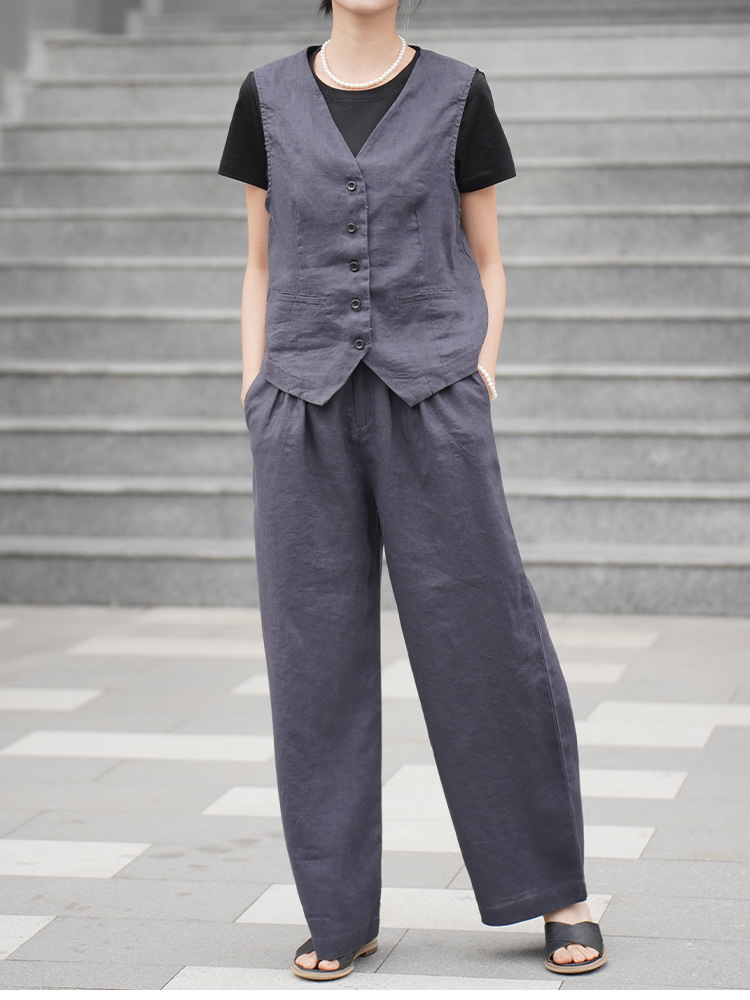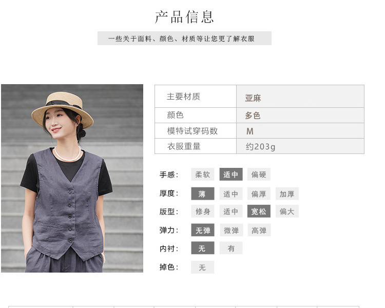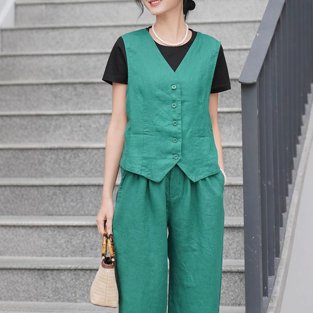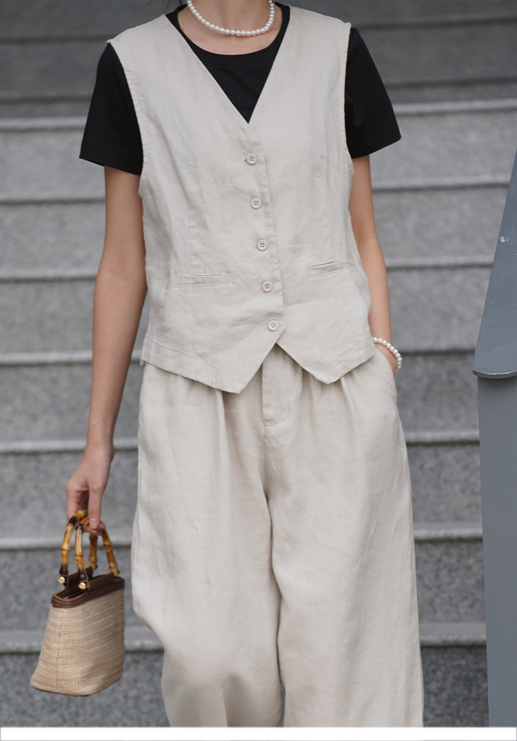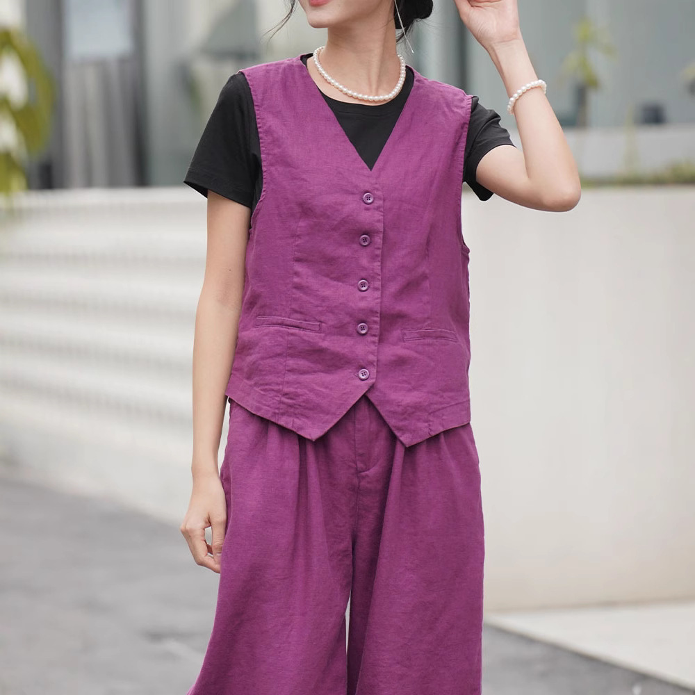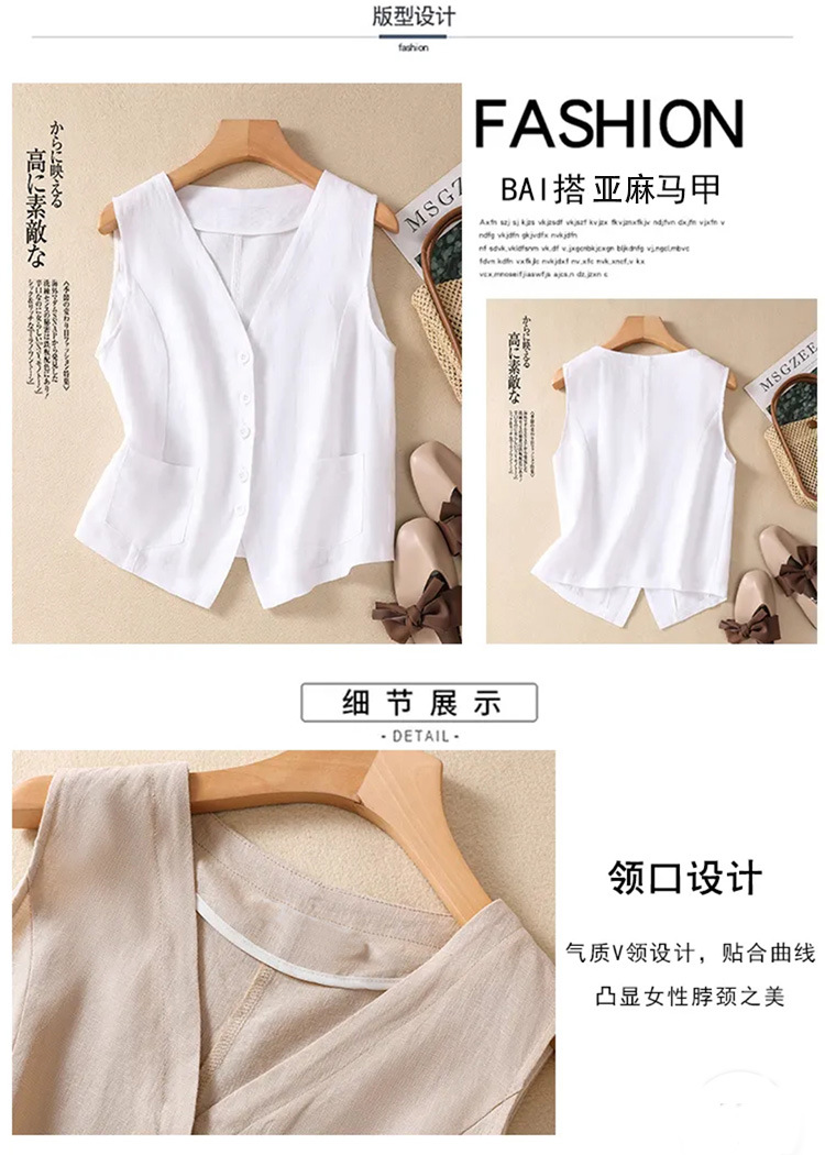 亚麻马甲,无领单排扣设计,两侧小口袋可以放零用东西,简约大气,透气吸湿又时尚,搭配亚麻裤子套装穿着,轻松穿出休闲文艺风,可以点击上面亚麻裤选择相应颜色搭配一套,马甲和裤子的颜色一样无差别,都是同一批面料做的。