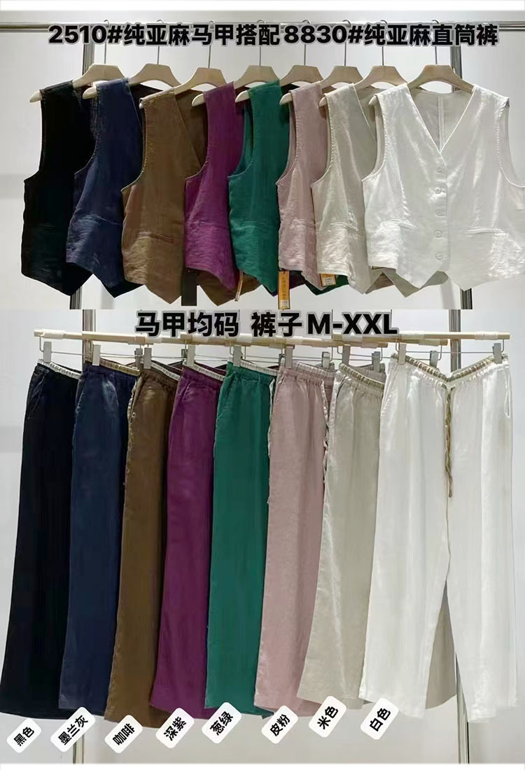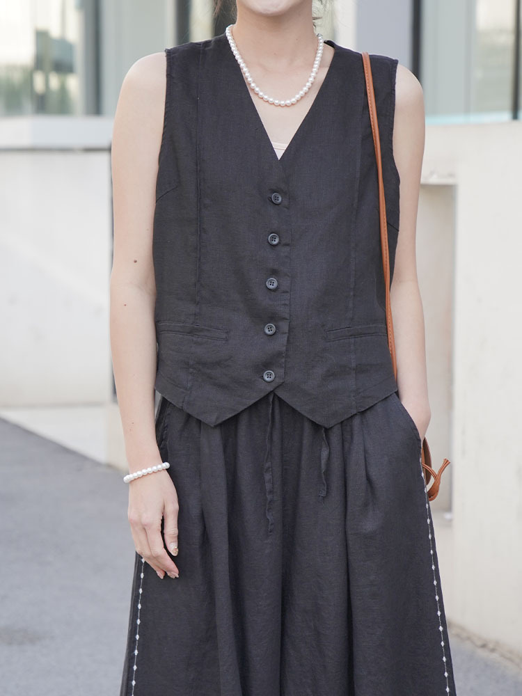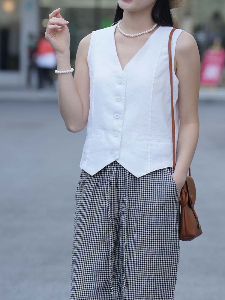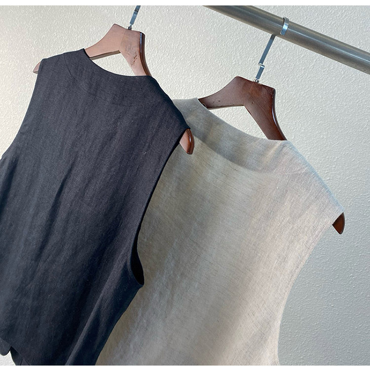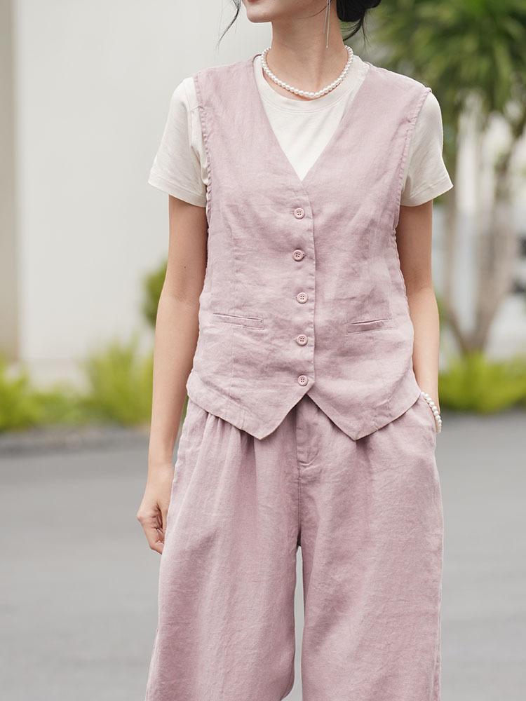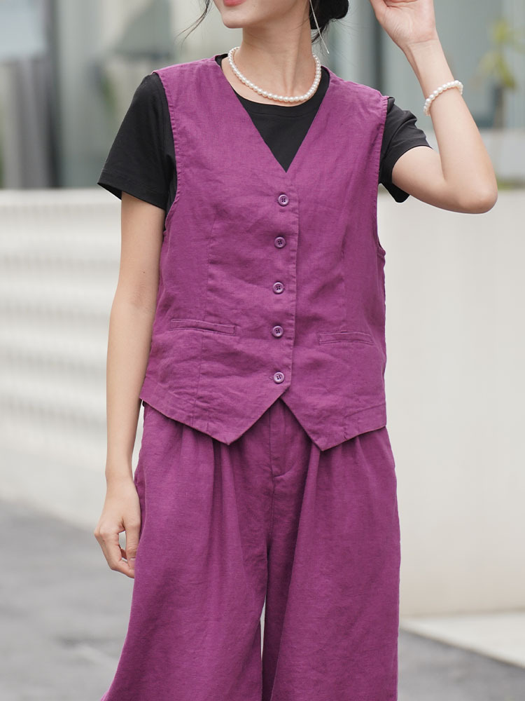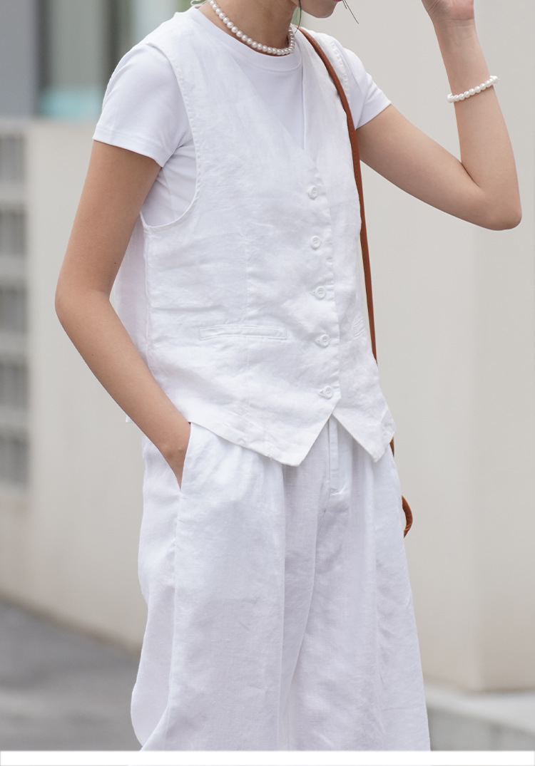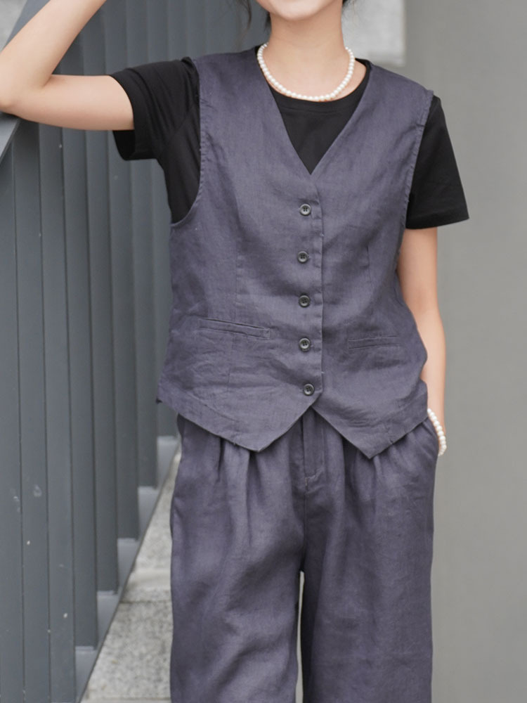 亚麻马甲,无领单排扣设计,两侧小口袋可以放零用东西,简约大气,透气吸湿又时尚,搭配亚麻裤子套装穿着,轻松穿出休闲文艺风,可以点击上面亚麻裤选择相应颜色搭配一套,马甲和裤子的颜色一样无差别,都是同一批面料做的。