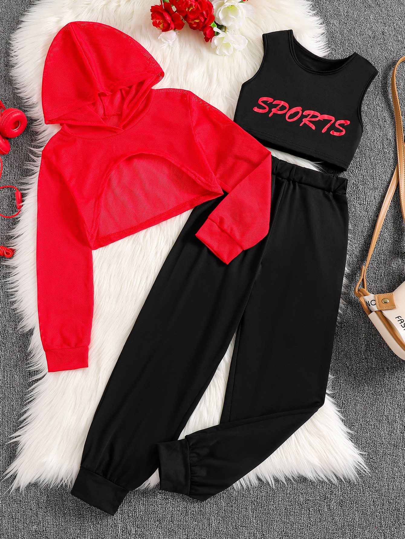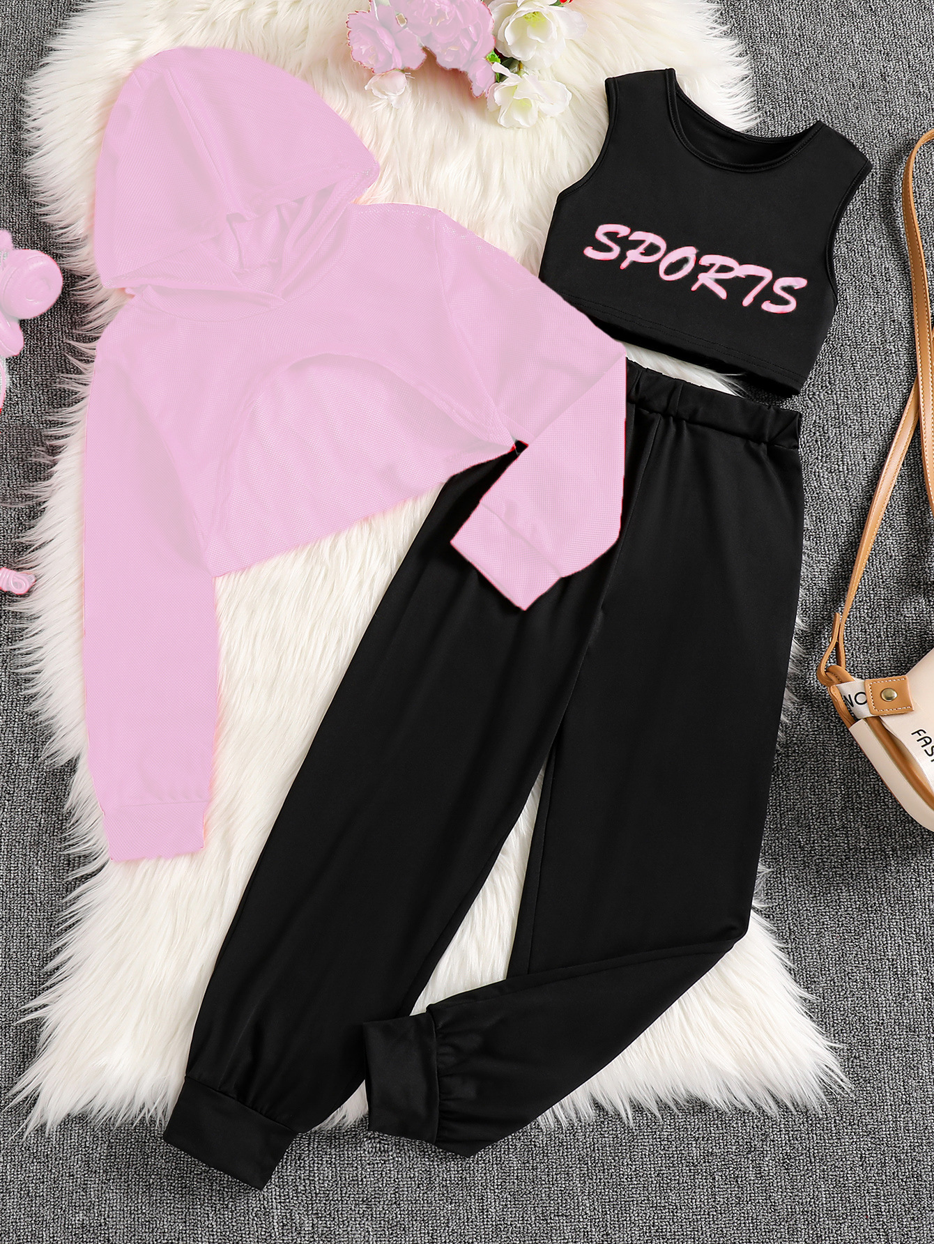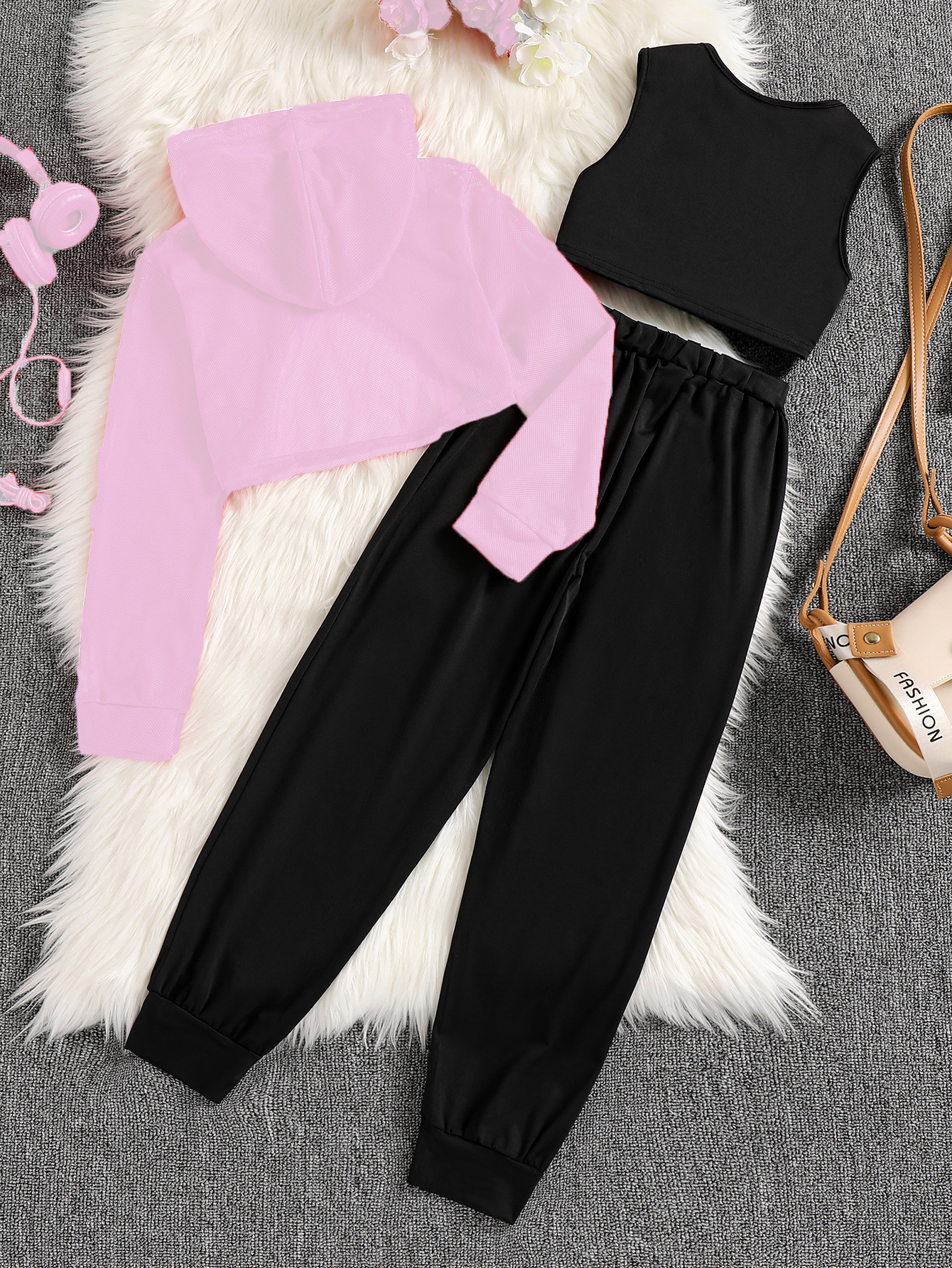 여아용 세트, 봄과 가을용 후드 메쉬 숏 스웨트셔츠, 조끼, 긴 바지, 캐주얼 3피스 세트, 스포츠 유럽 및 미국 스타일스토어 가기