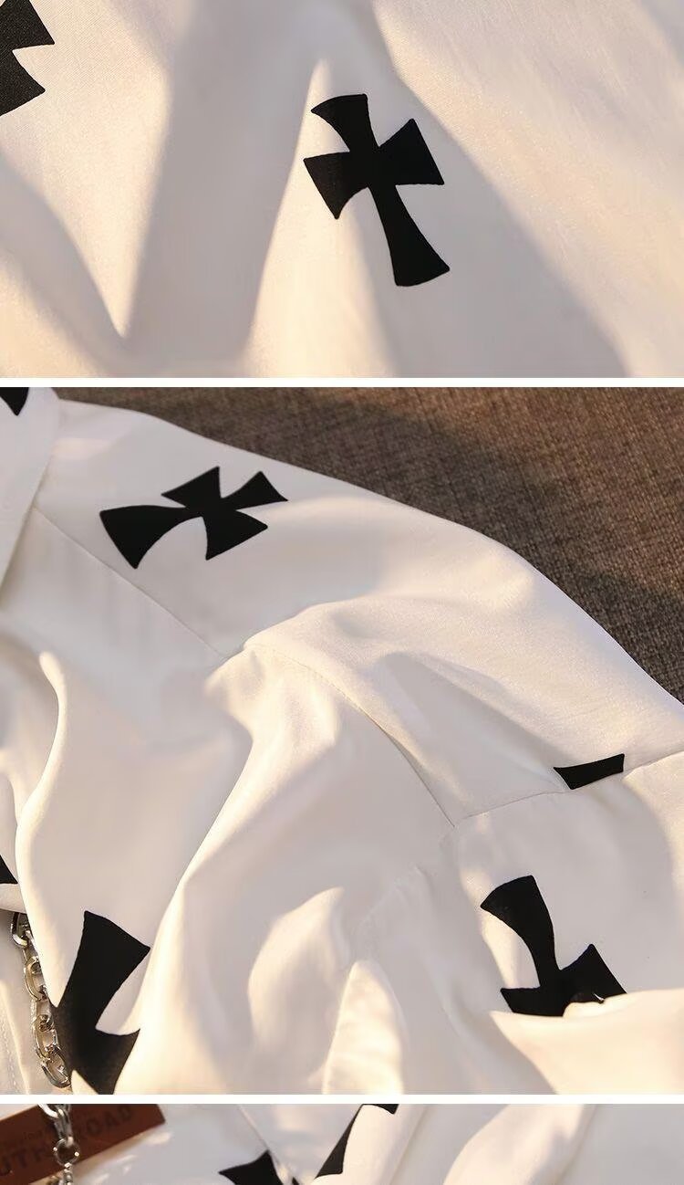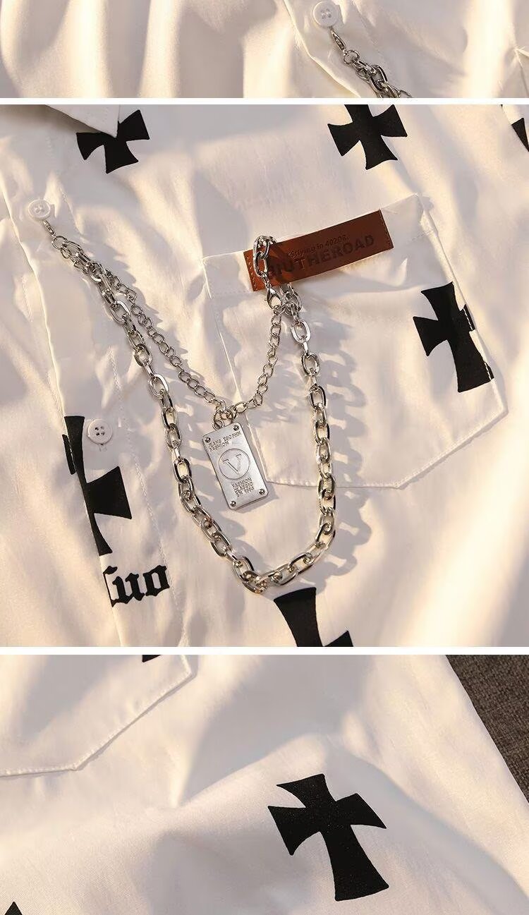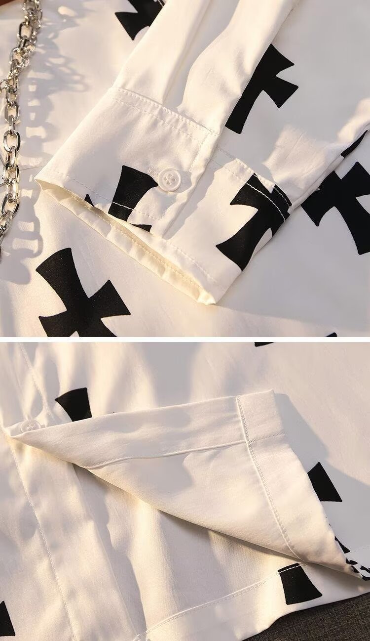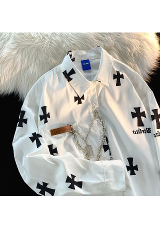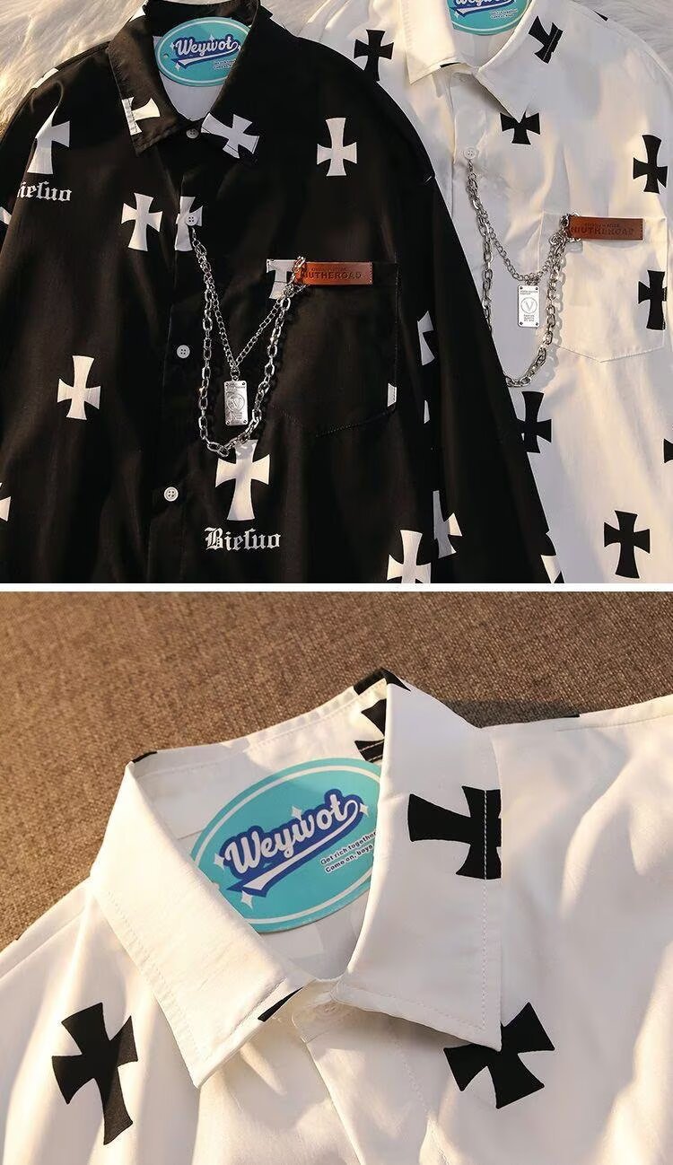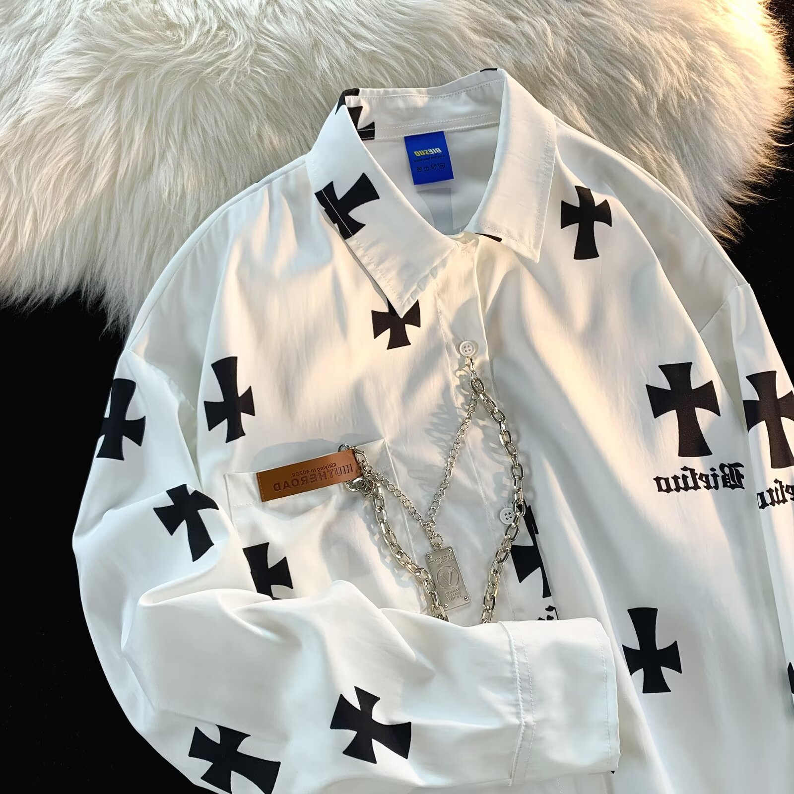 아메리칸 하이 스트리트 크로스 프린트 남성용 긴팔 셔츠, 여름 캐주얼 힙합, 다재다능하고 패셔너블한 브랜드 체인 와이드 트렌드