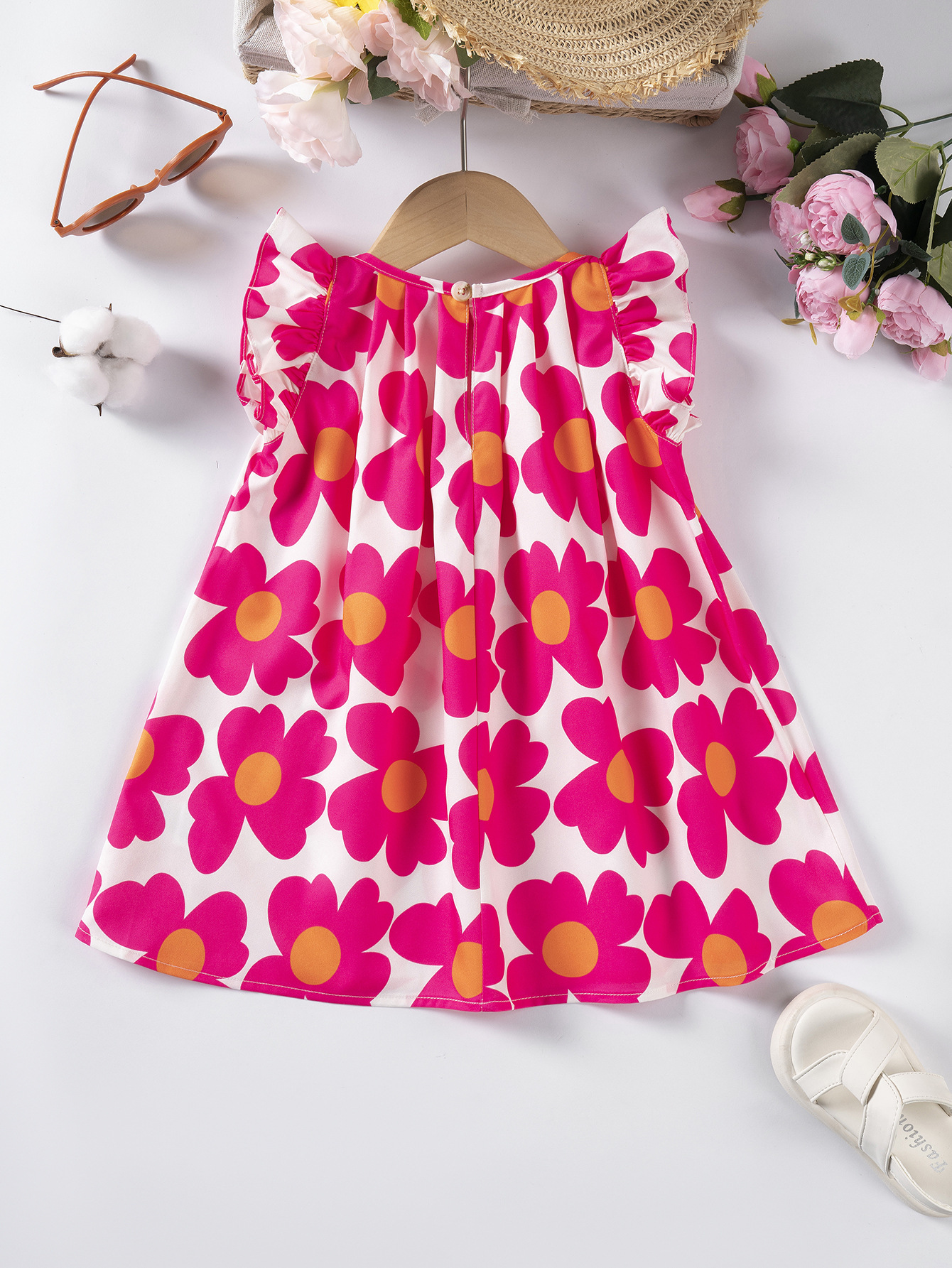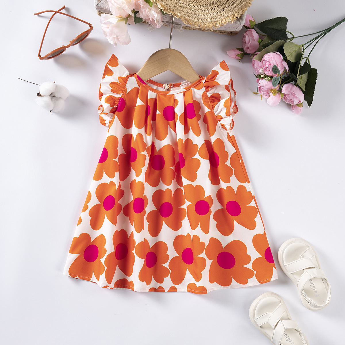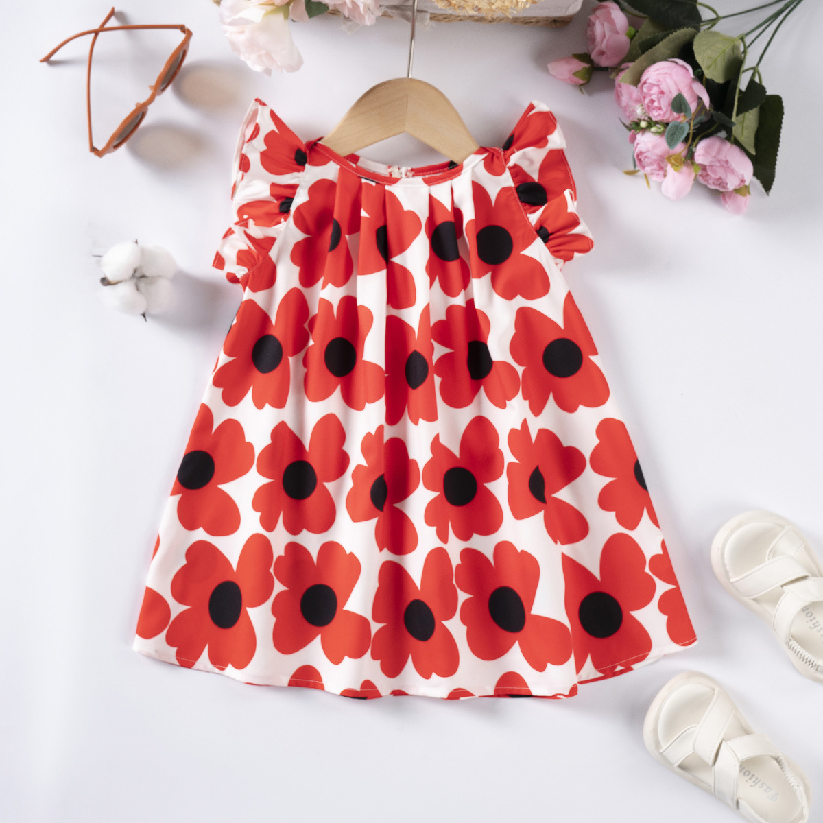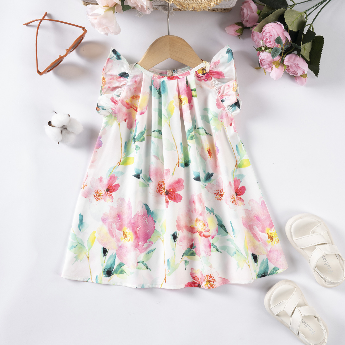 2026 여름 여아 원피스, 귀여운 꽃무늬 프린트, 달콤한 플라잉 슬리브, A라인 스커트, 라운드넥 풀오버 스커트