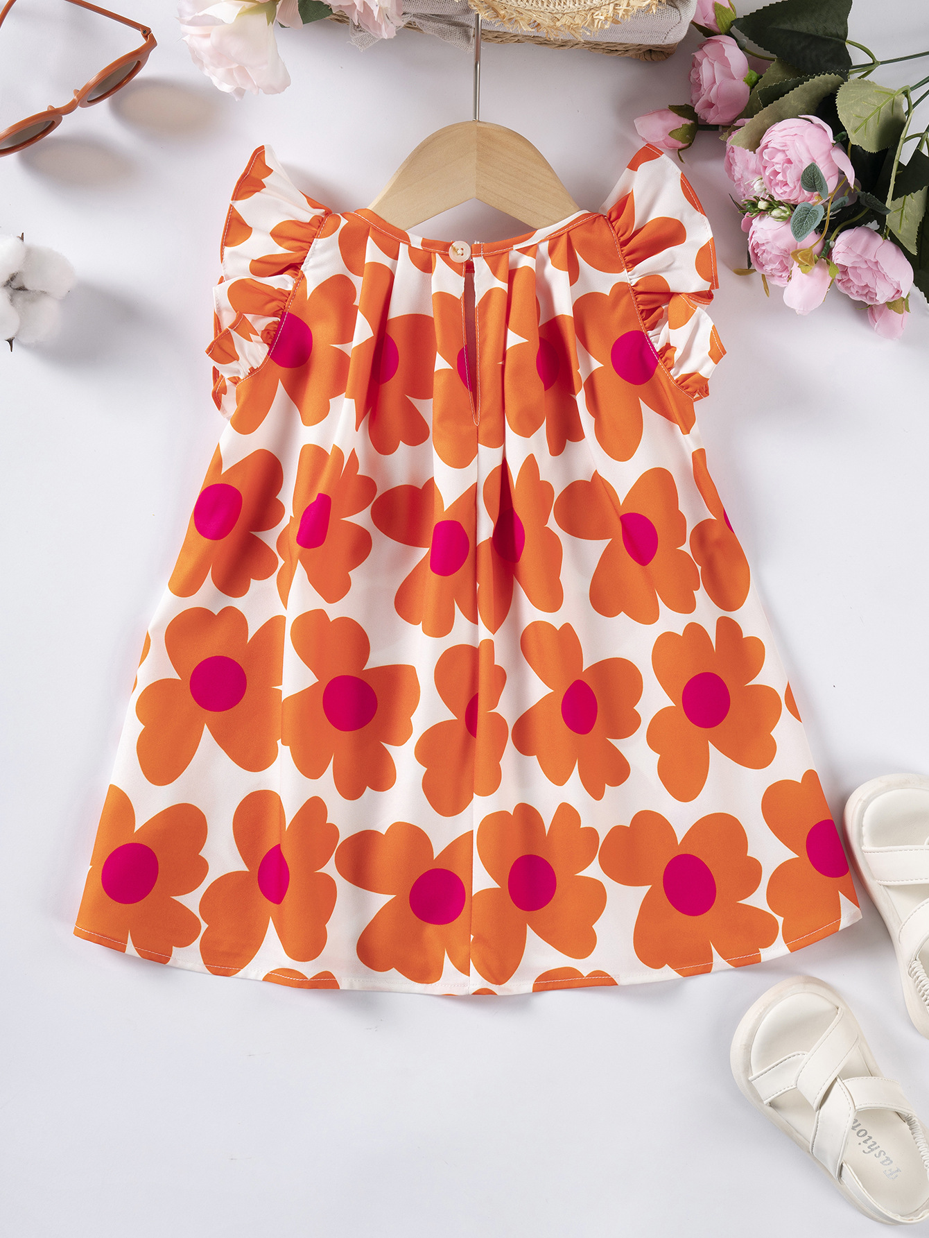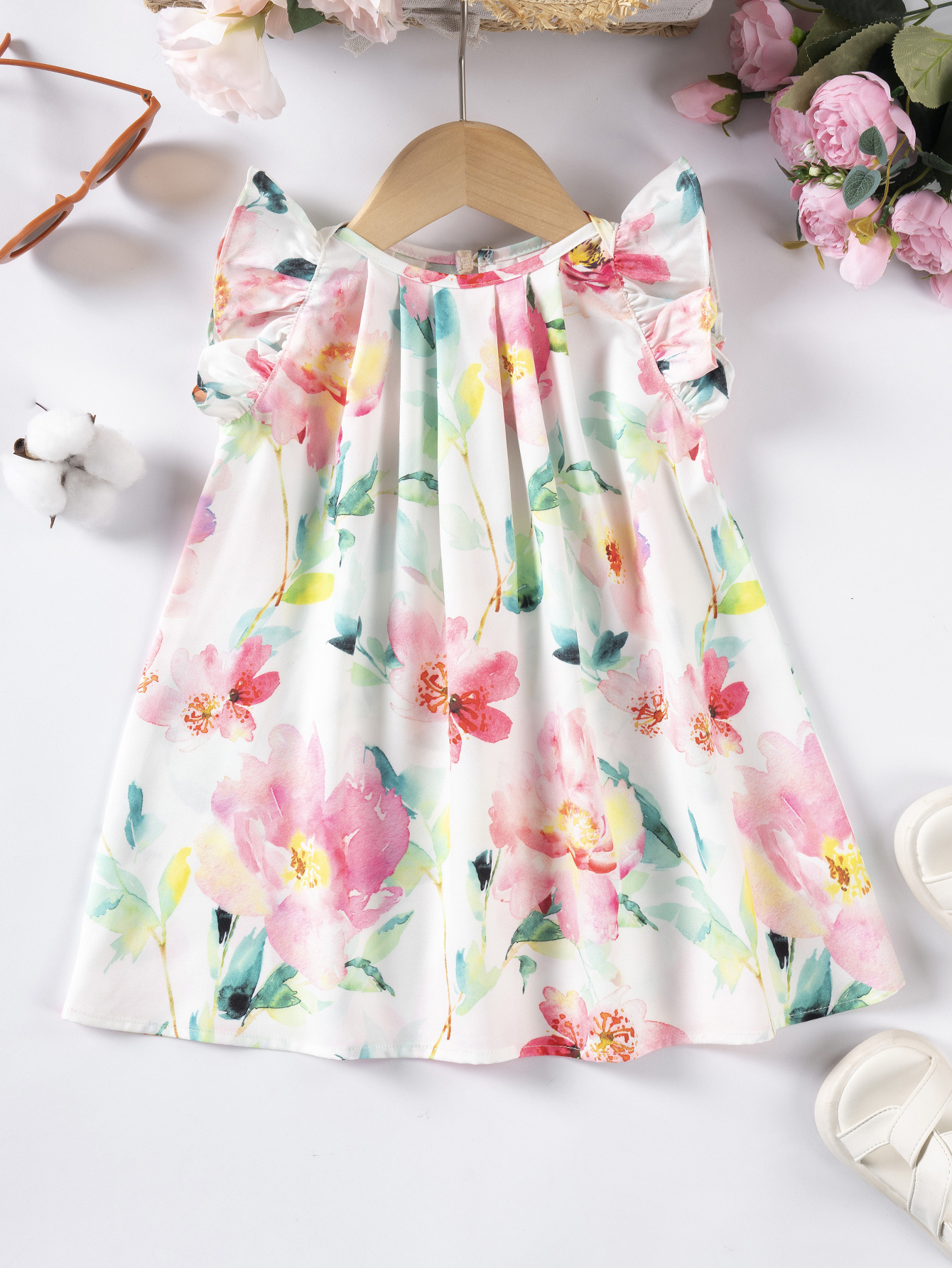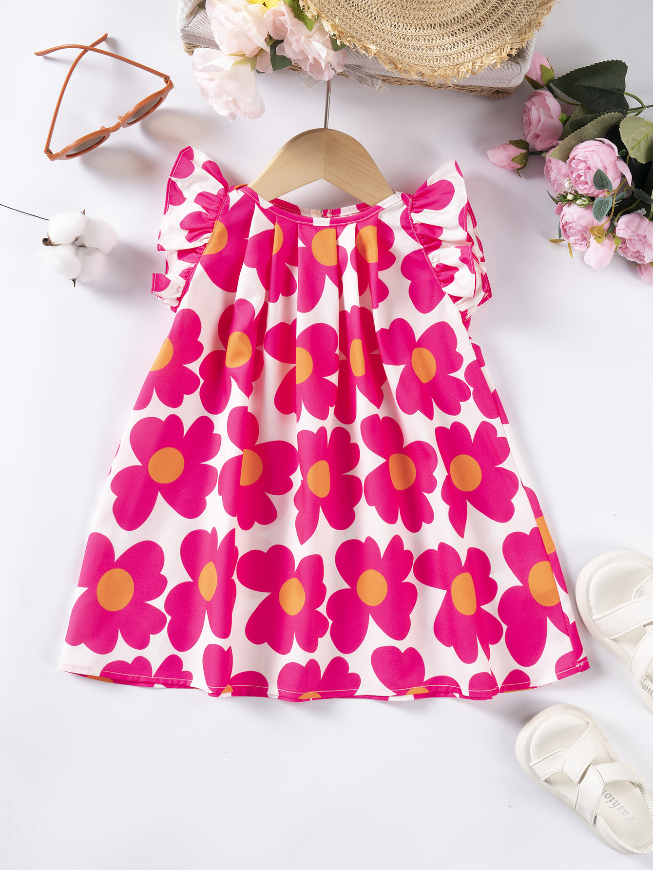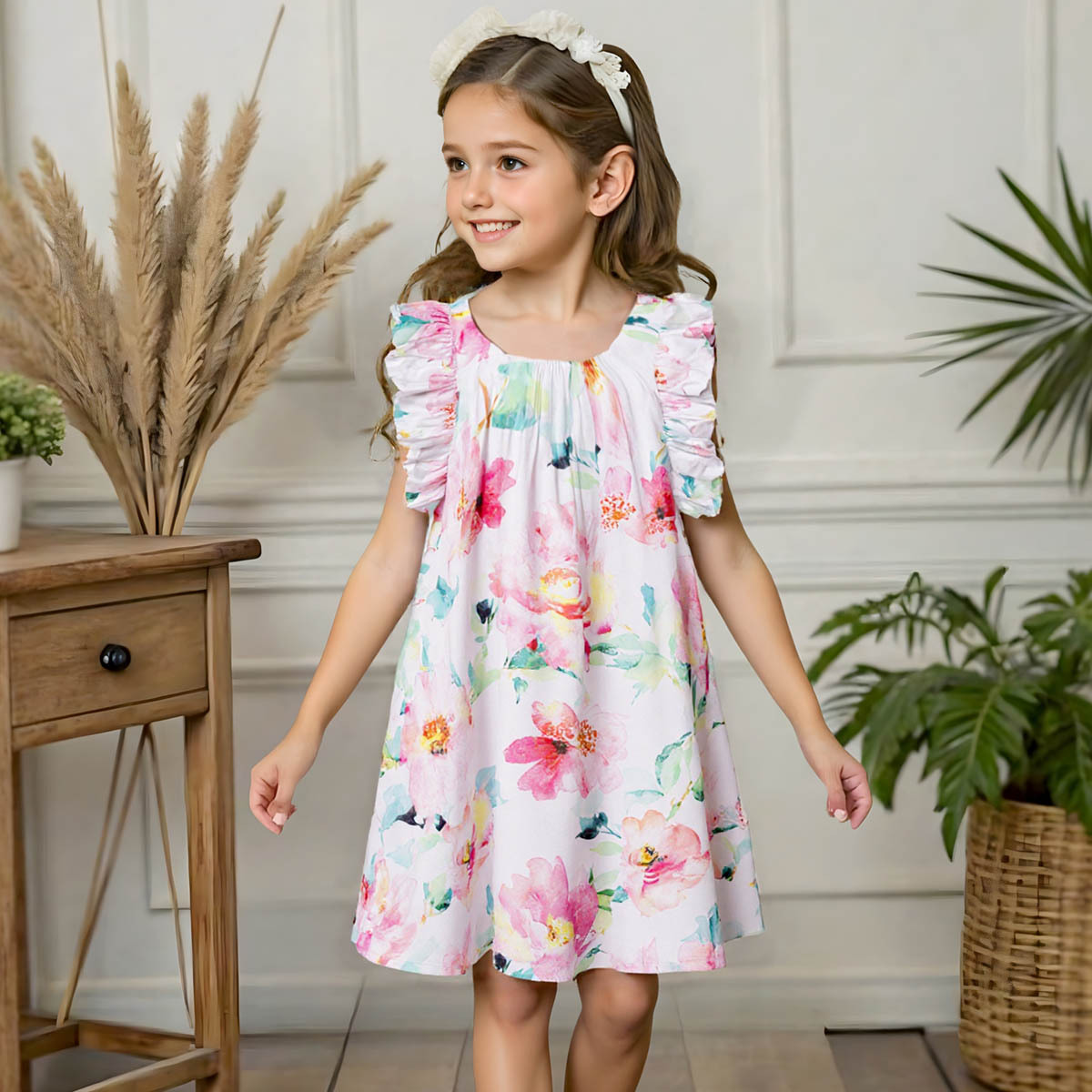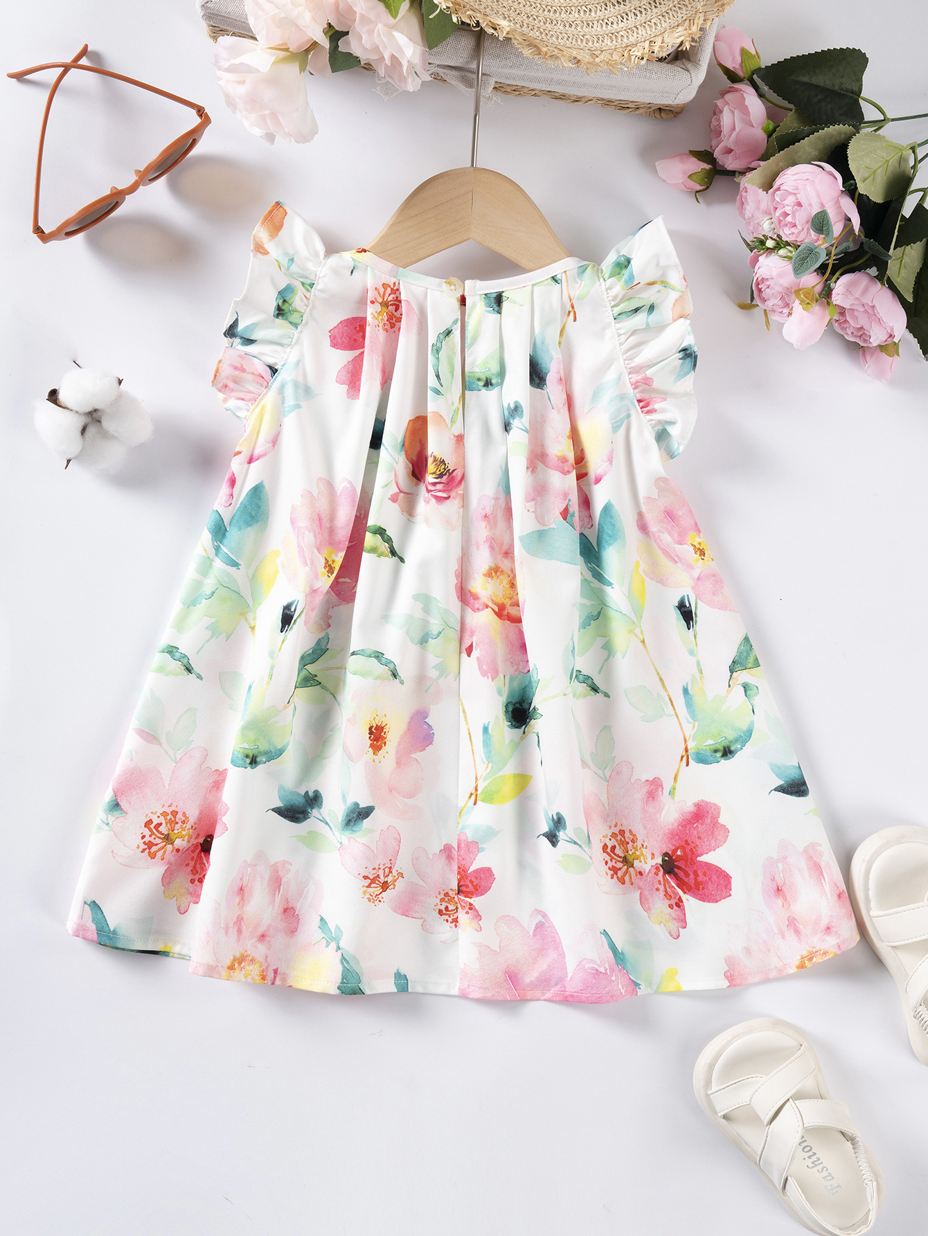 2026 여름 여아 원피스, 귀여운 꽃무늬 프린트, 달콤한 플라잉 슬리브, A라인 스커트, 라운드넥 풀오버 스커트