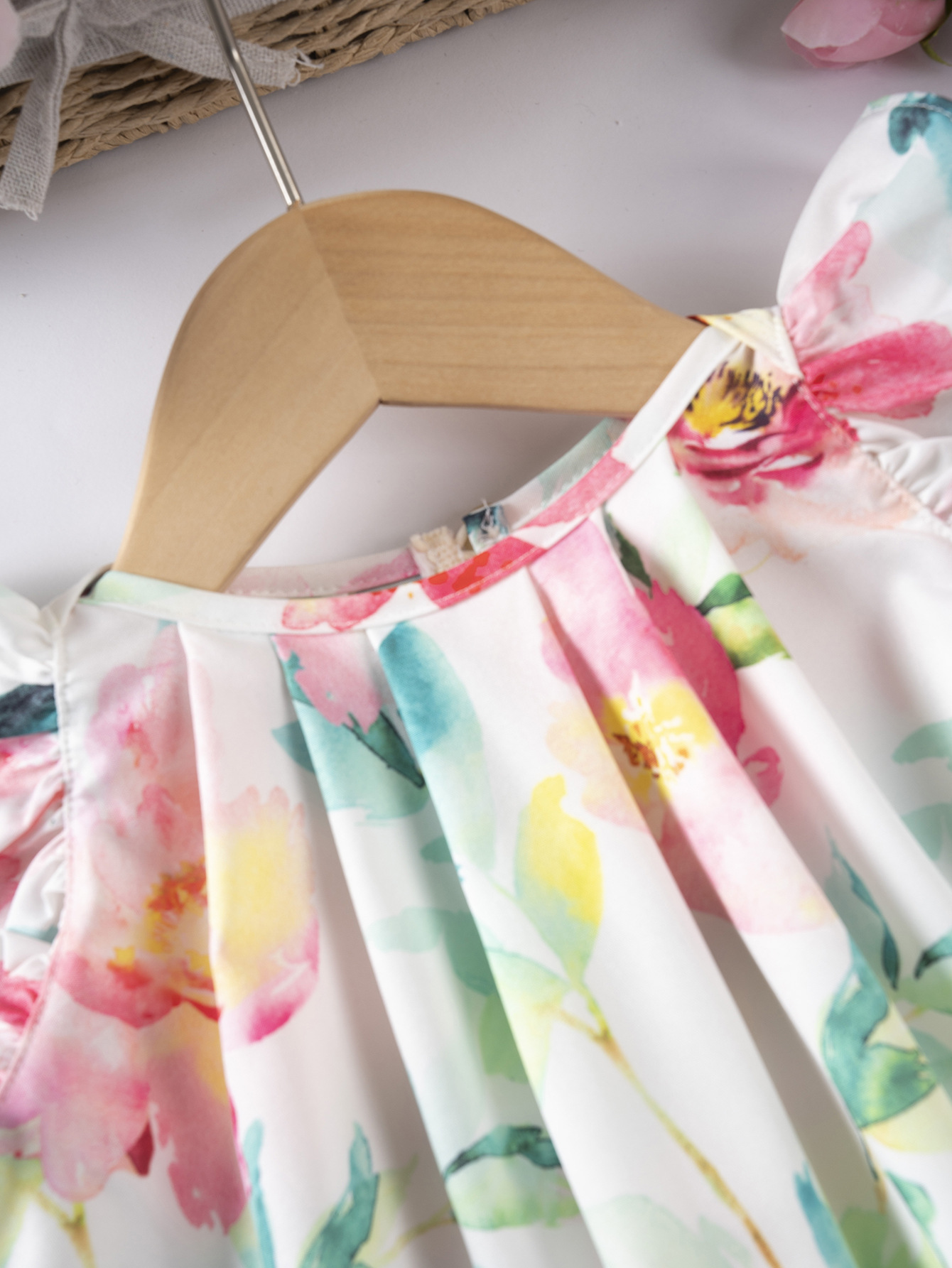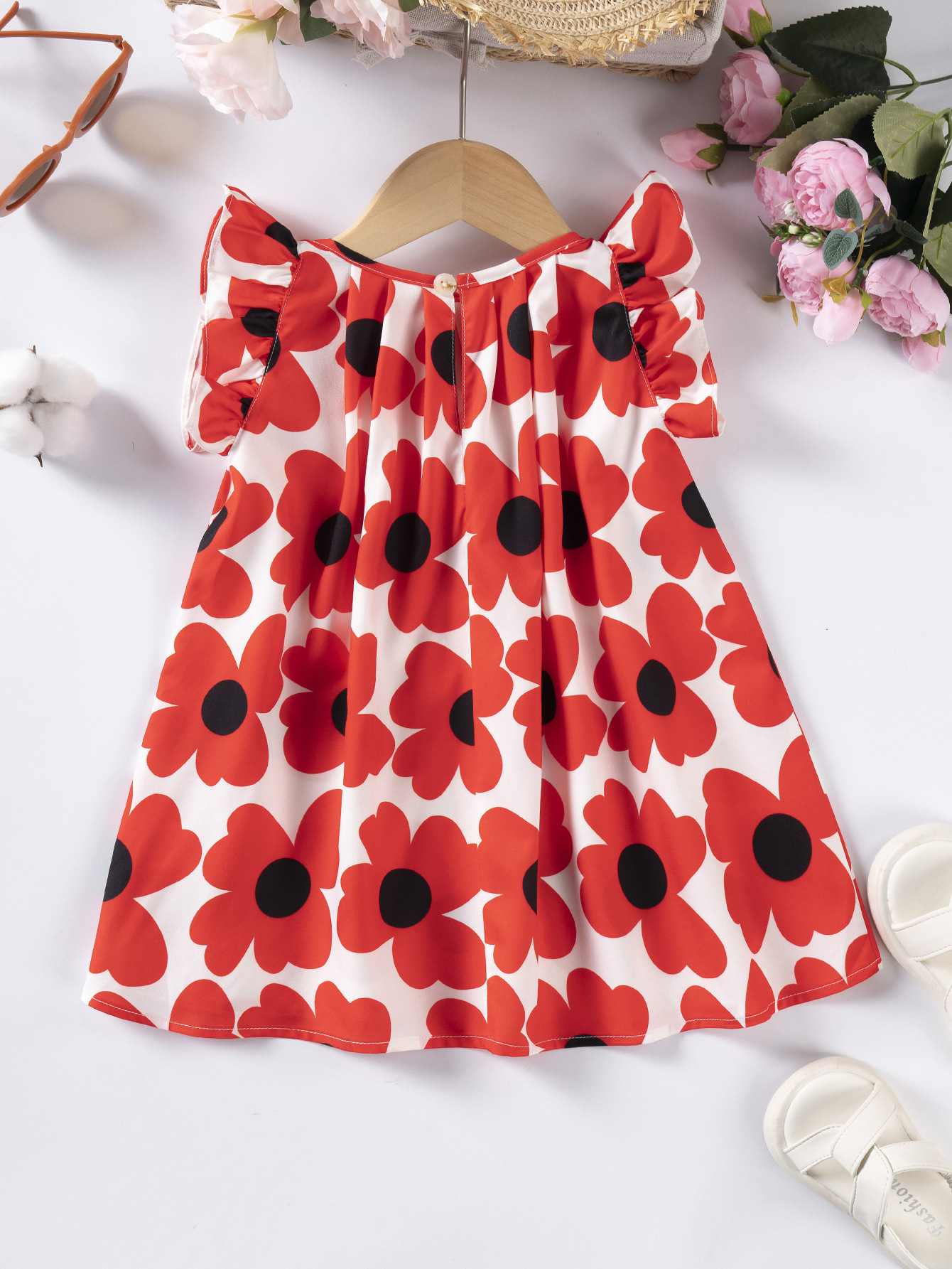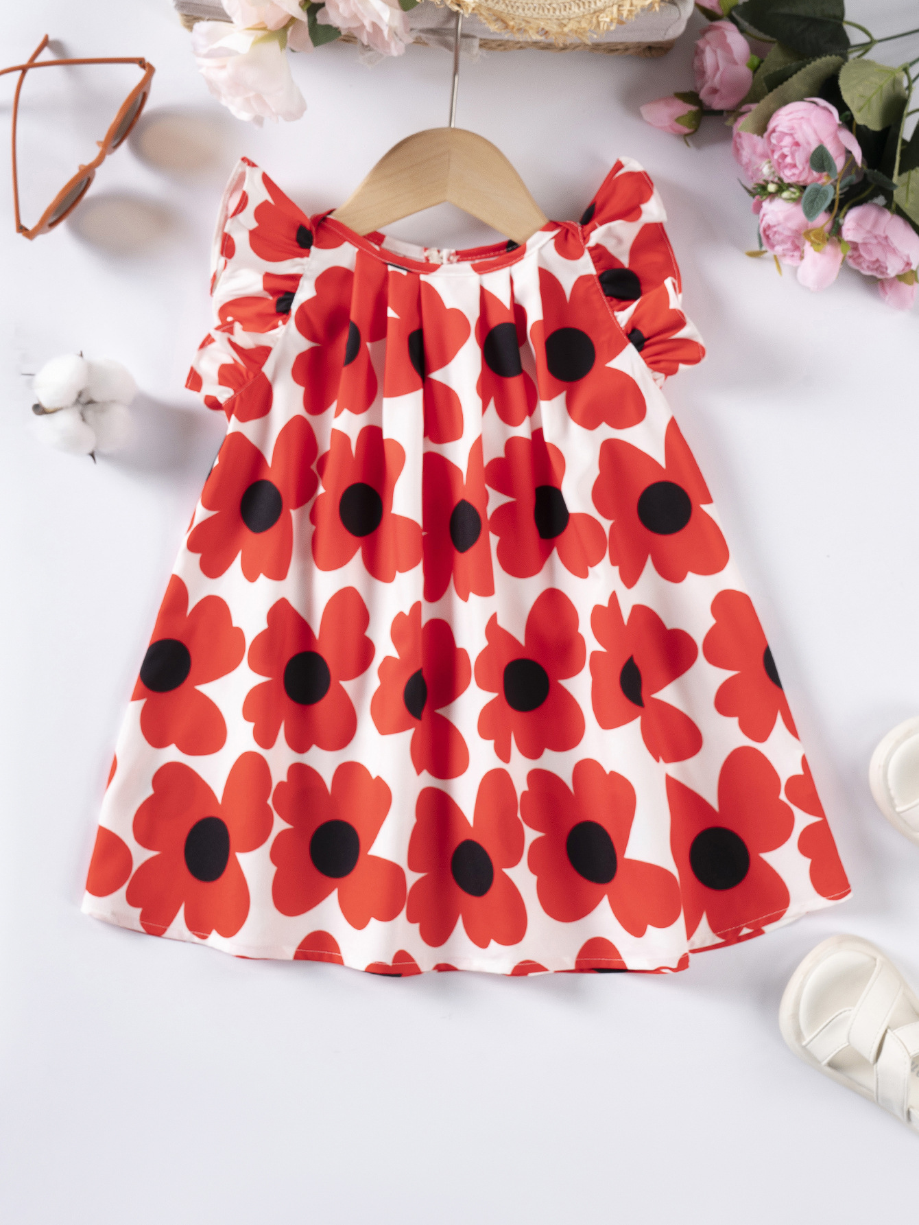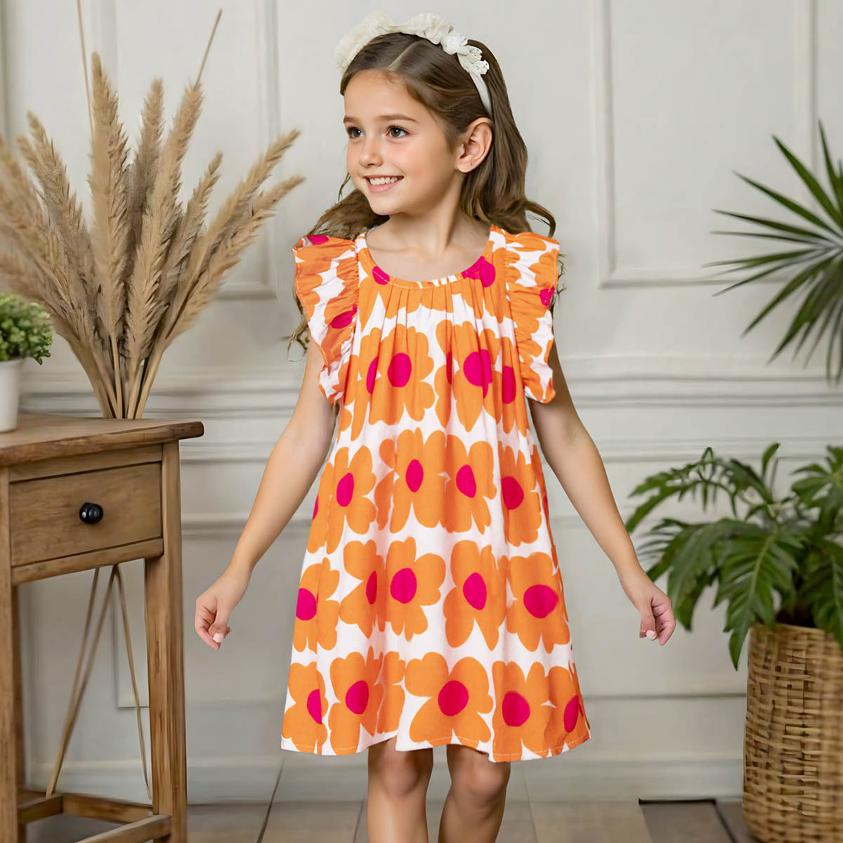 2026 여름 여아 원피스, 귀여운 꽃무늬 프린트, 달콤한 플라잉 슬리브, A라인 스커트, 라운드넥 풀오버 스커트