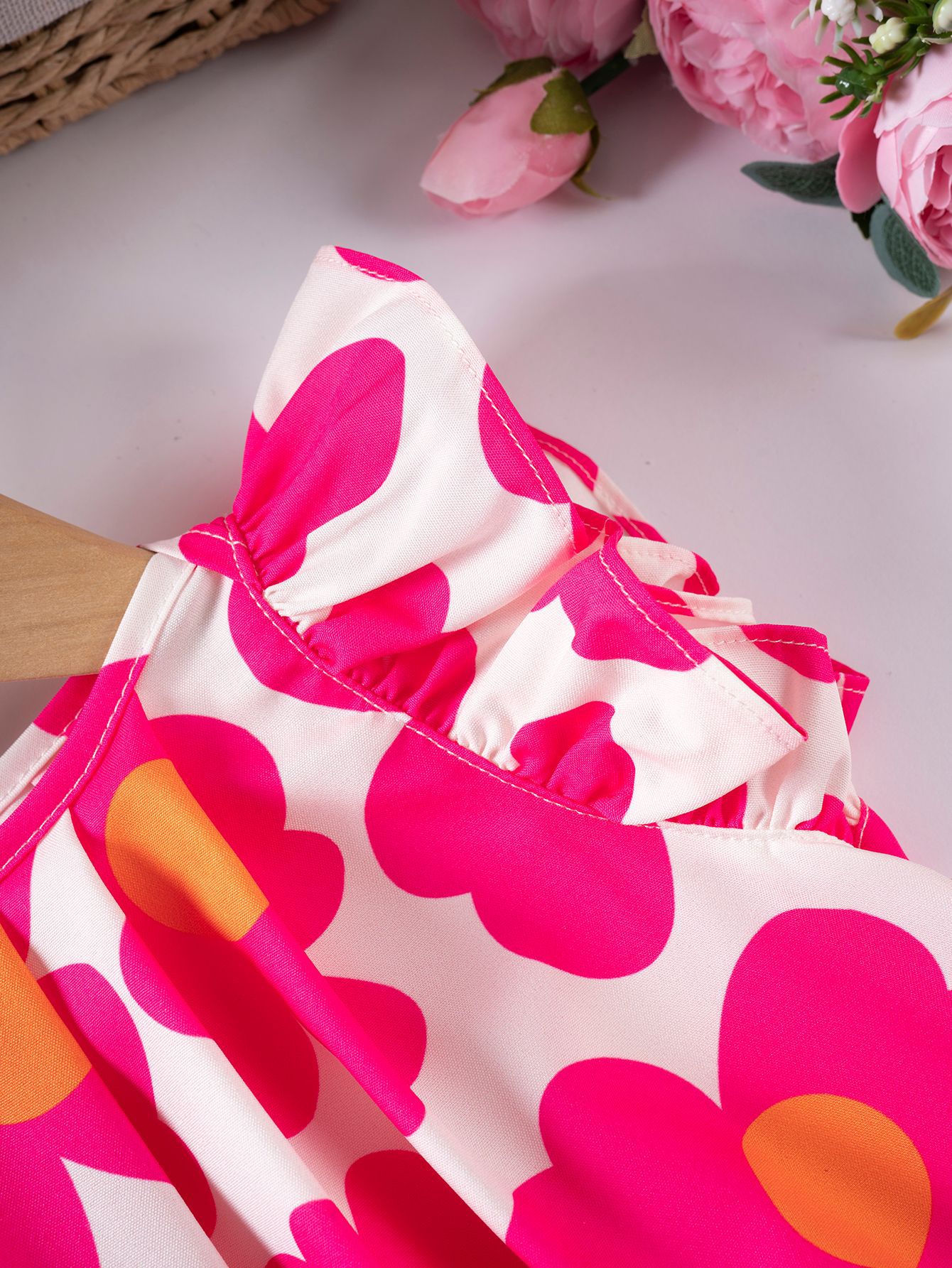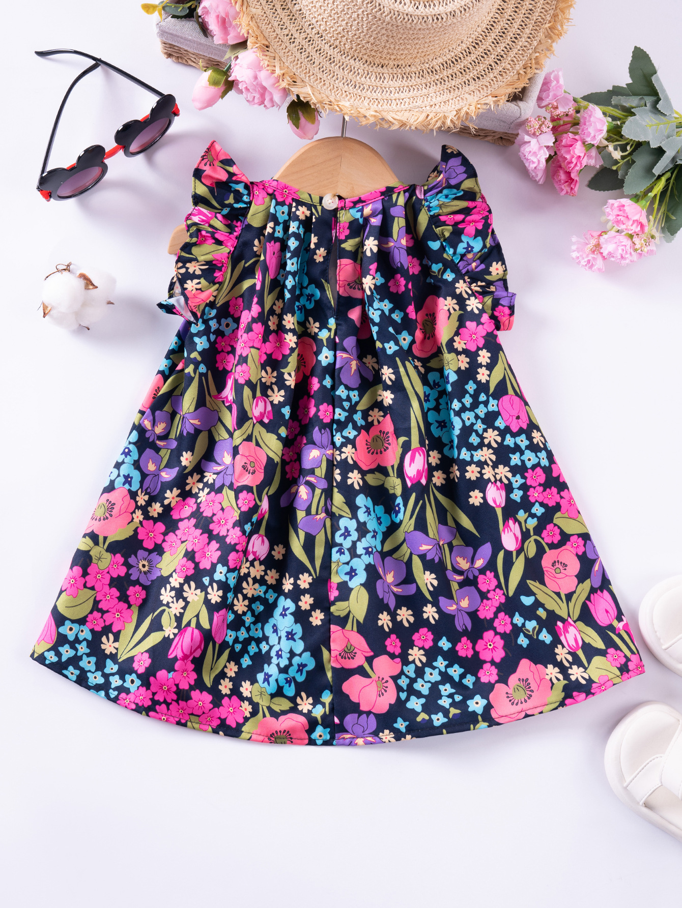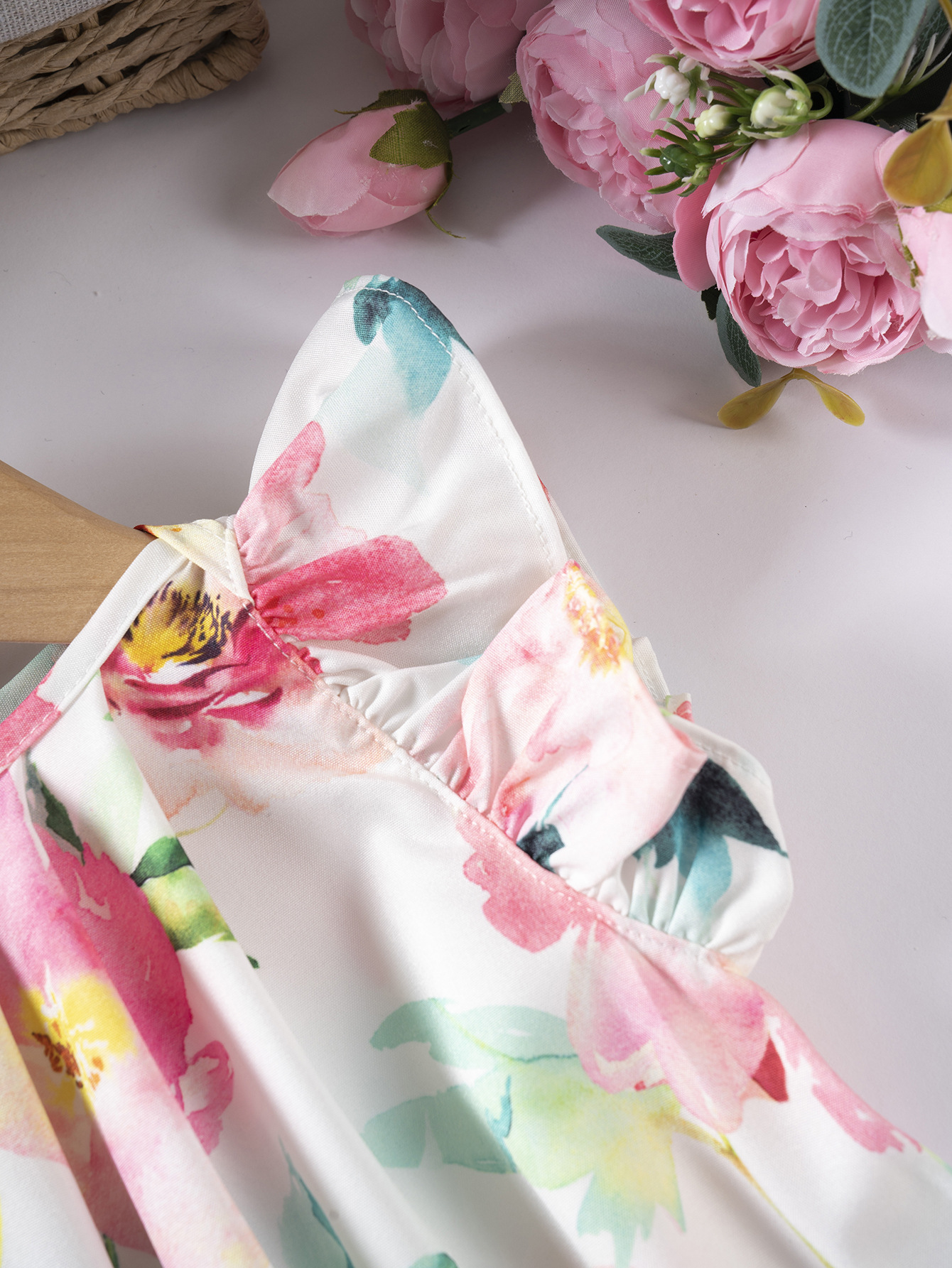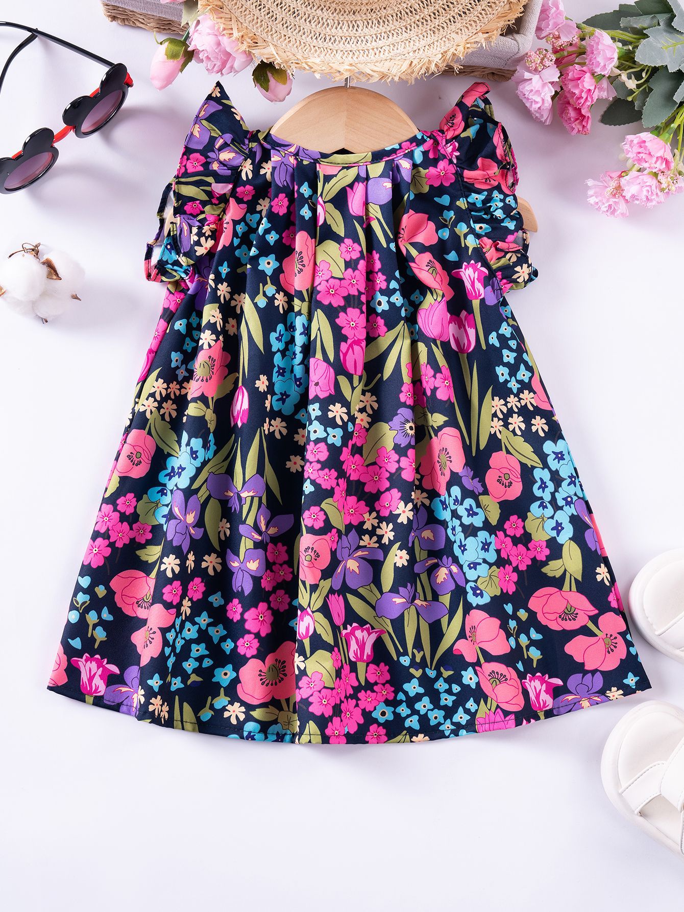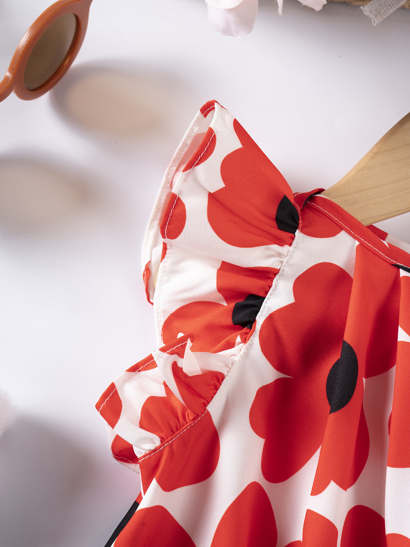 2026 여름 여아 원피스, 귀여운 꽃무늬 프린트, 달콤한 플라잉 슬리브, A라인 스커트, 라운드넥 풀오버 스커트