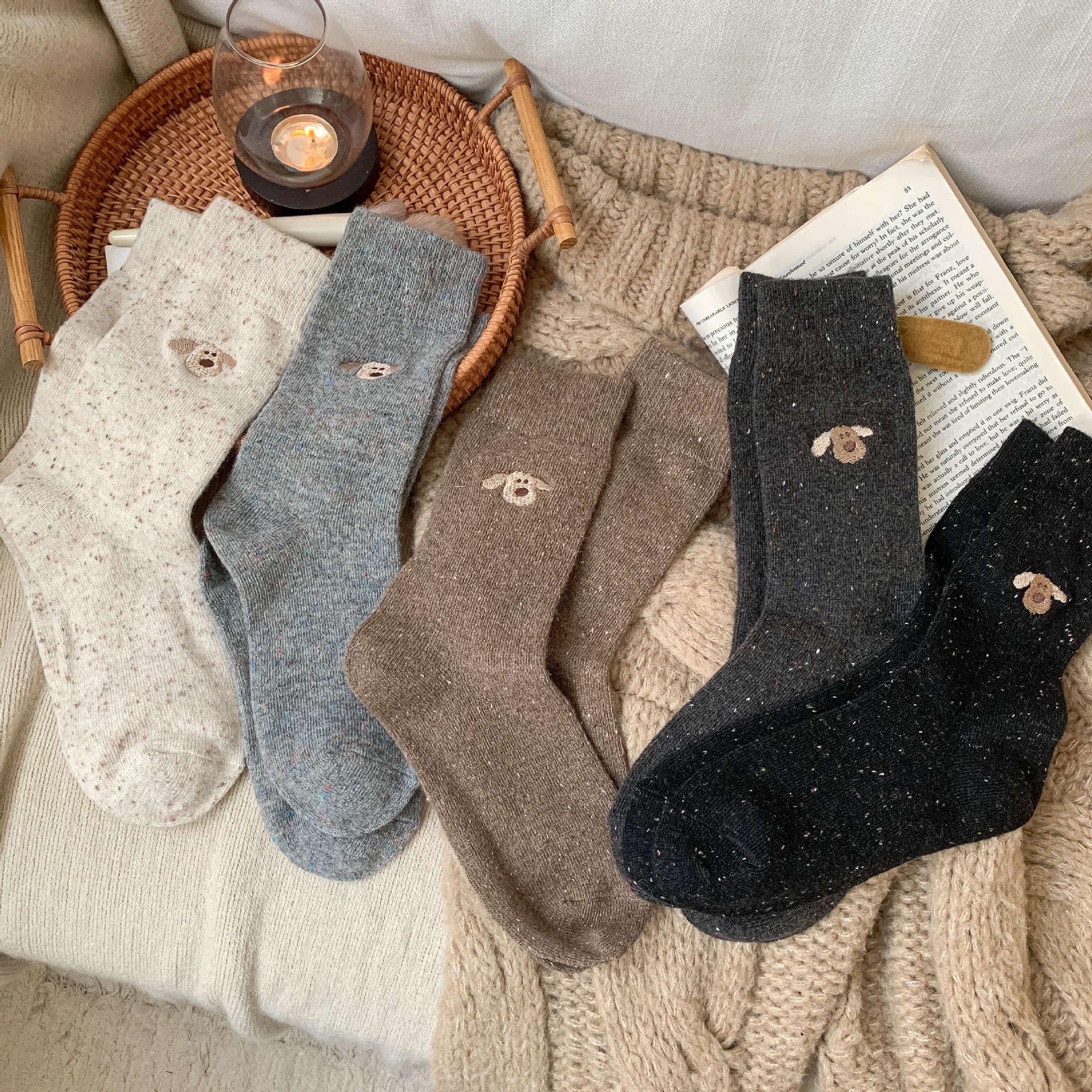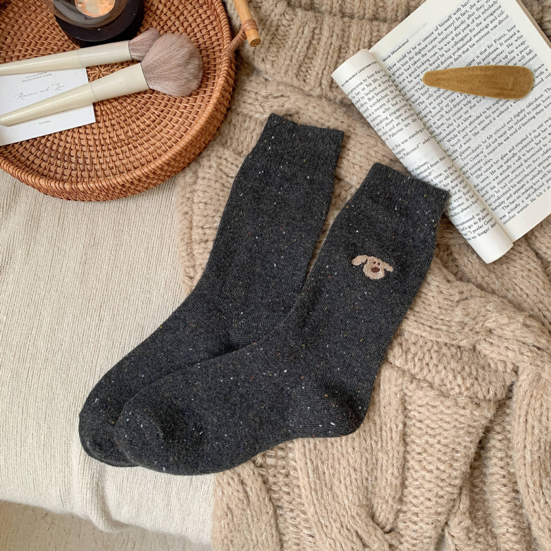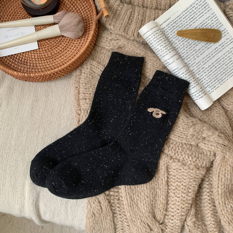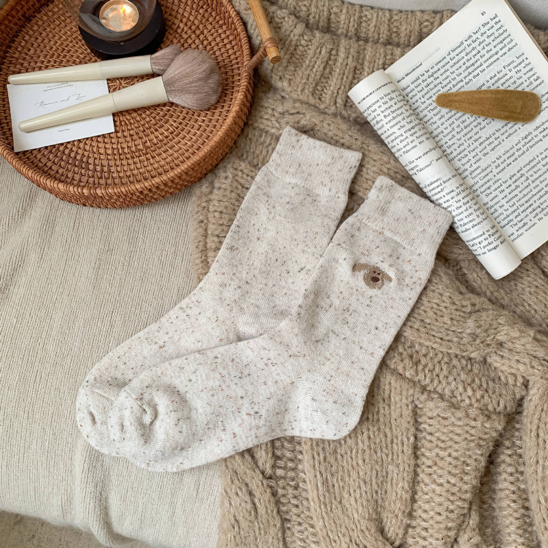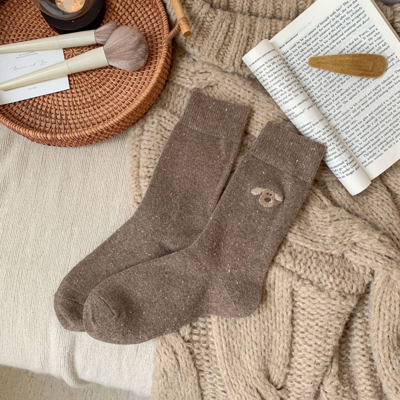 가을 겨울 커피색 니트 양모 양말 여성용 겨울 두꺼운 보온 한국 스타일 귀여운 강아지 인스 중간 길이 양말스토어 가기