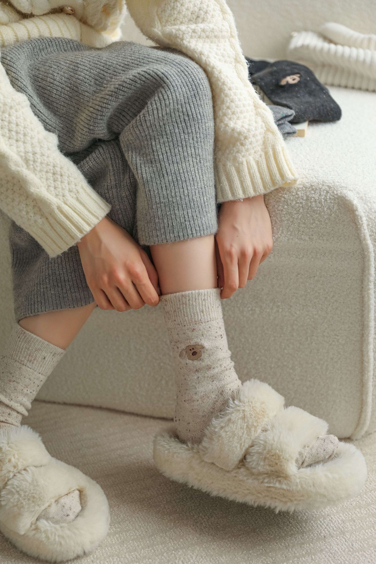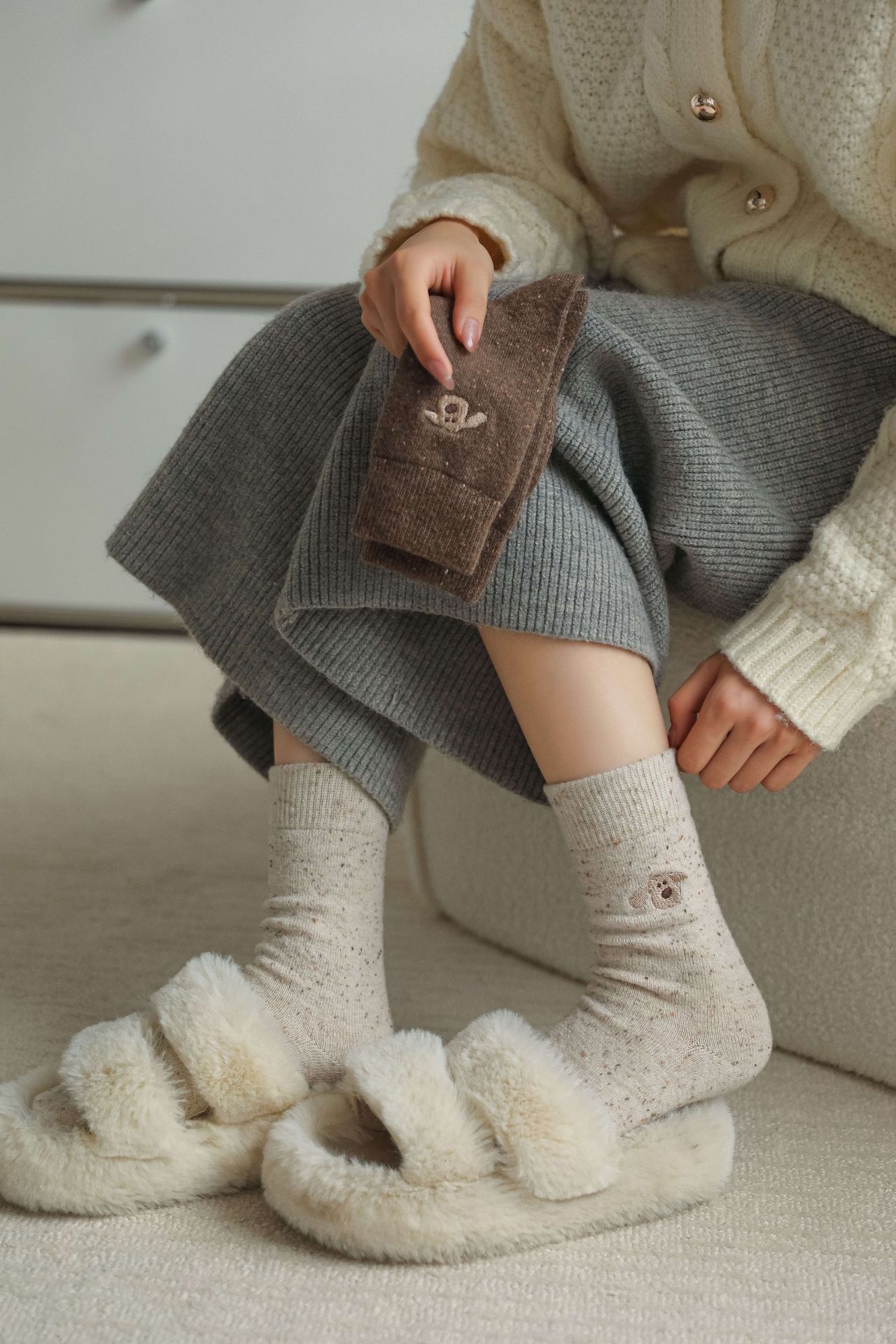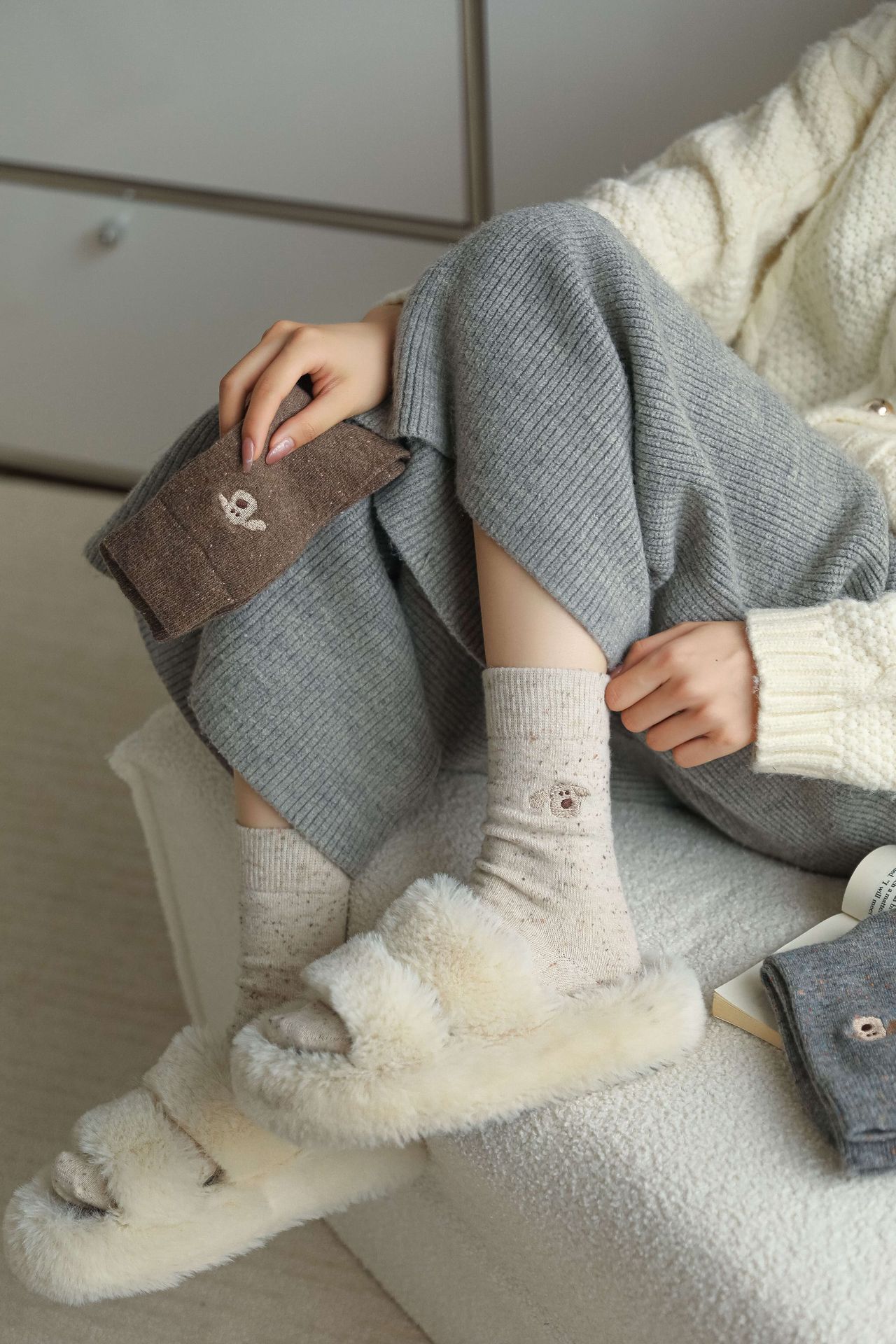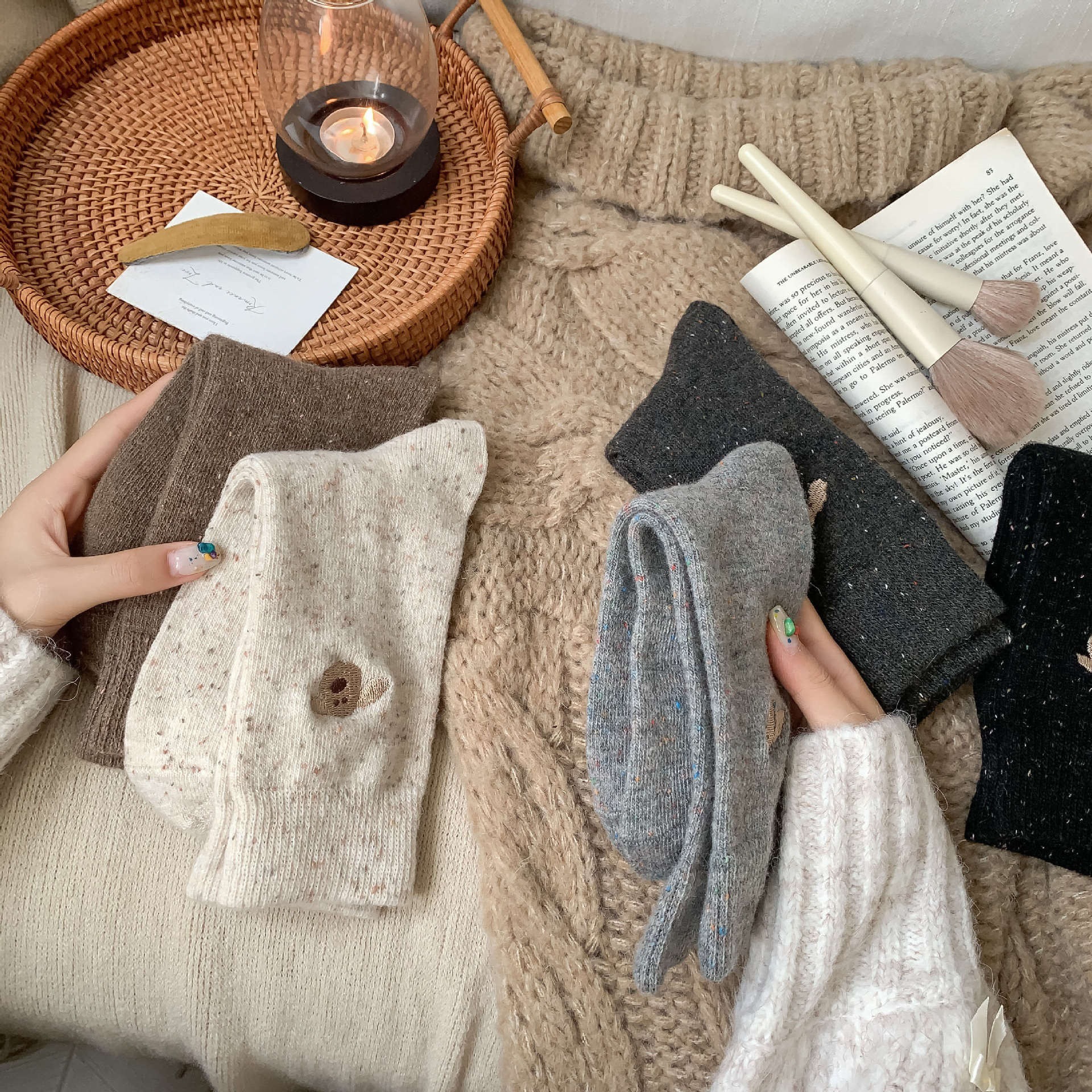가을 겨울 커피색 니트 양모 양말 여성용 겨울 두꺼운 보온 한국 스타일 귀여운 강아지 인스 중간 길이 양말스토어 가기