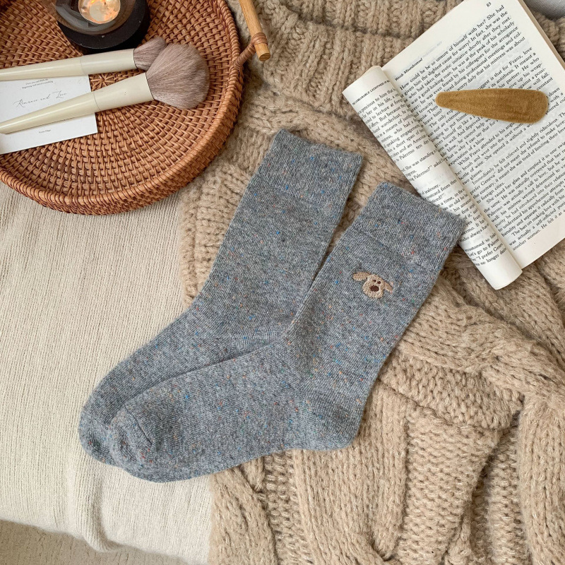 가을 겨울 커피색 니트 양모 양말 여성용 겨울 두꺼운 보온 한국 스타일 귀여운 강아지 인스 중간 길이 양말