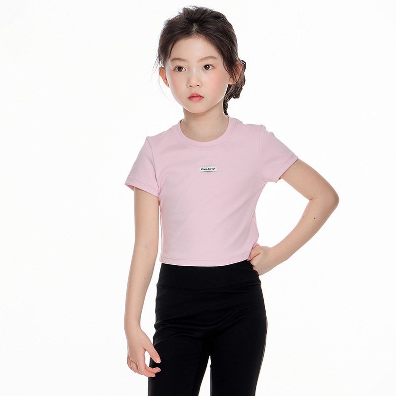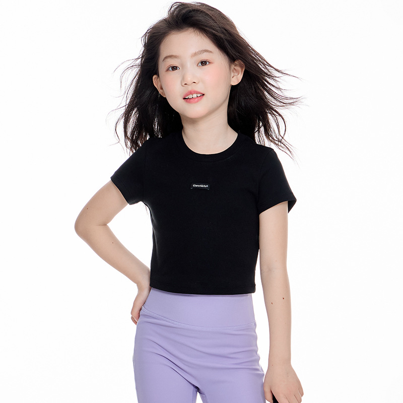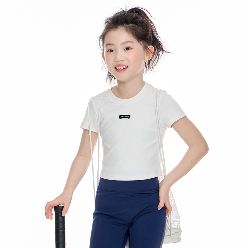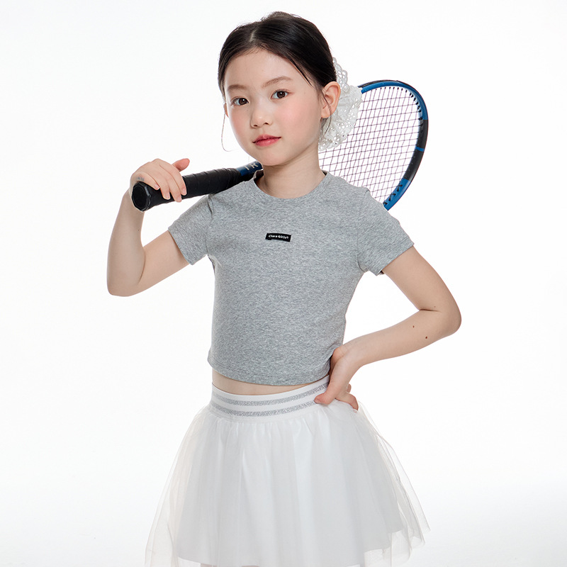 어린이 미우 쿨 반팔 티셔츠 2025 년 여름 신예 소녀 크루 넥 스트레치 올 매치 쇼트 스포츠 탑