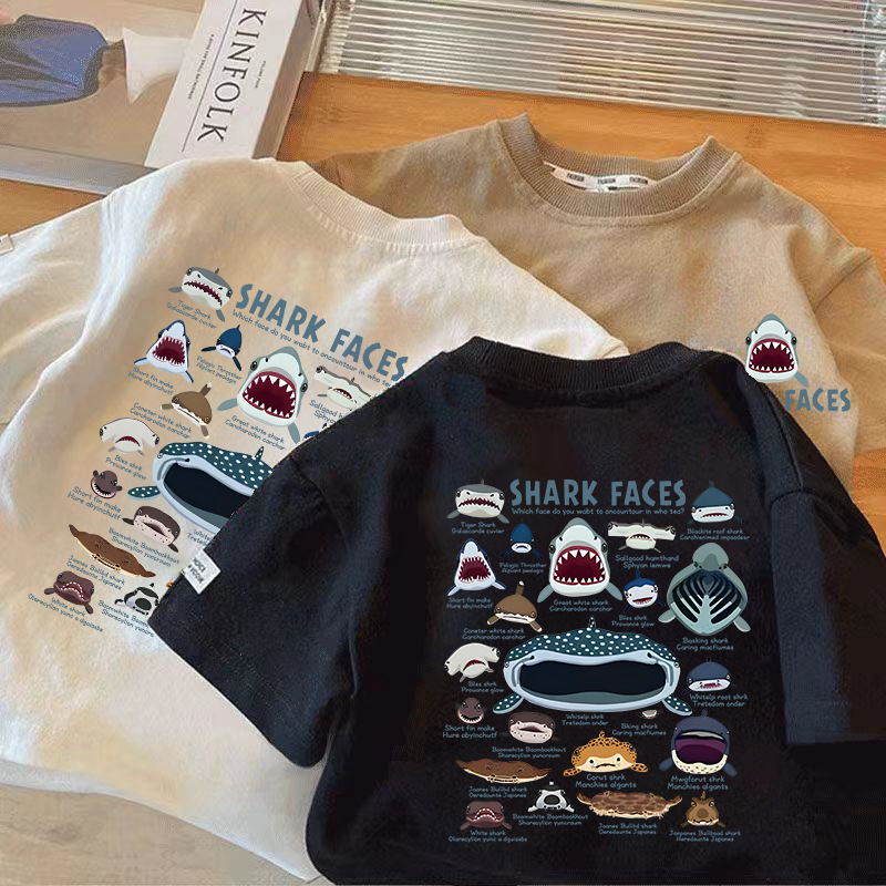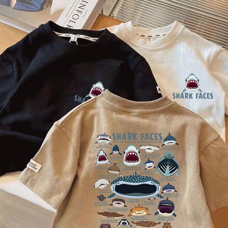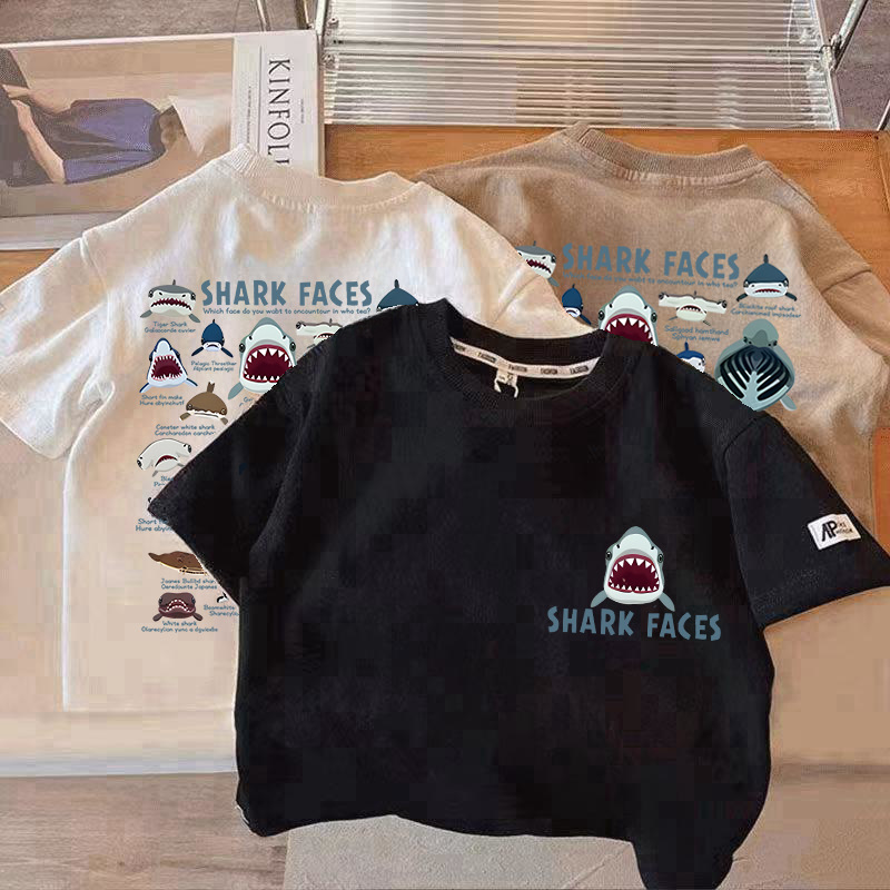 국경 간 아동복 반팔 티셔츠 2025 여름 새 어린이 일본 상어 가족 퓨어 코튼 톱 보이 반팔 티셔츠스토어 가기