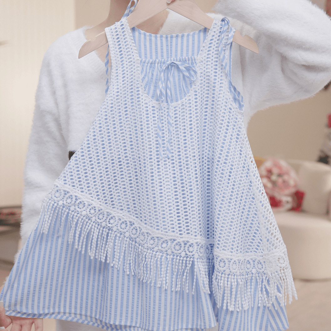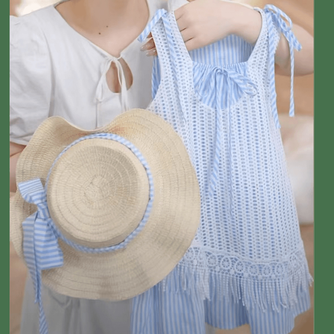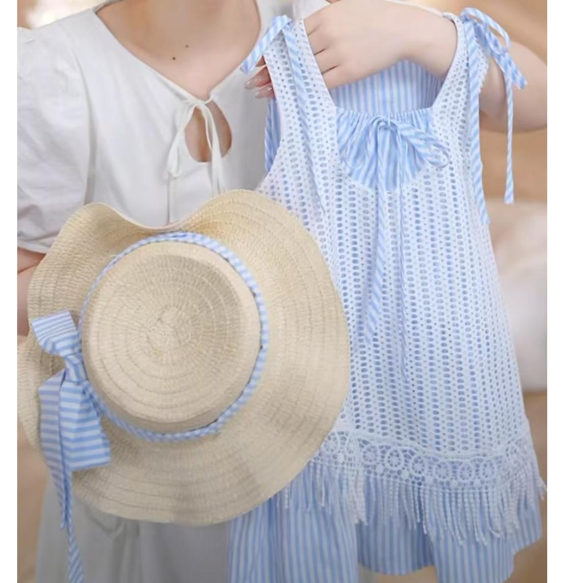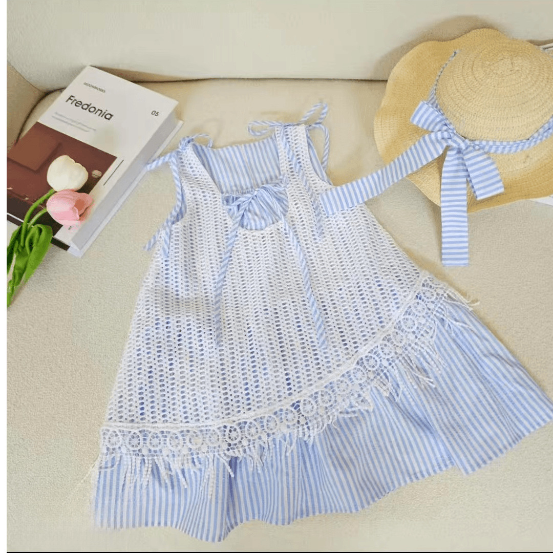 소녀의 줄무늬 원피스 2025 새로운 스타일 가짜 투피스 할로우 블라우스 조끼 원피스 여름 휴가 스타일 비치 원피스
