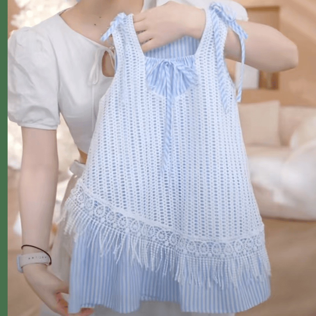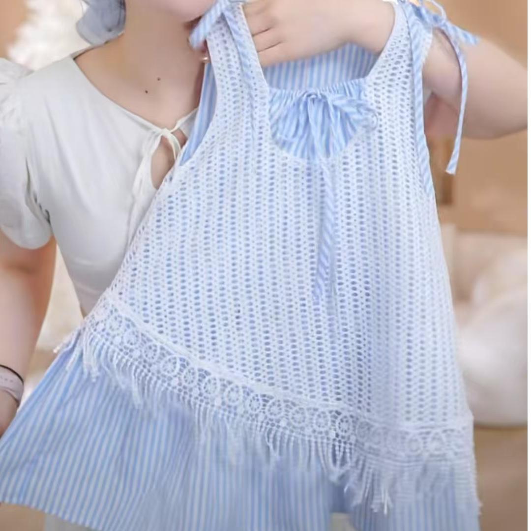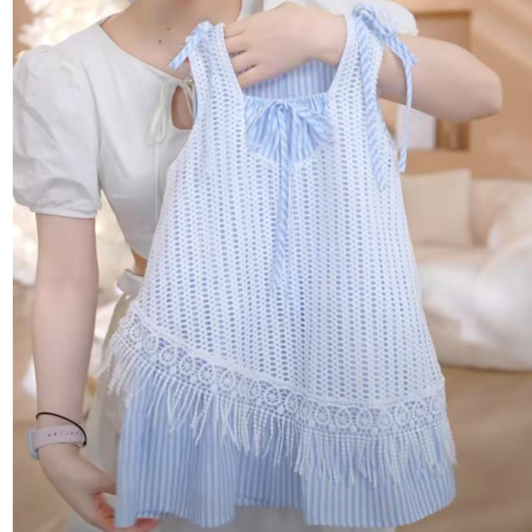 소녀의 줄무늬 원피스 2025 새로운 스타일 가짜 투피스 할로우 블라우스 조끼 원피스 여름 휴가 스타일 비치 원피스스토어 가기