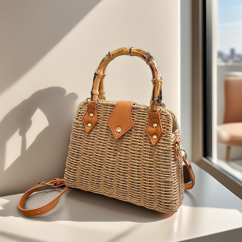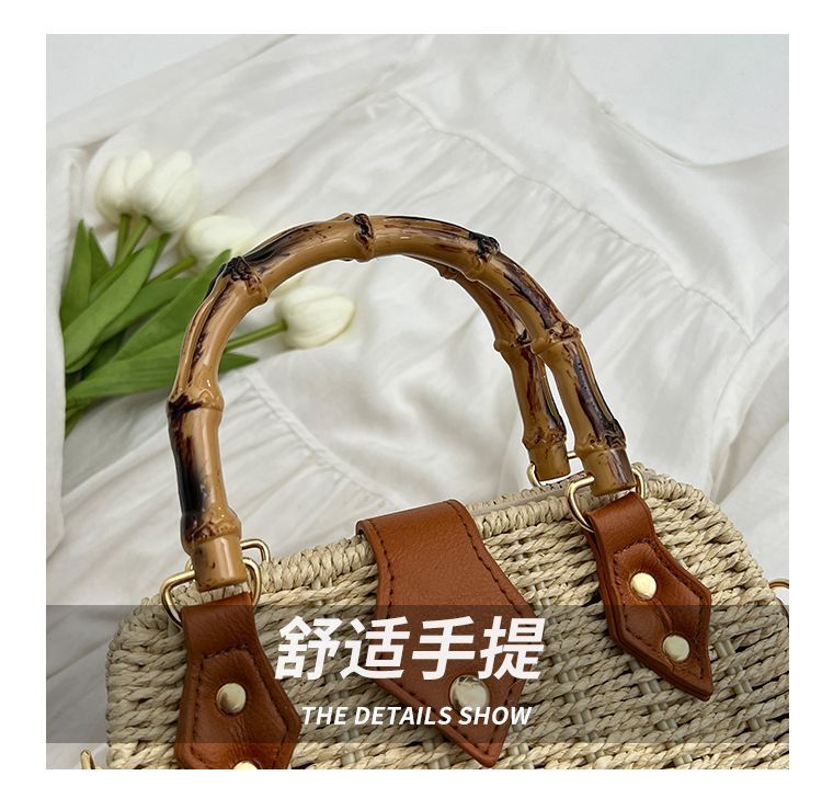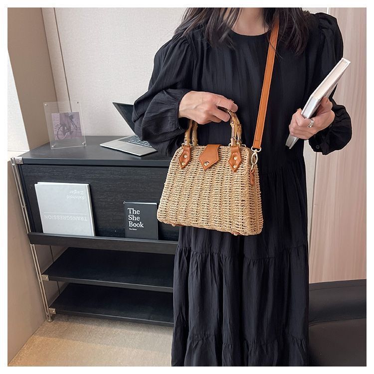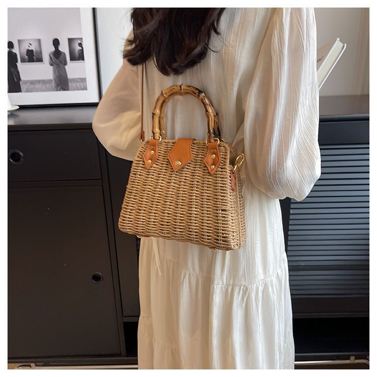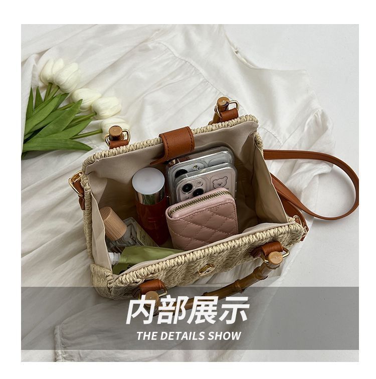 인기있는 스타일 고급 밀짚 가방 라이트 럭셔리 대나무 핸드 헬드 스퀘어 백 수제 짠 가방 아이언 프레임 크로스 백 숄더 백스토어 가기