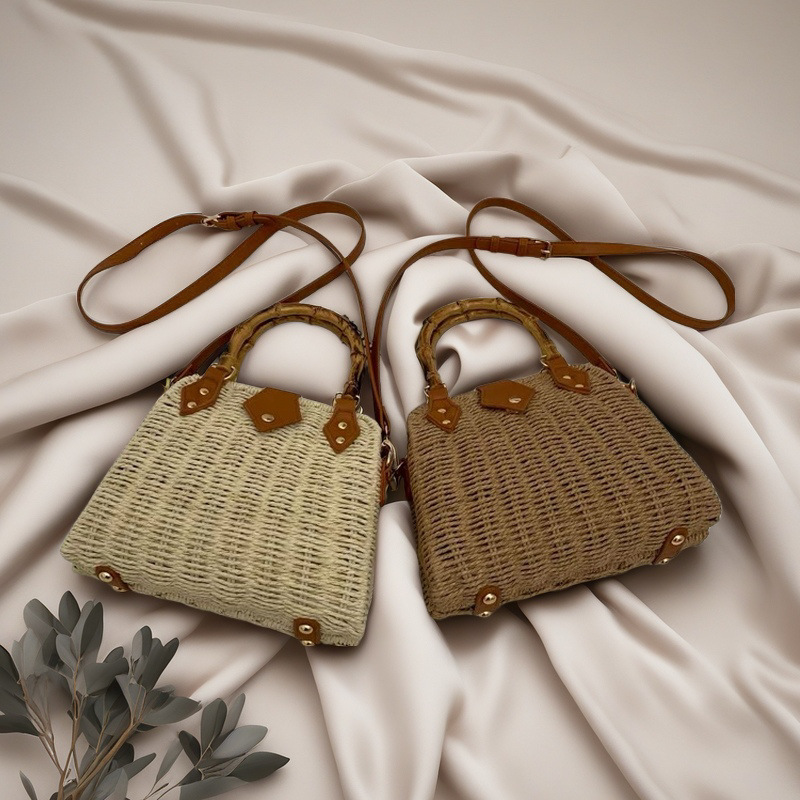인기있는 스타일 고급 밀짚 가방 라이트 럭셔리 대나무 핸드 헬드 스퀘어 백 수제 짠 가방 아이언 프레임 크로스 백 숄더 백