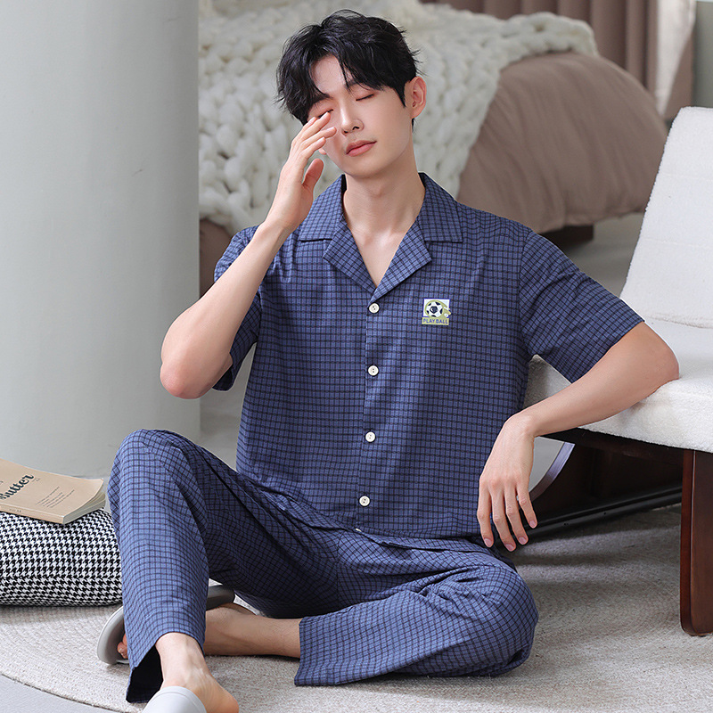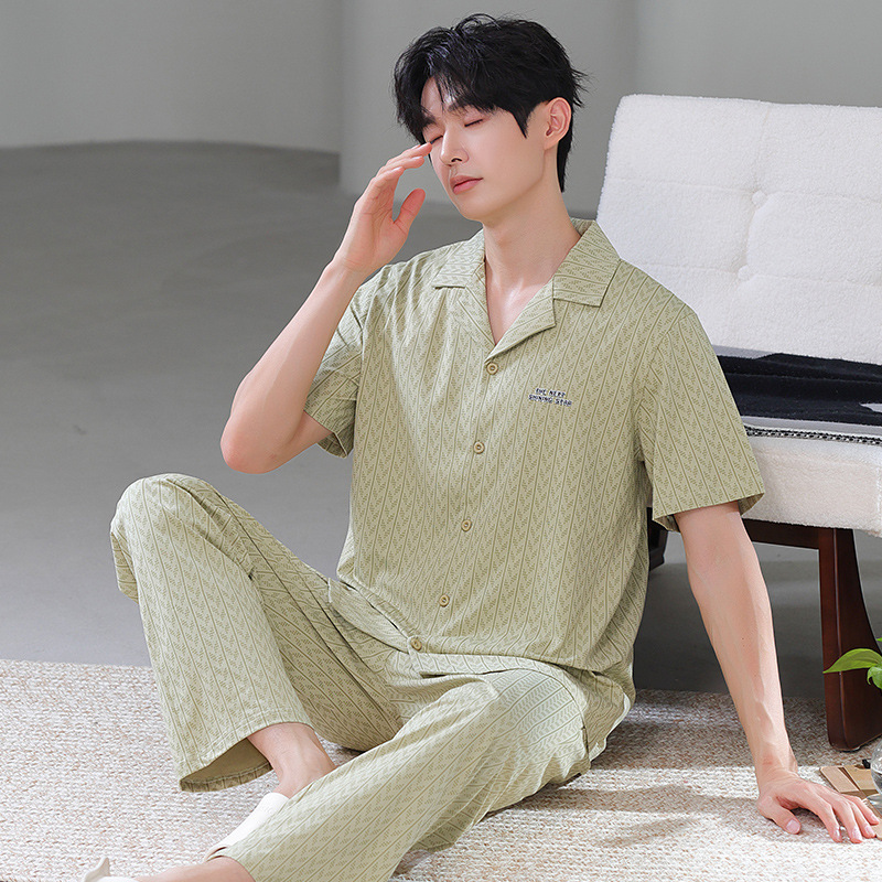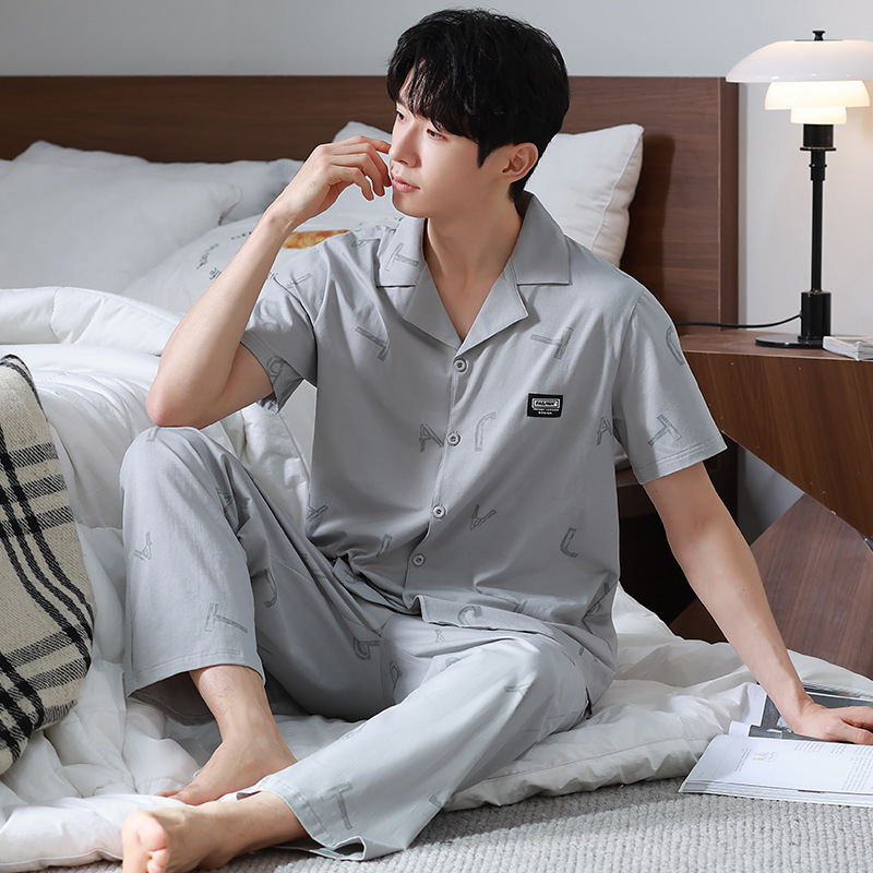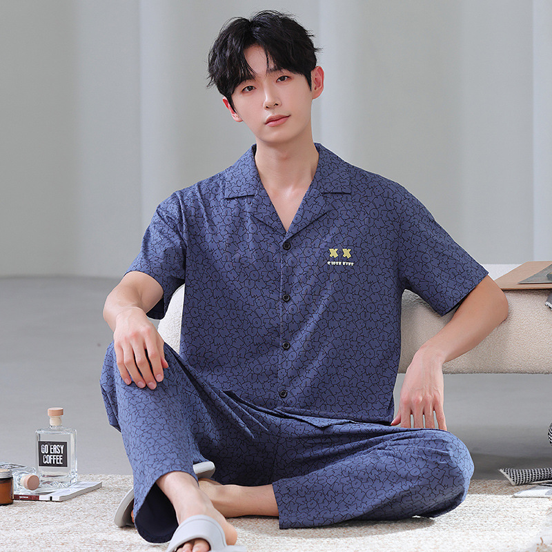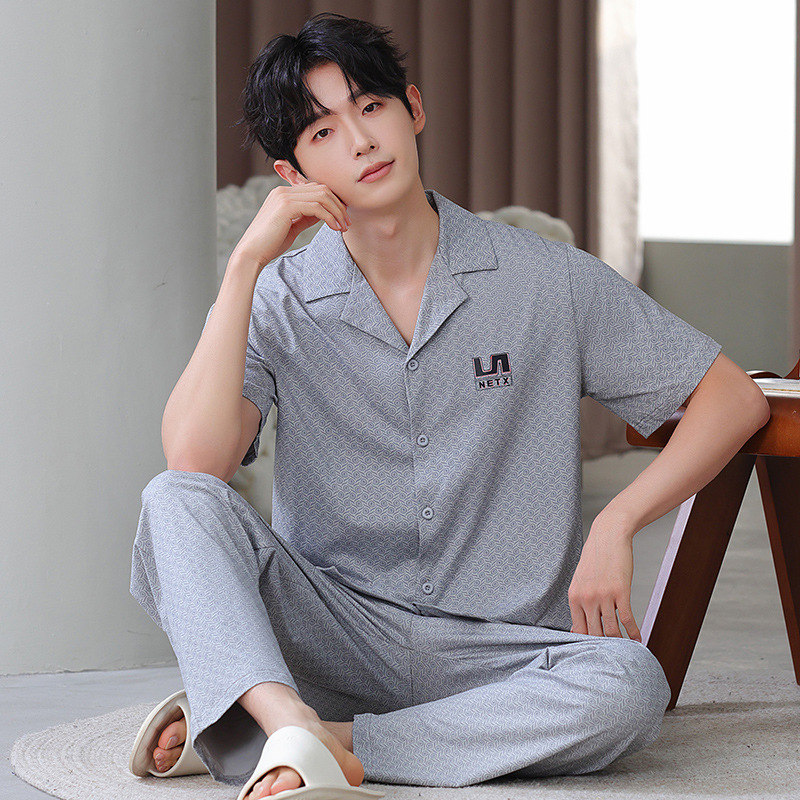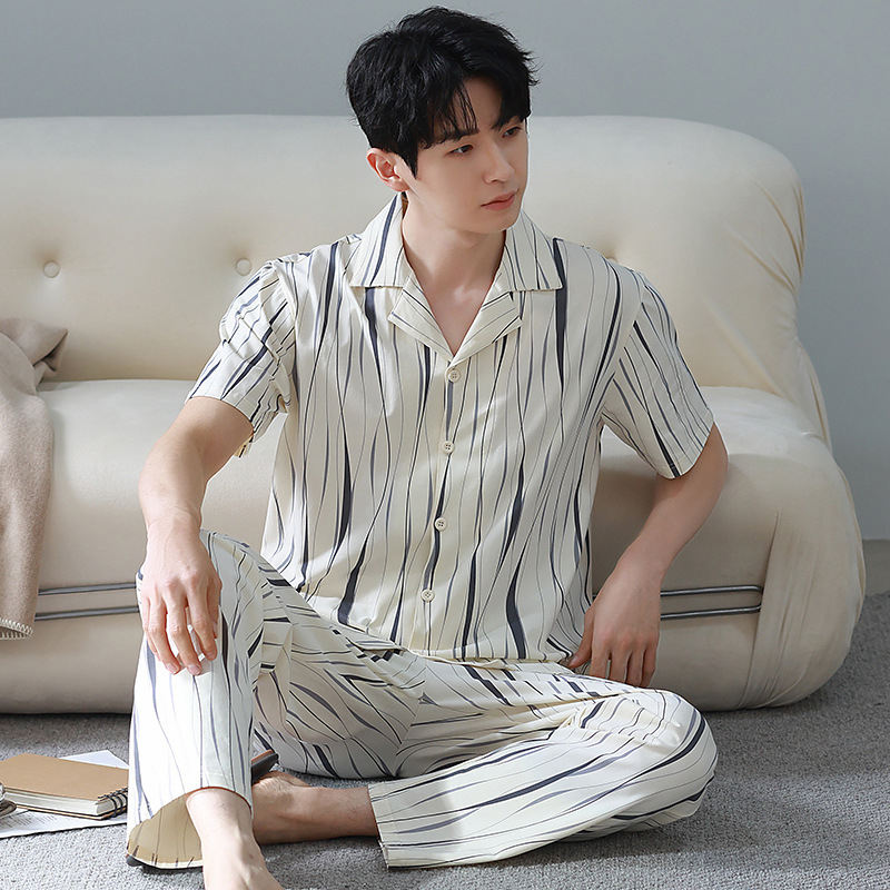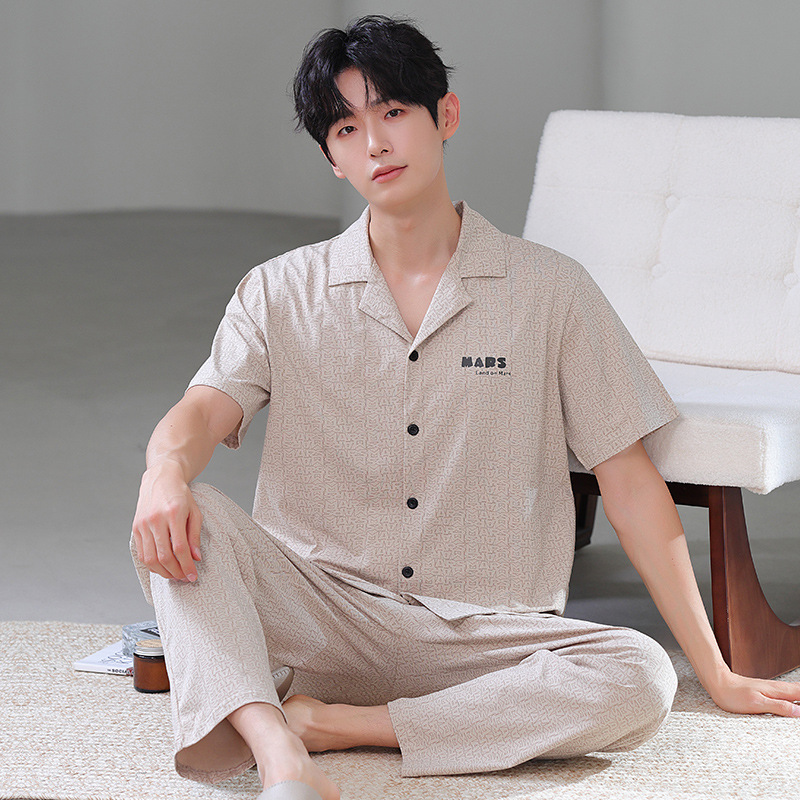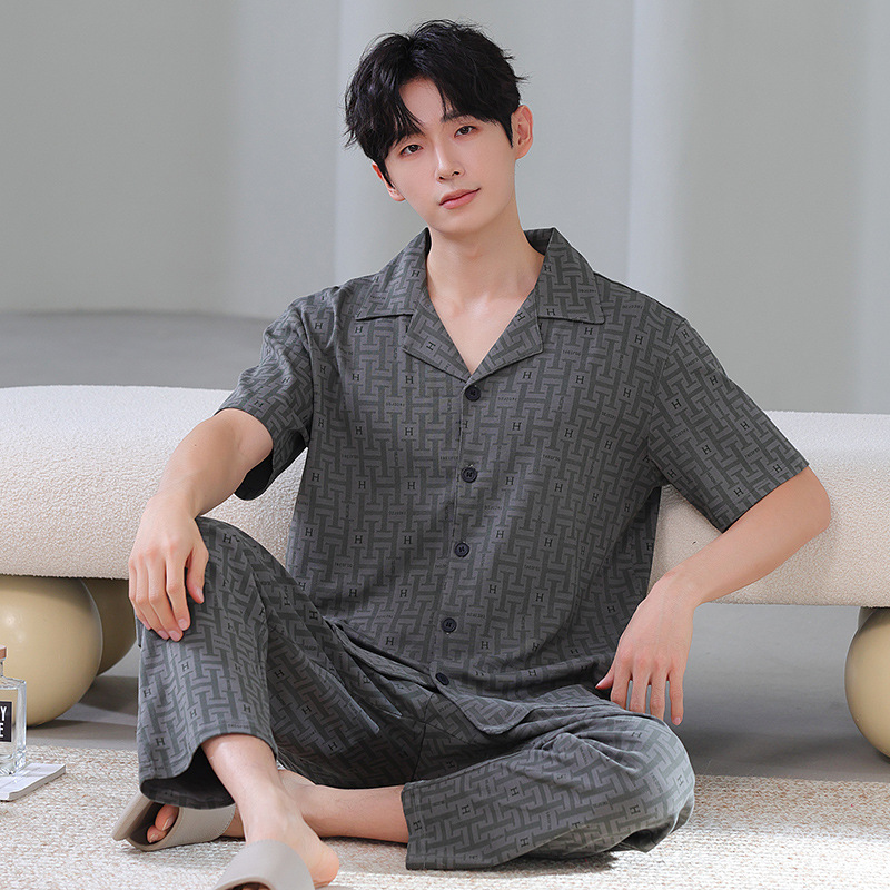 공장 직접 판매 여름 신제품 남성용 잠옷 간단하고 편안한 반팔 바지 홈웨어 세트는 외부에서 착용 가능스토어 가기