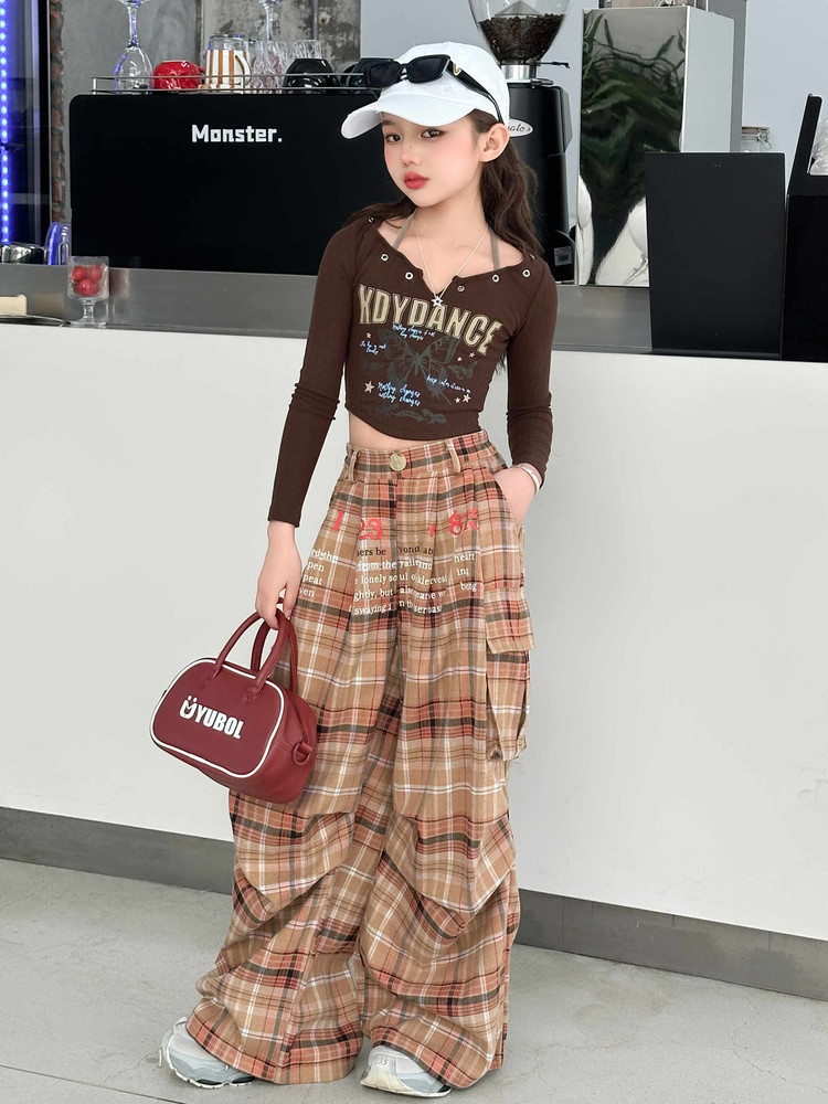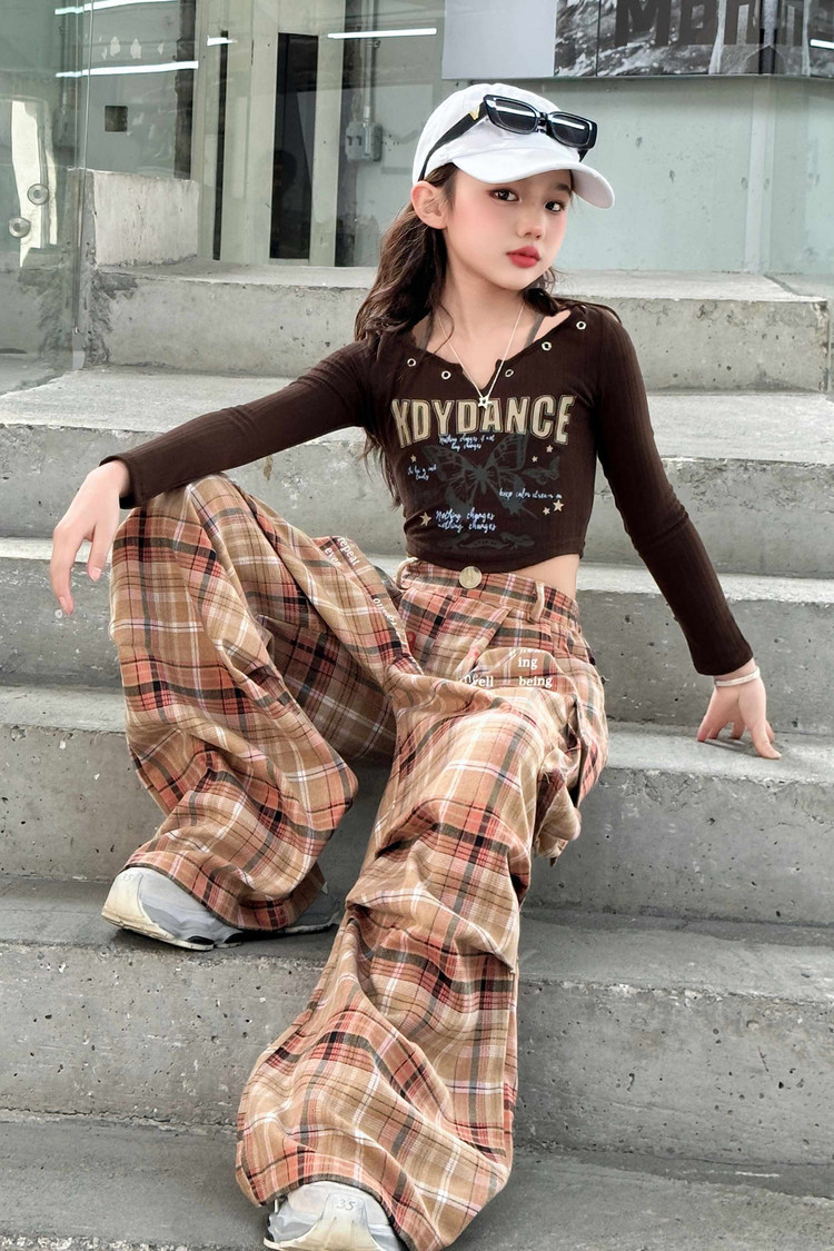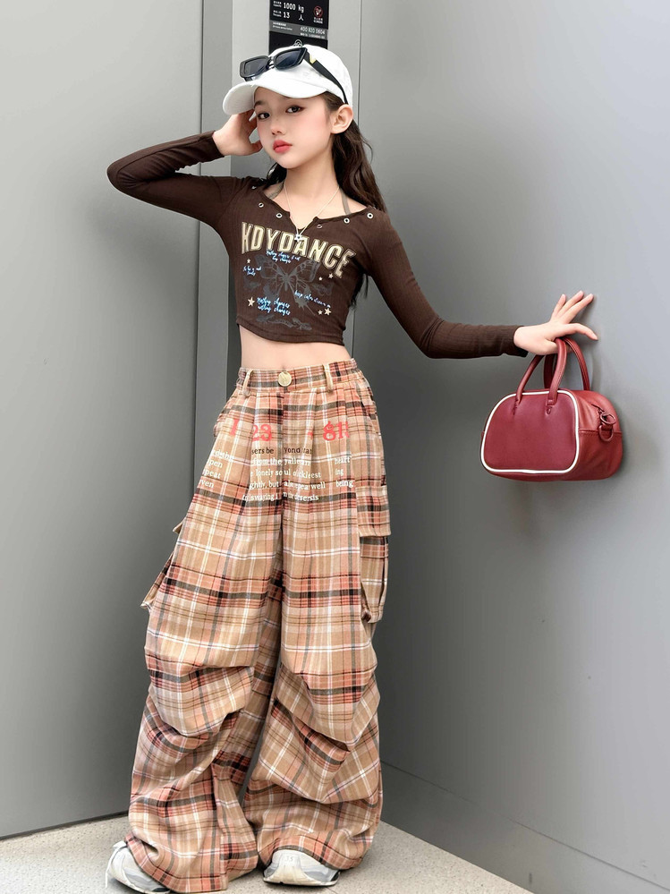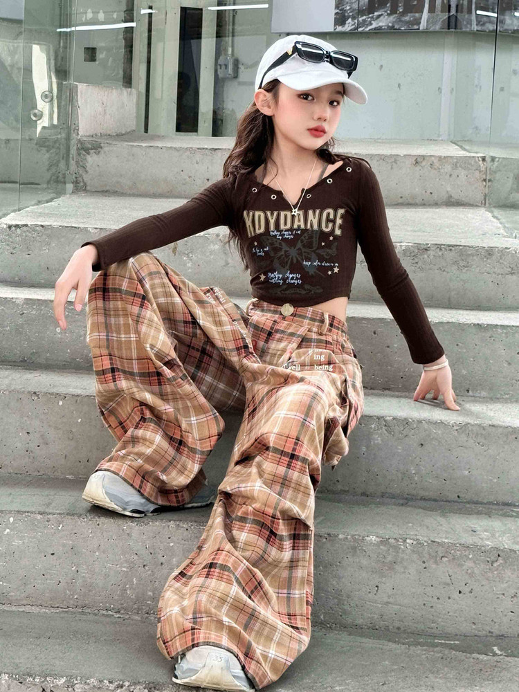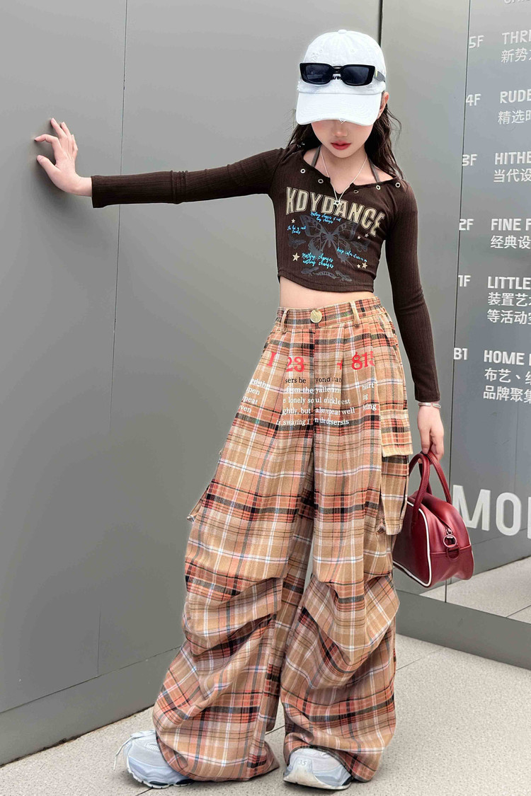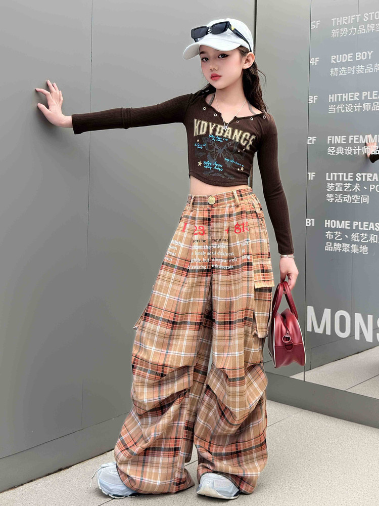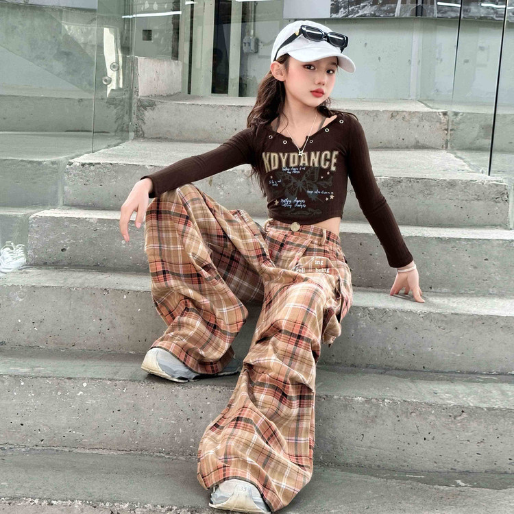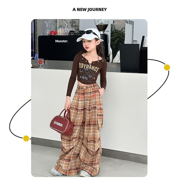 여아 트렌디 쿨 슈트, 여름옷, 중대형 아동 캐주얼 체크무늬 바지, 한국식 긴팔 하의 셔츠, 핫걸 투피스 세트