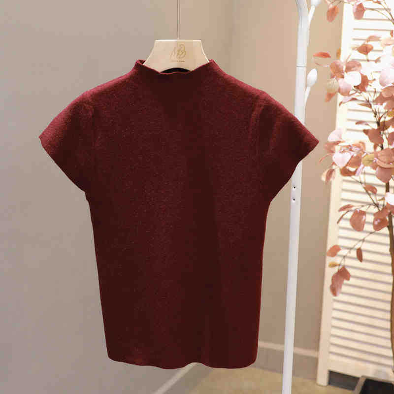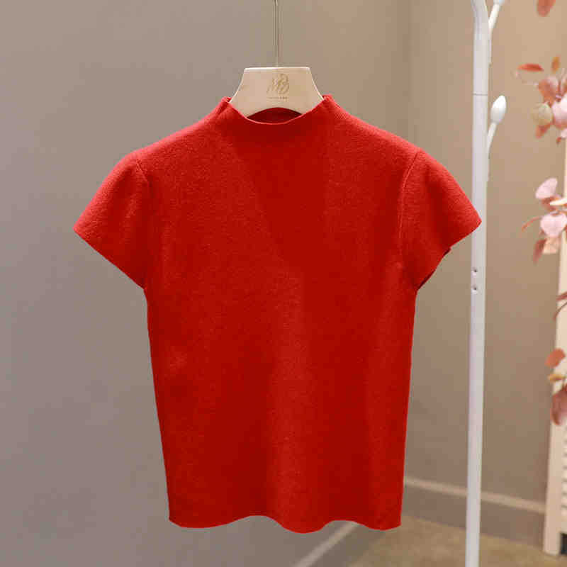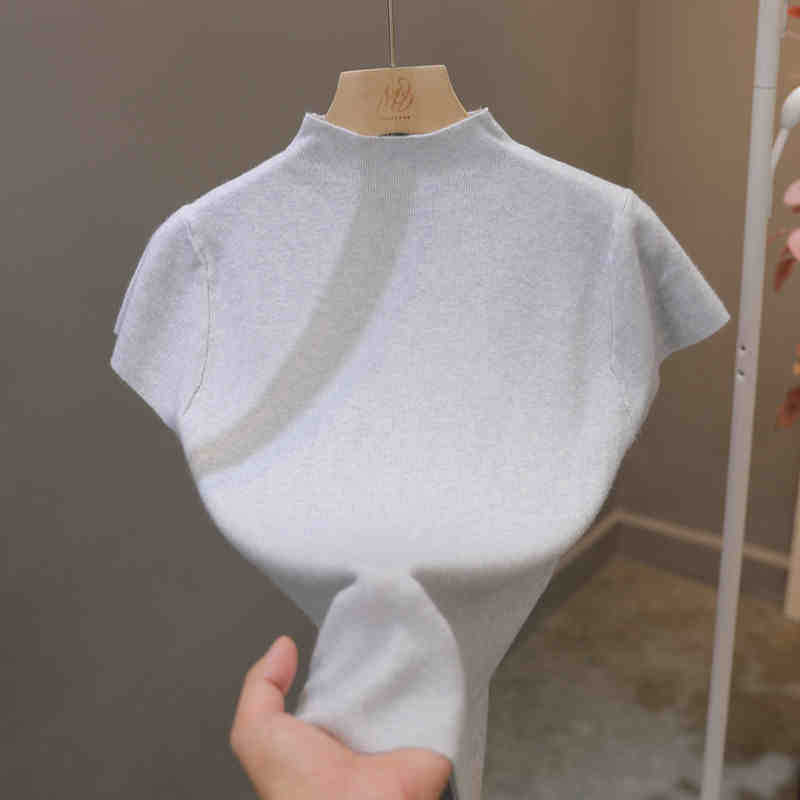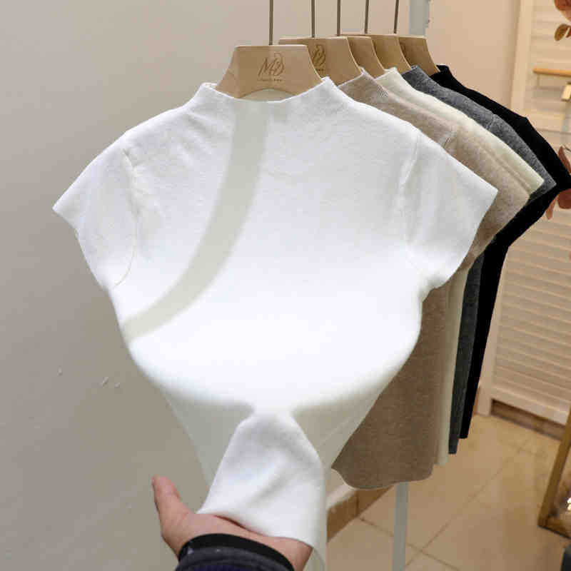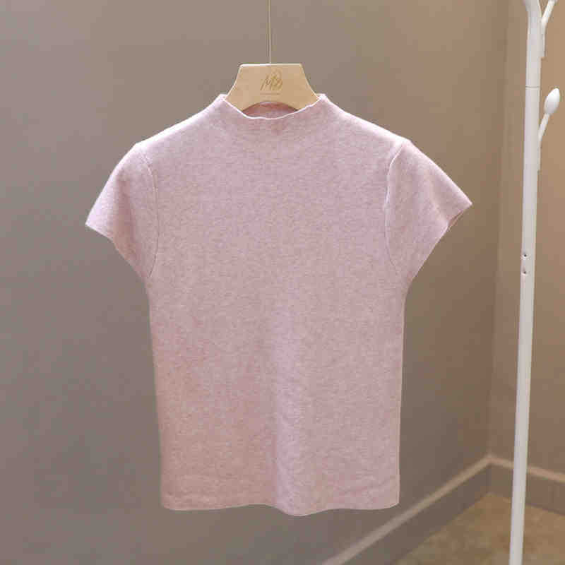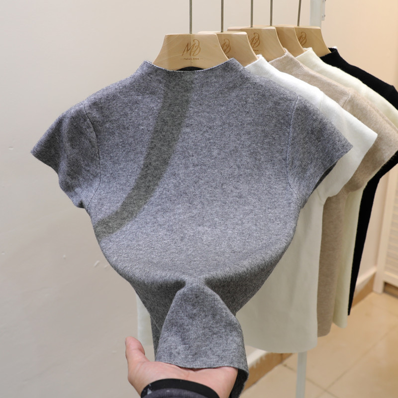 코어 스핀 원사 오리지널 하프 하이 넥 반팔 티셔츠 여성용 니트 베이스 셔츠 디자인 센스 화이트 슬림 핏 탑
