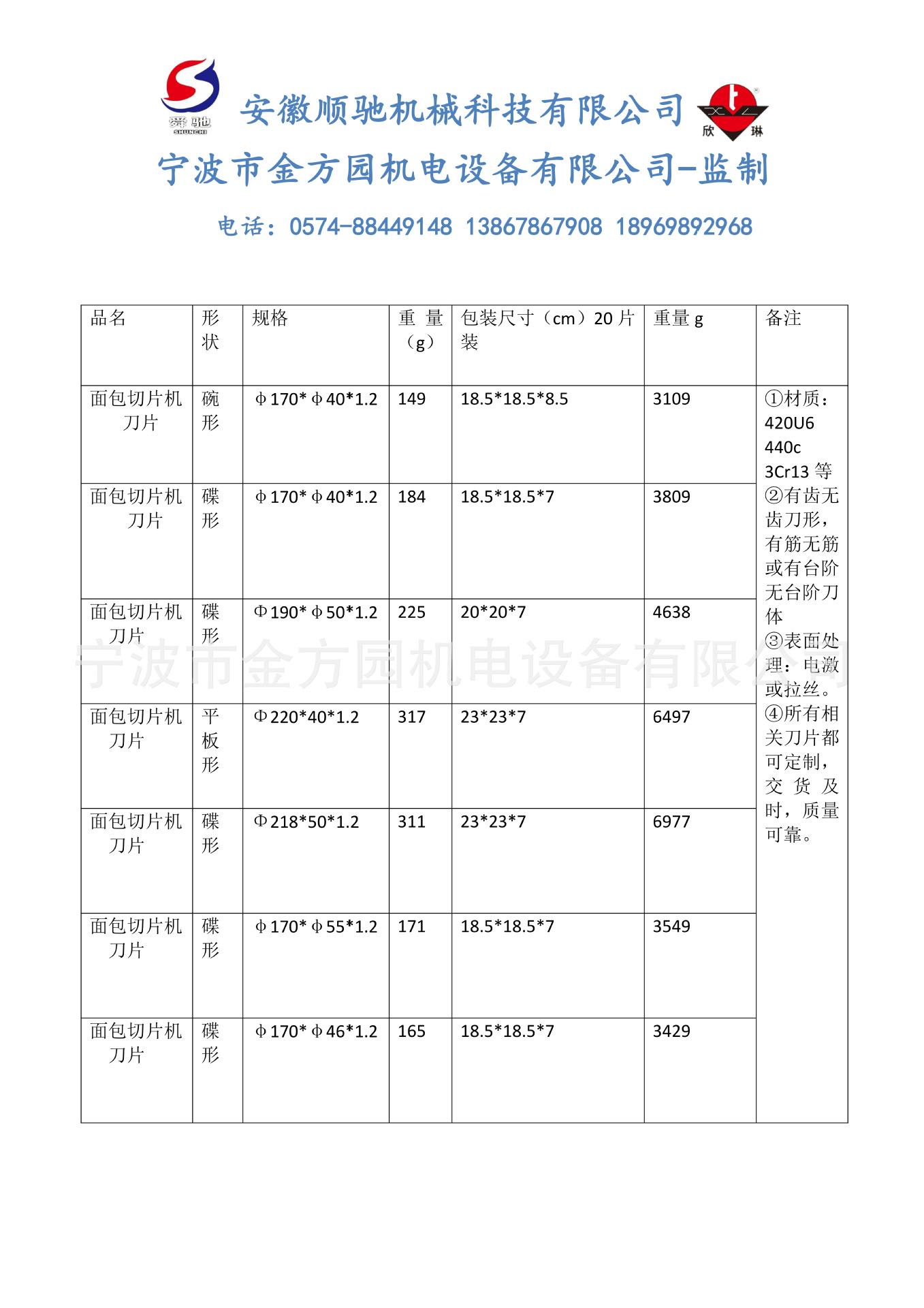 我们选用优质420U6不锈钢材质,其含碳量高,硬度优于304,耐磨性好,防锈效果家佳的特性。广泛应用于中高端商用切片机配套使用。