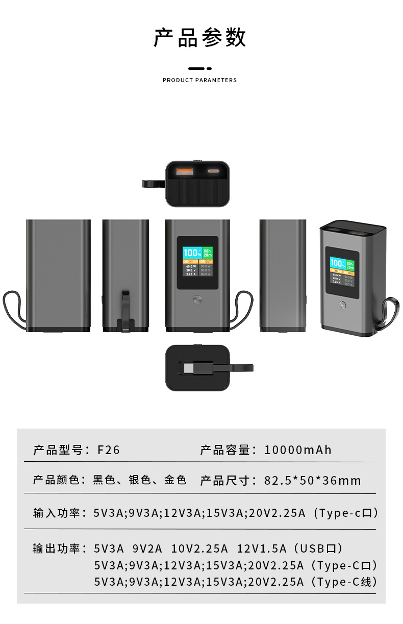 输 出output3: 5V=3A 9V=3A 12V=3A 15V=3A 20V=2.25A ( USB-C cable/PD45W )
