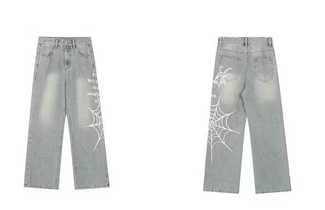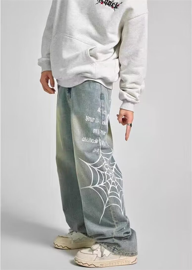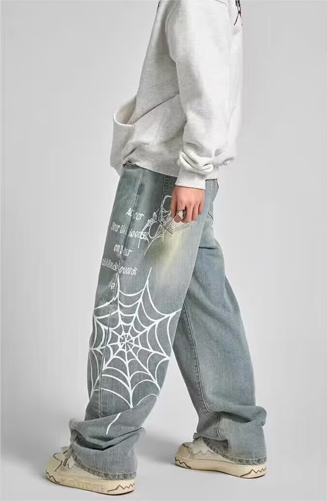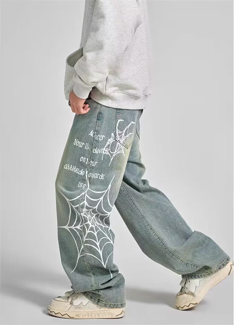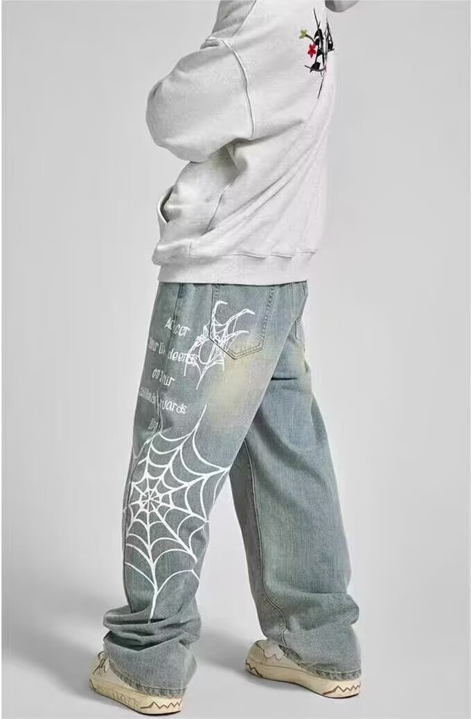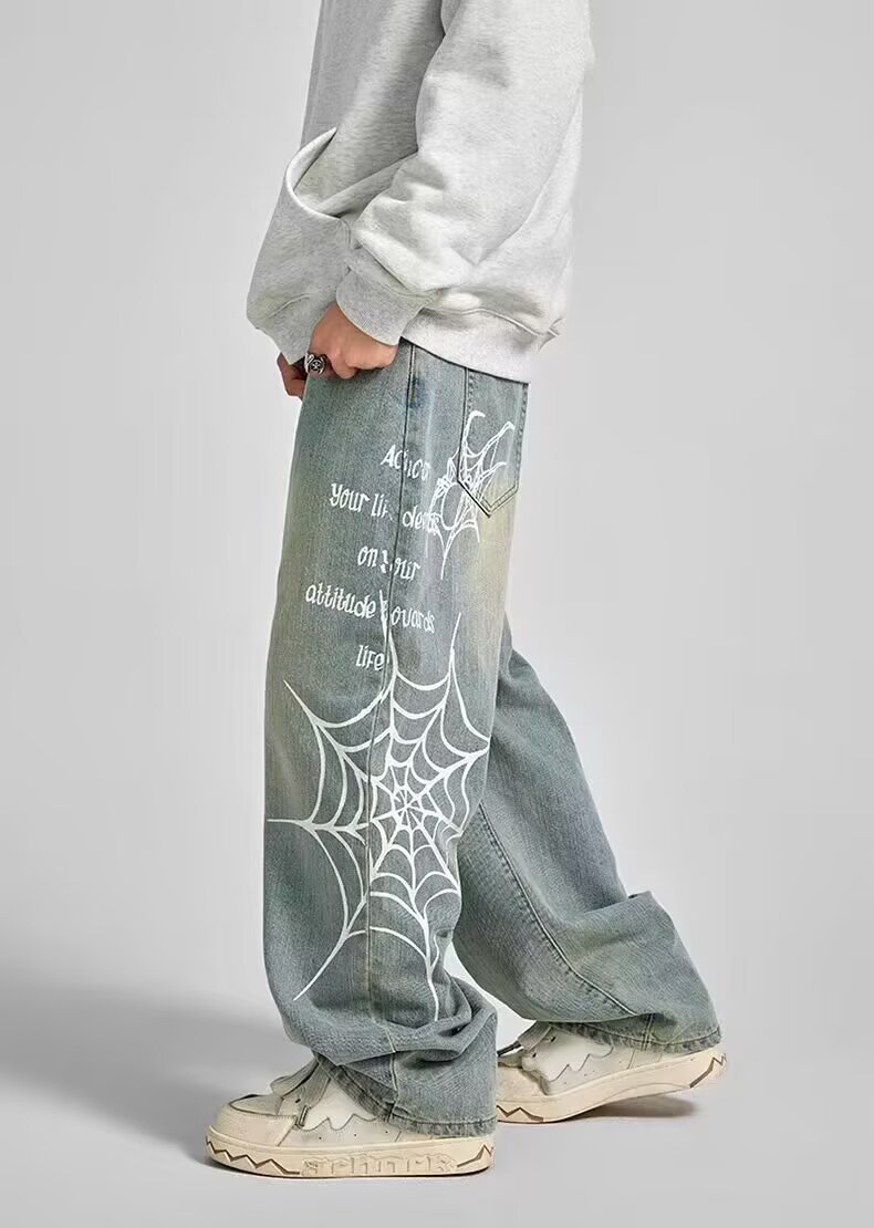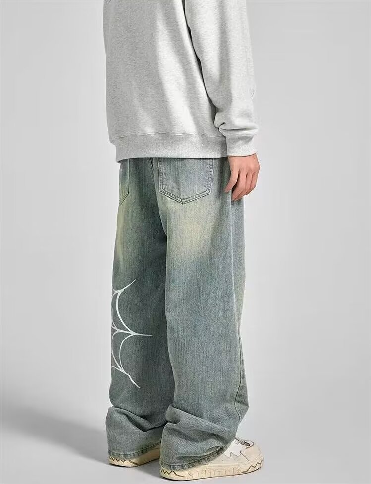 유럽과 미국의 하이 스트리트 인 패션 브랜드 개인화 된 Cobweb 인쇄 된 미국 청바지 스트레이트 레그 와이드 레그 캐주얼 바지 남성용스토어 가기