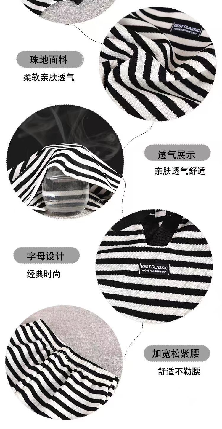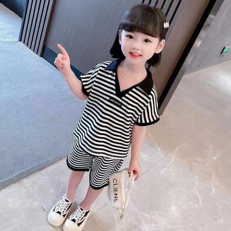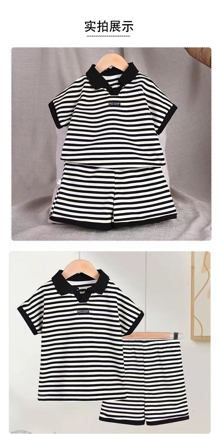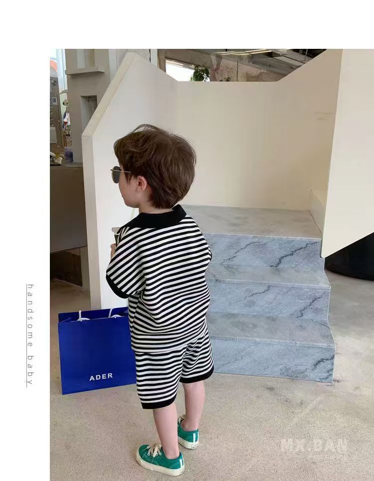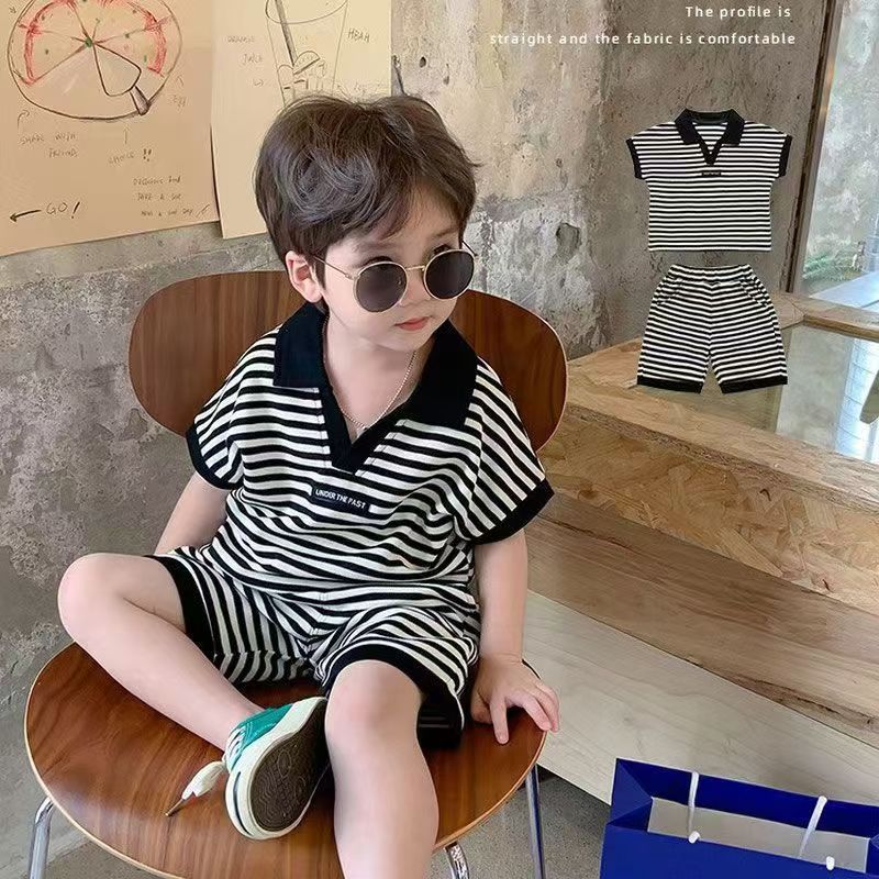 중소형 어린이 여름 대외 무역 새 소년 한국 스타일 패션 핸즈섬 캐주얼 스트라이프 V-Neck Lel 반팔 세트 트렌디