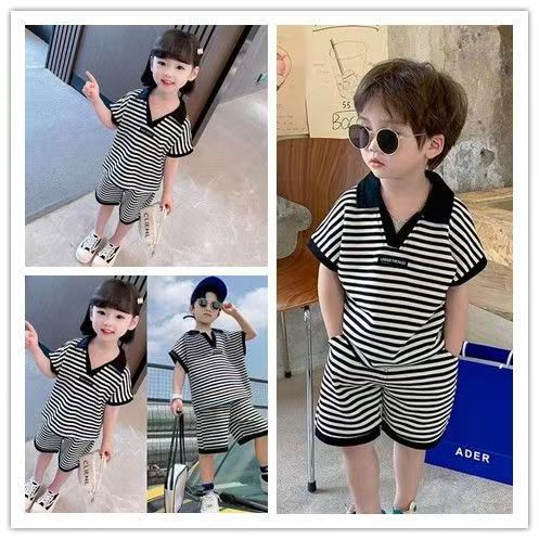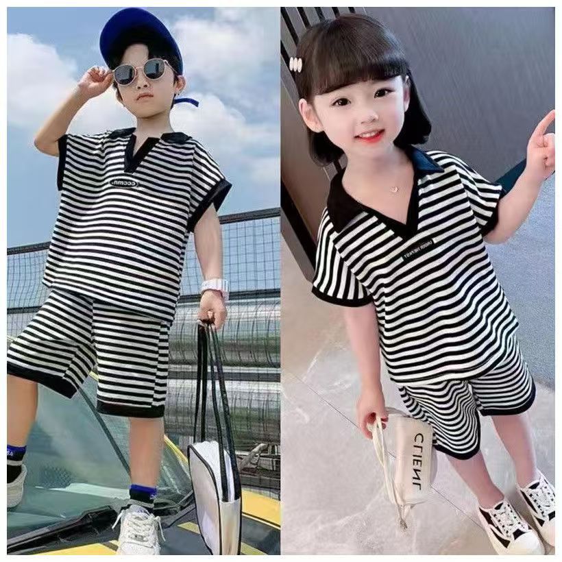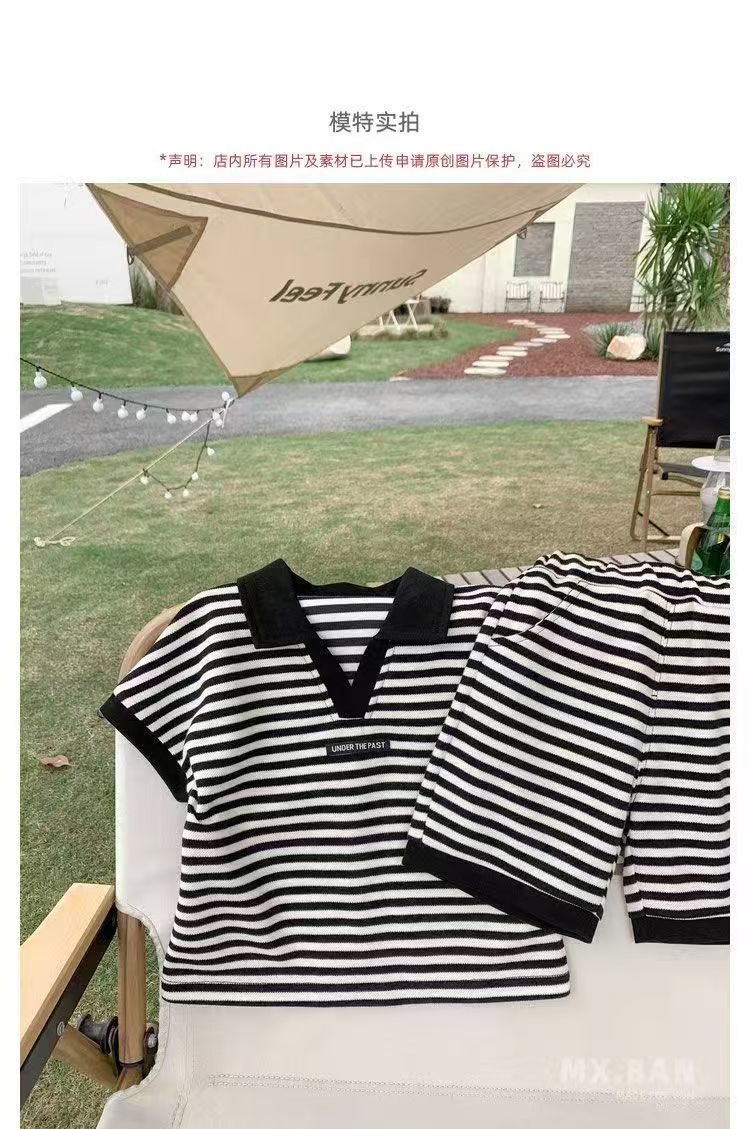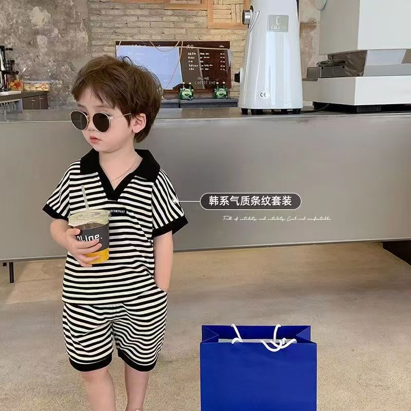 중소형 어린이 여름 대외 무역 새 소년 한국 스타일 패션 핸즈섬 캐주얼 스트라이프 V-Neck Lel 반팔 세트 트렌디스토어 가기